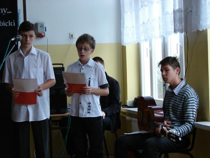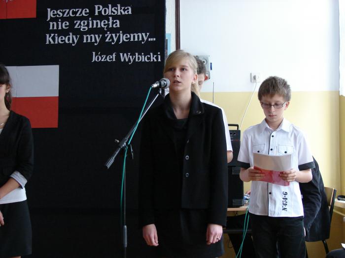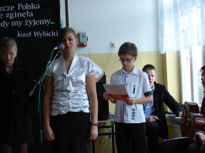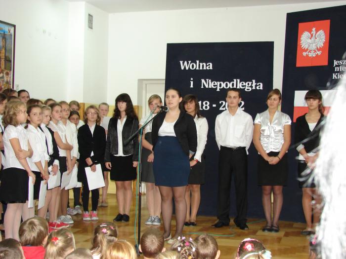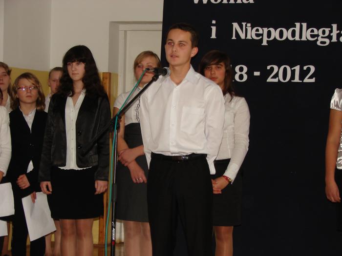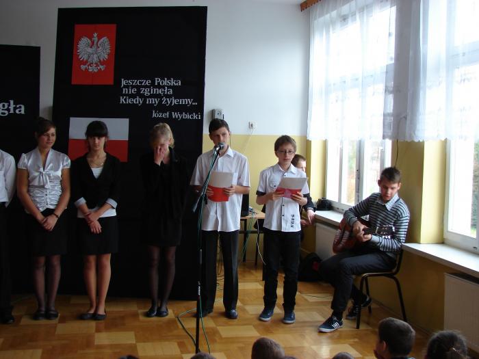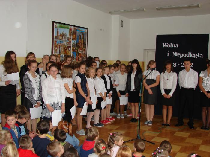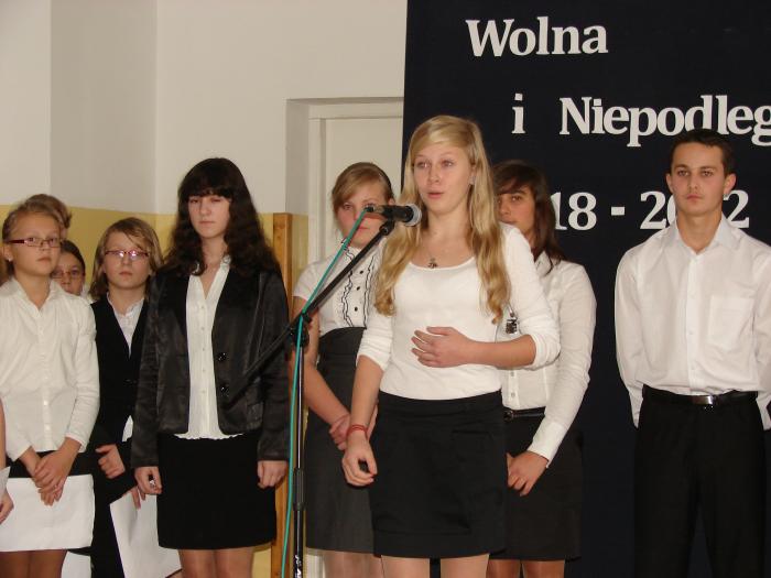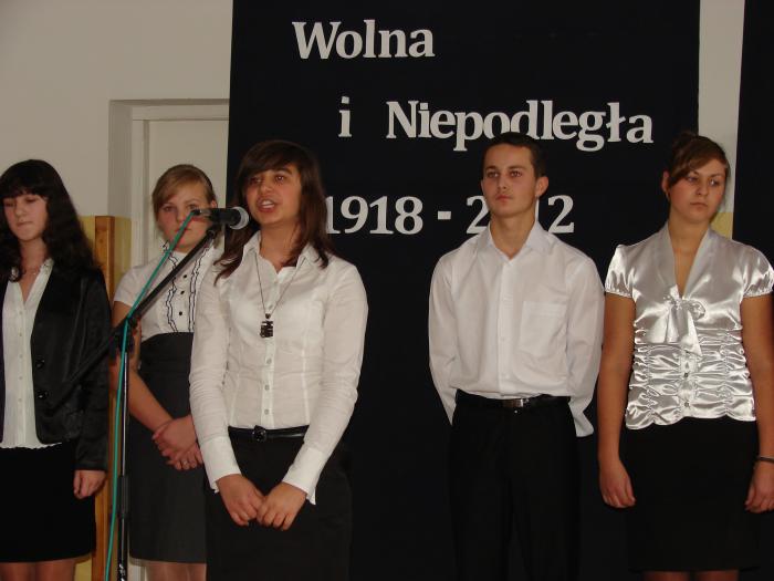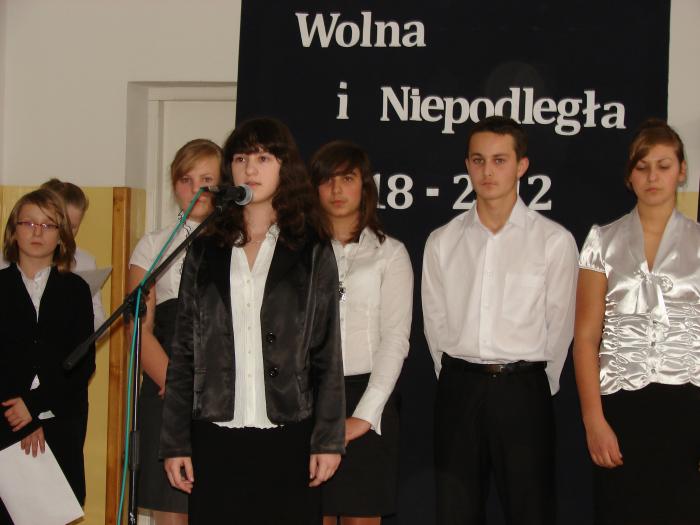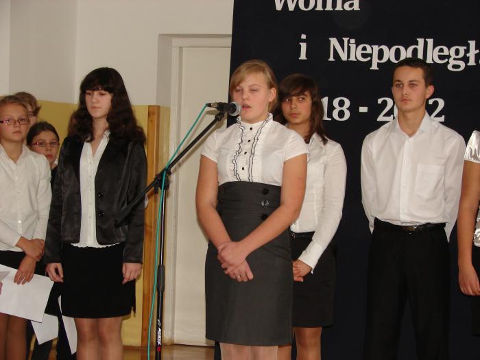 12 listopada odbyła się akademia z okazji Rocznicy Odzyskania przez Polskę Niepodległości. Uczniowie klas gimnazjum recytowali wiersze pełne refleksji nawiązujące do historii Ojczyzny, chórek śpiewał piękne piosenki, takie jak "Piechota" i "Legiony". Wszystko po to, by przypomnieć nam te ciężkie lata, gdy naszego kraju nie było na mapach Europy, kiedy Polacy walczyli i ginęli w walce o niepodległość. Uroczystość przypomniała nam, że dzisiejsza Polska - wolna i niepodległa wyrosła z krwi naszych praojców.