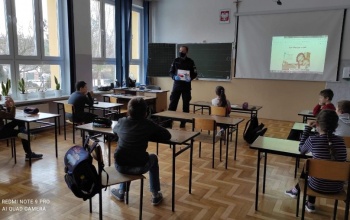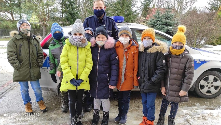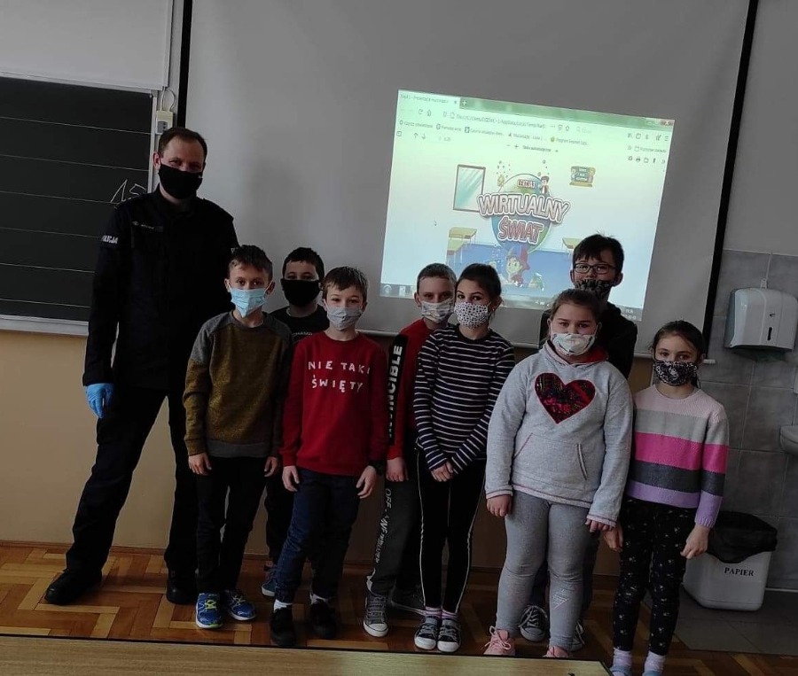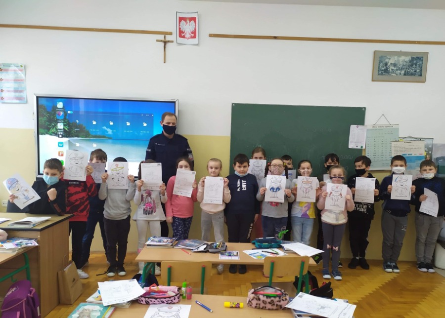 3 lutego 2021 roku, klasy 0-3 gościły w szkole Pana policjanta. Tematem spotkania było bezpieczeństwo w sieci oraz bezpieczeństwo podczas zimowych aktywności.