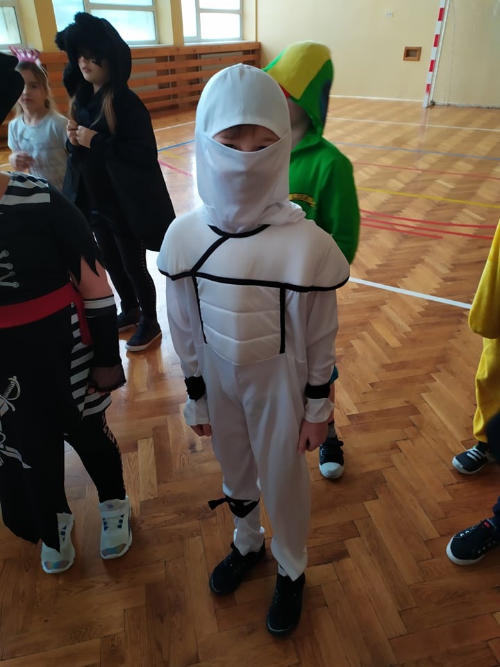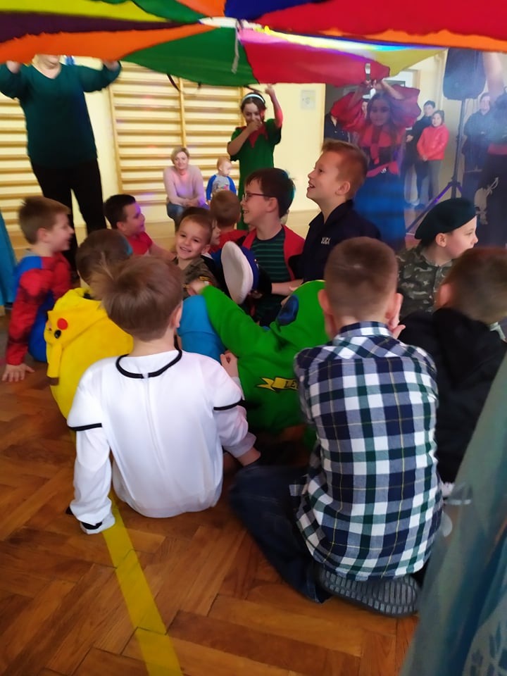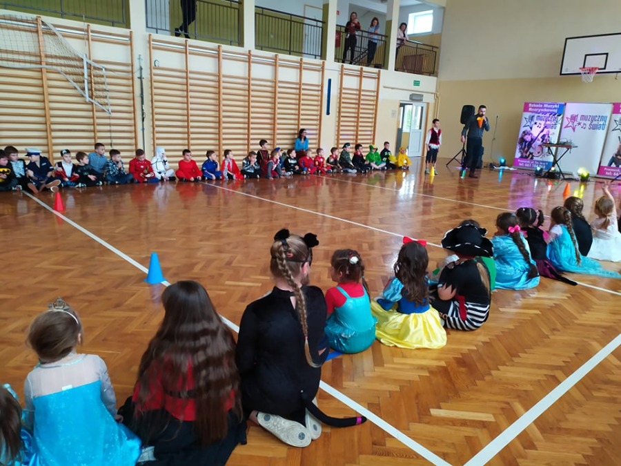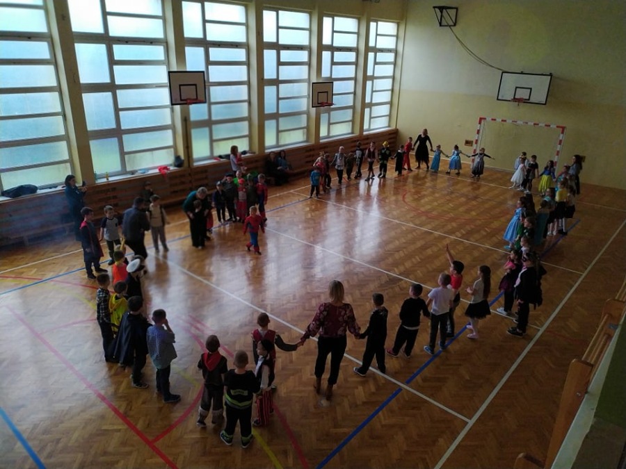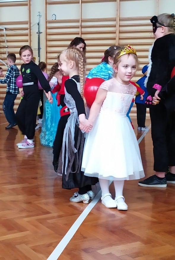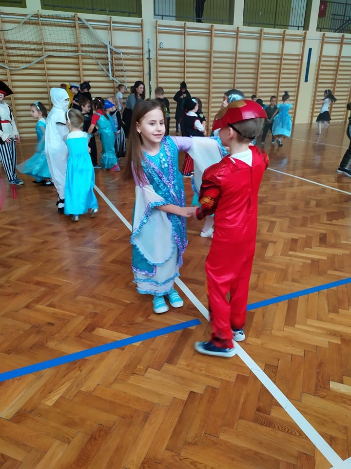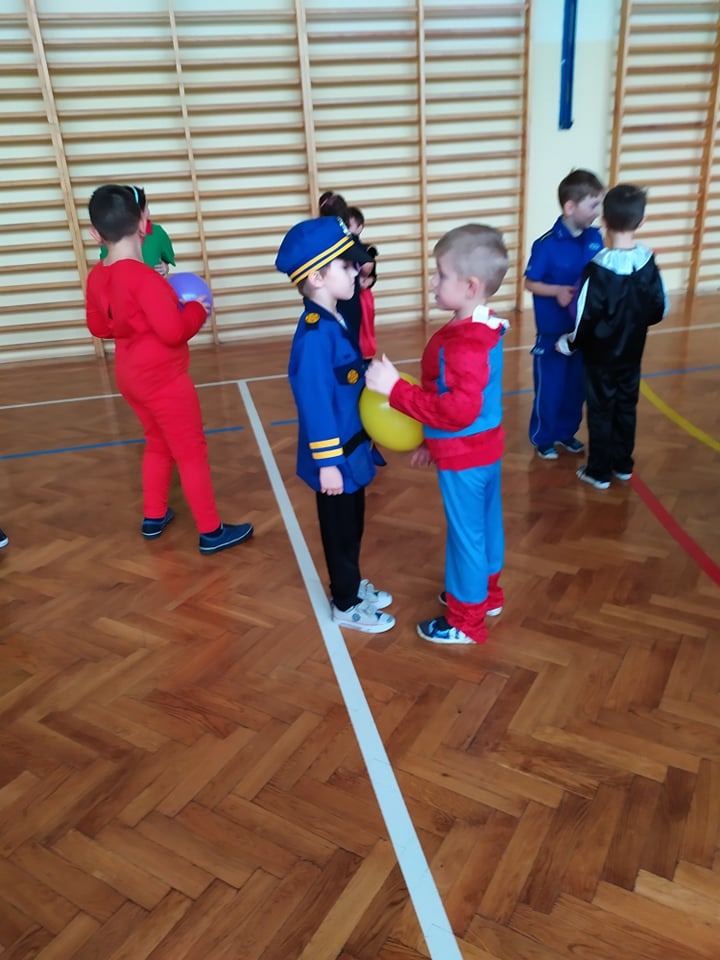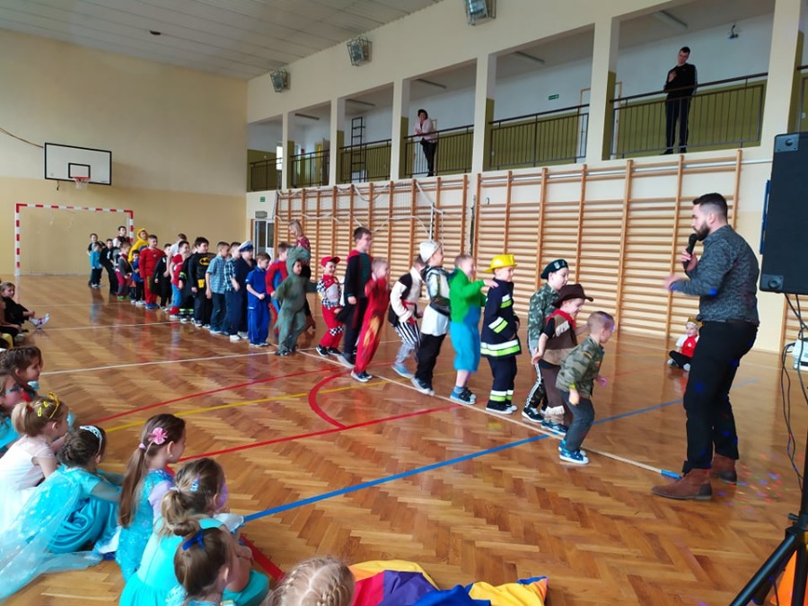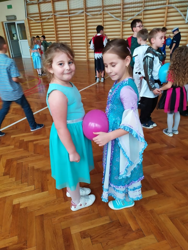 Ten dzień był pełen wrażeń i radości. Sala gimnastyczna przepełniła się pięknymi księżniczkami, kowbojami, zwierzątkami oraz innymi wspaniałymi postaciami i bohaterami z bajek. Wszyscy bawili się znakomicie oraz chętnie uczestniczyli w różnych konkurencjach i zabawach muzyczno-ruchowych.