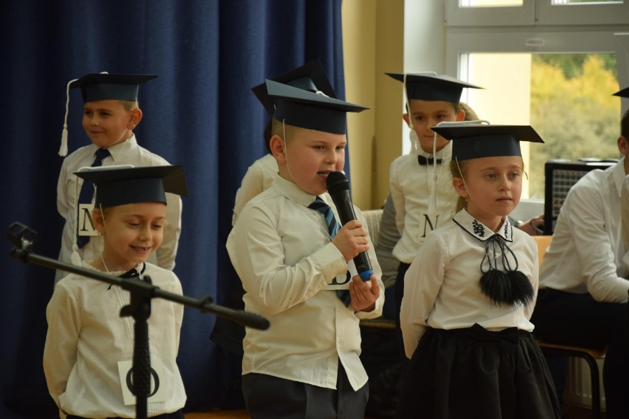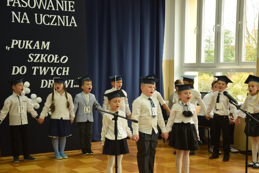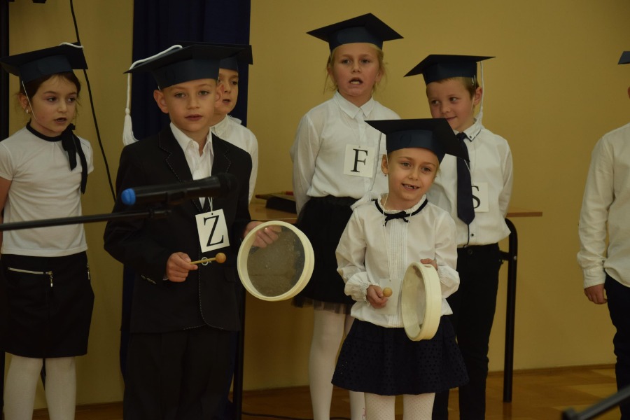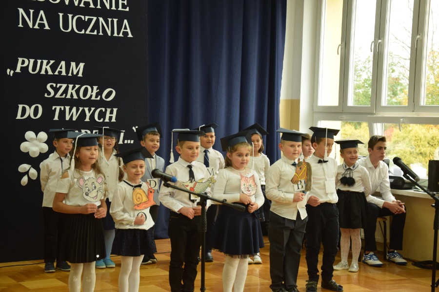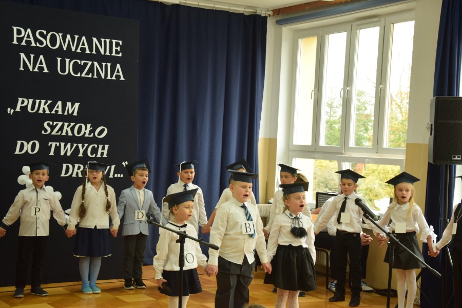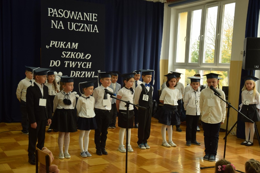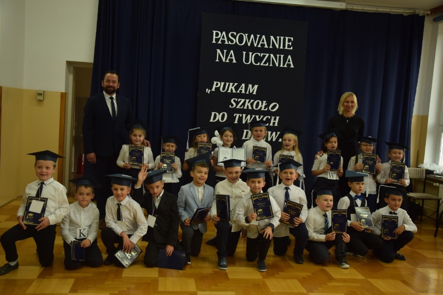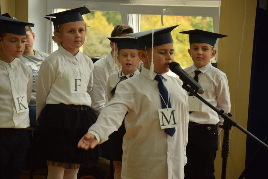 Przedstawili część artystyczną, podczas której wcielali się w role, śpiewali piękne piosenki, recytowali wiersze. Po występie przedstawiciele SU wraz z Panem Dyrektorem złożyli przyjętym do społeczności szkolnej uczniom życzenia samych dobrych ocen za ich pracę, radości, szczęścia i samych dobrych chwil w życiu szkolnym. Następnie odbyło się rozdanie dyplomów i oficjalne pasowanie na ucznia przez Pana Dyrektora, tradycyjnie wielkim, czerwonym ołówkiem.