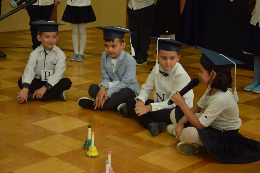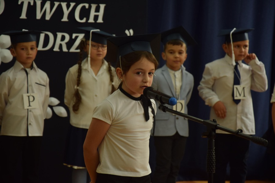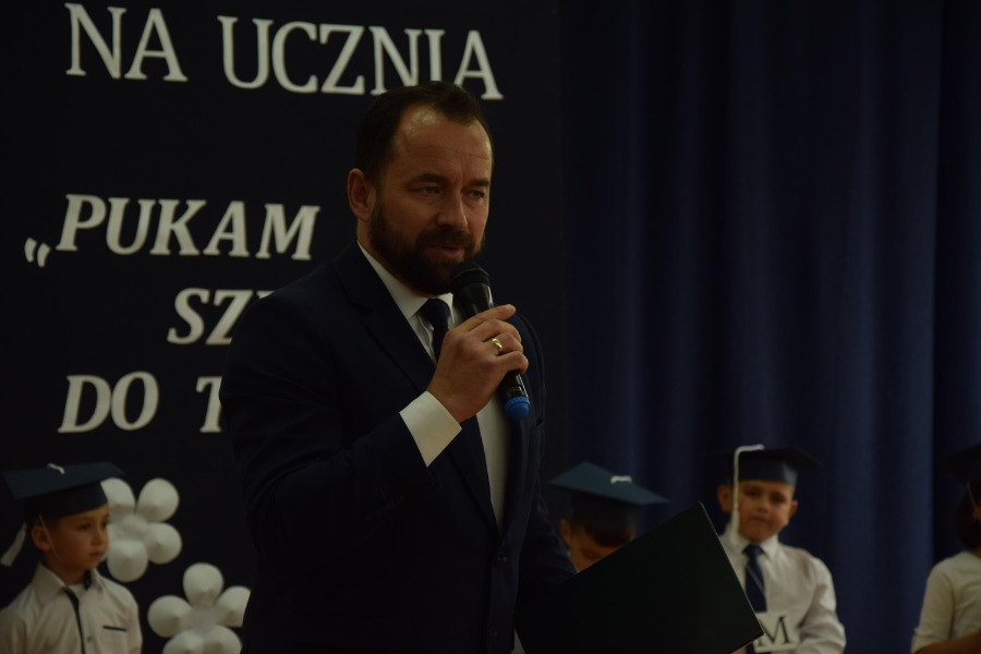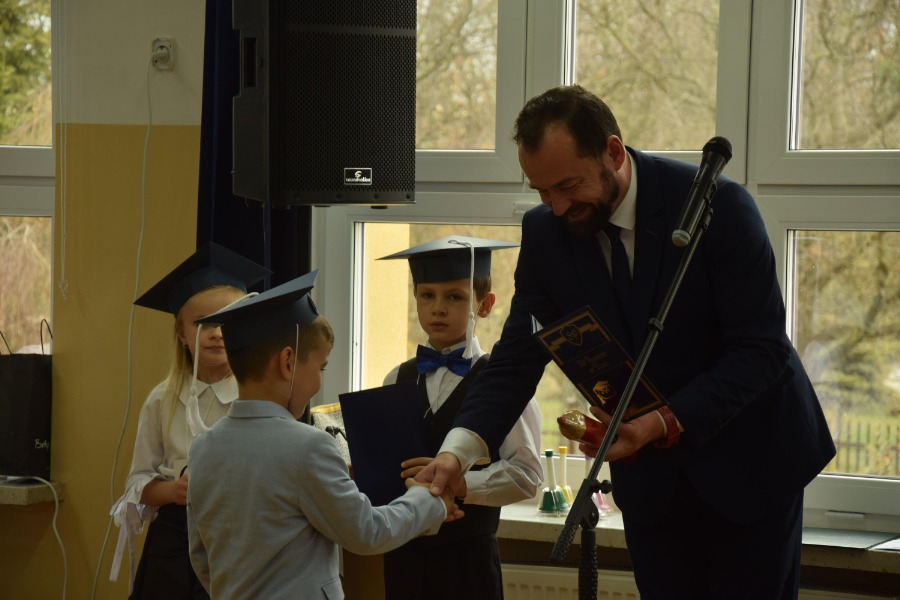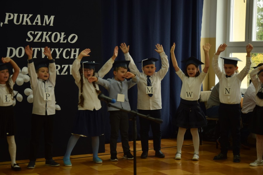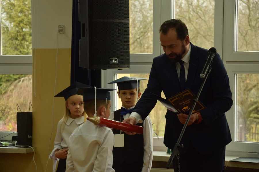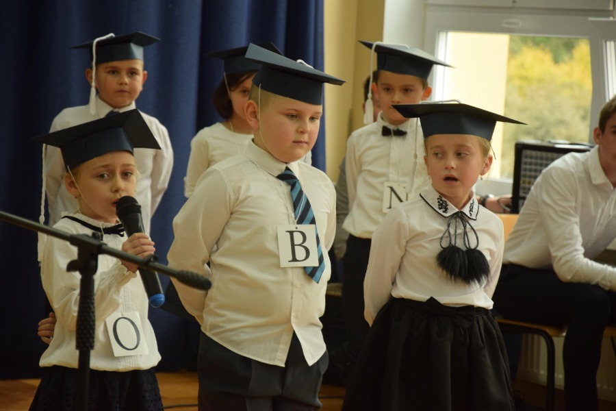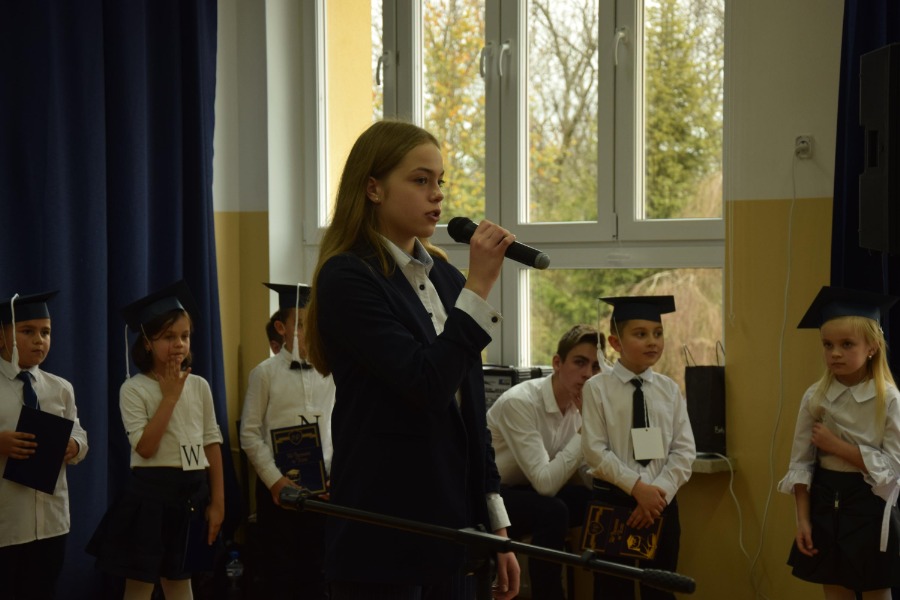 Przedstawili część artystyczną, podczas której wcielali się w role, śpiewali piękne piosenki, recytowali wiersze. Po występie przedstawiciele SU wraz z Panem Dyrektorem złożyli przyjętym do społeczności szkolnej uczniom życzenia samych dobrych ocen za ich pracę, radości, szczęścia i samych dobrych chwil w życiu szkolnym. Następnie odbyło się rozdanie dyplomów i oficjalne pasowanie na ucznia przez Pana Dyrektora, tradycyjnie wielkim, czerwonym ołówkiem.