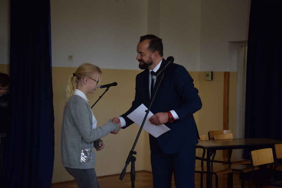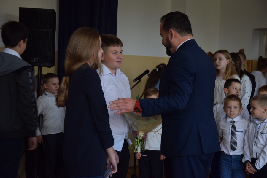 Starsi uczniowie w komediowy sposób zorganizowali przebieg codziennych lekcji, zachowania uczniów jak i nauczycieli. Młodsi zaś śpiewali piosenki oraz recytowali piękne wiersze. Po części artystycznej nadszedł moment złożenia życzeń i podziękowań wszystkim pracownikom naszej szkoły. Następnie Pan Dyrektor również podziękował pracownikom za ich trud, cierpliwość i poświęcenie, wręczył nagrody i złożył życzenia: zdrowia, radości i sukcesów na polu edukacyjnym i wychowawczym oraz w życiu osobistym.