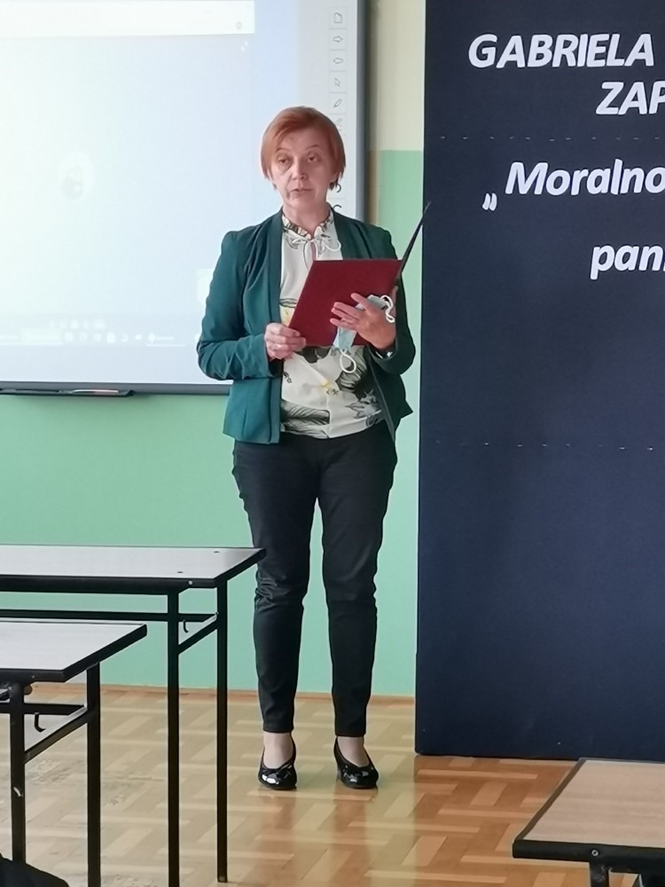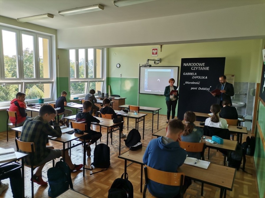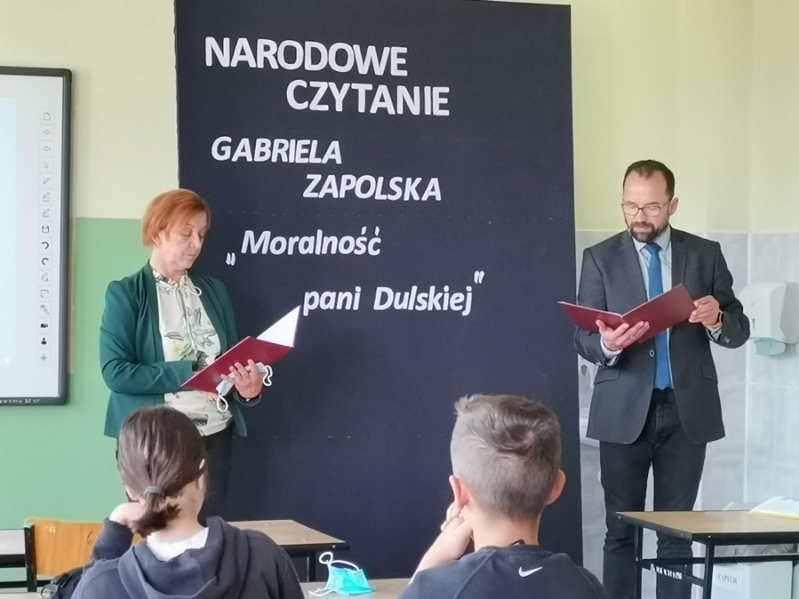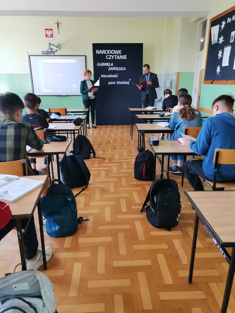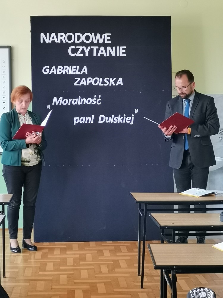 Pan Dyrektor wraz z Panią Martą Całka zaprezentowali najstarszym klasom „Moralność pani Dulskiej” Gabrieli Zapolskiej. – „To utwór, który piętnuje obłudę i zakłamanie. Odnajdujemy w nim komizm i gorzką ironię, świetnie odmalowanie postaci i wyczucie języka, ale przede wszystkim uniwersalne przesłanie moralne, które w imię uczciwości i sprawiedliwości każe potępiać zło” – jak napisał Pan Prezydent w przesłaniu zachęcającym do współtworzenia akcji.