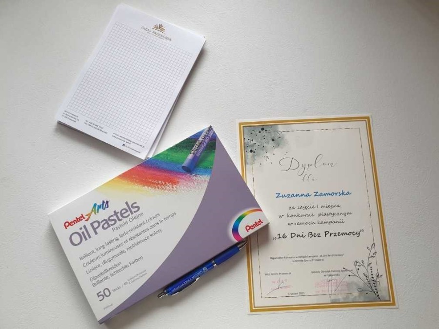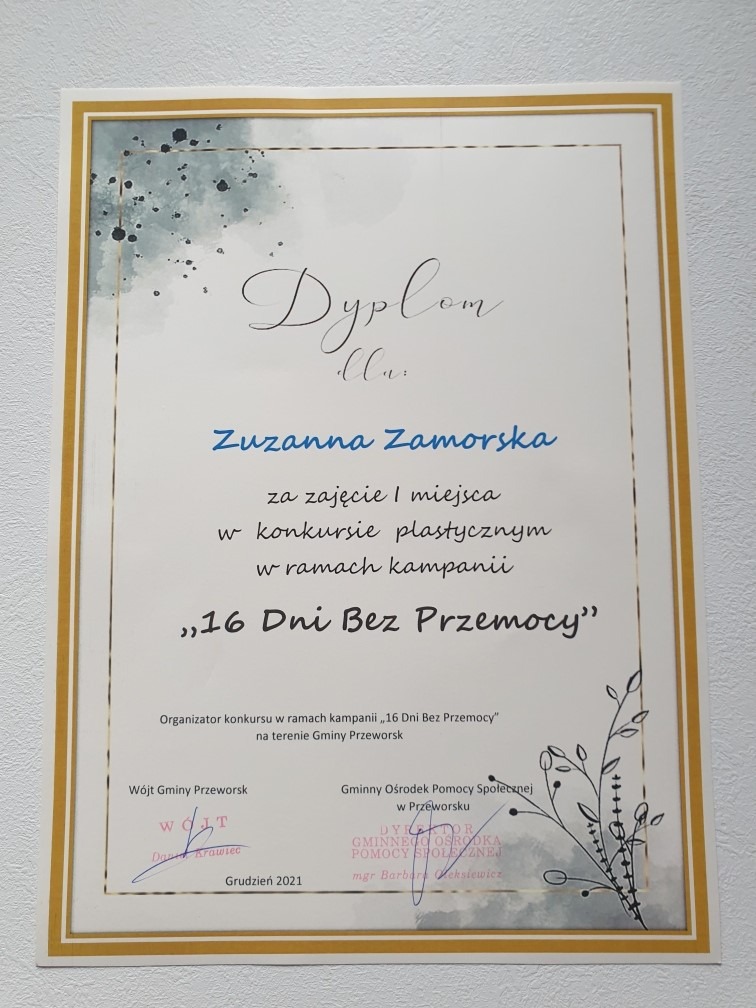 Miło nam poinformować, że uczennica klasy VII b Zuzanna Zamorska zdobyła I miejsce w kategorii uczniów klas IV – VIII w konkursie plastycznym organizowanym w ramach kampanii „16 Dni Bez Przemocy”. To wspaniała inicjatywa, która porusza ważny temat, skłania do refleksji oraz uczy empatii i szacunku dla drugiego człowieka. Organizatorem Konkursu był Gminy Ośrodek Pomocy Społecznej w Przeworsku.