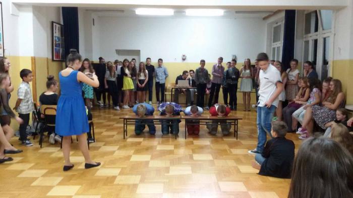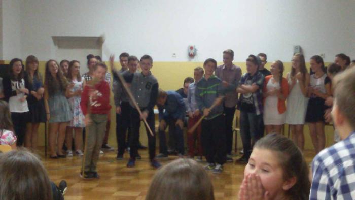 15 października odbyła się dyskoteka szkolna. Podczas niej uczniowie I gimnazjum mieli tzw. otrzęsiny. Pierwszoklasiści otrzymali od swoich starszych kolegów kilka zadań do wykonania np.: musieli wypić mleko, zatańczyć z miotłą i powtórzyć taniec z wybraną dziewczyną, a także odpowiedzieć na kilka podchwytliwych pytań. Najważniejszą częścią otrzęsin było uroczyste ślubowanie, które każdy pierwszoklasista musiał złożyć. Uczniowie bawili się świetnie, ale niestety o 21 musieliśmy zakończyć zabawę i wrócić do domu.
