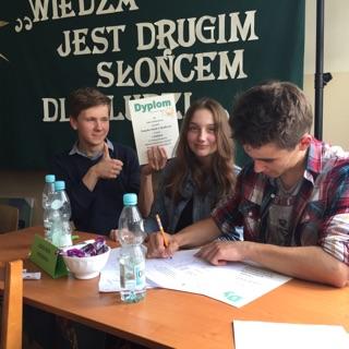 20.05.2016 r. troje uczniów naszego gimnazjum (Oliwia Oleksiewicz, Bartosz Kościelniak, Norbert Perykasza), wzięło udział w konkursie "Omnibus" organizowanym w szkole w Ujeznej. Z uśmiechem na twarzach przekroczyliśmy próg placówki, gotowi na najtrudniejsze konkurencje. Pomiędzy licznymi zadaniami, które miały różny stopień trudności, raczyli swoje podniebienia pysznymi cukierkami. Dzięki zorganizowaniu i współpracy, reprezentanci Zespołu Szkół w Rozborzu zajęli zaszczytne I miejsce, wprawiając tym samym w dumę opiekuna (pana Bogdana Stępaka) i całe grono pedagogiczne naszej szkoły.