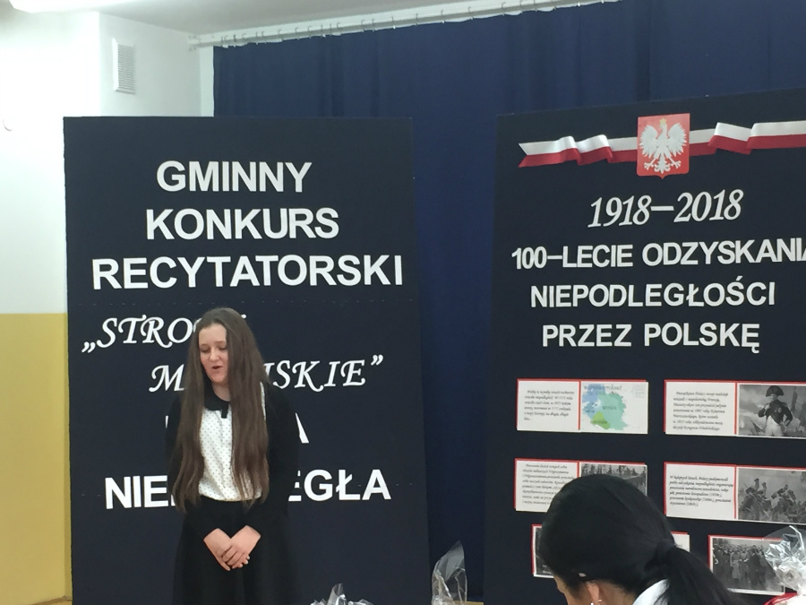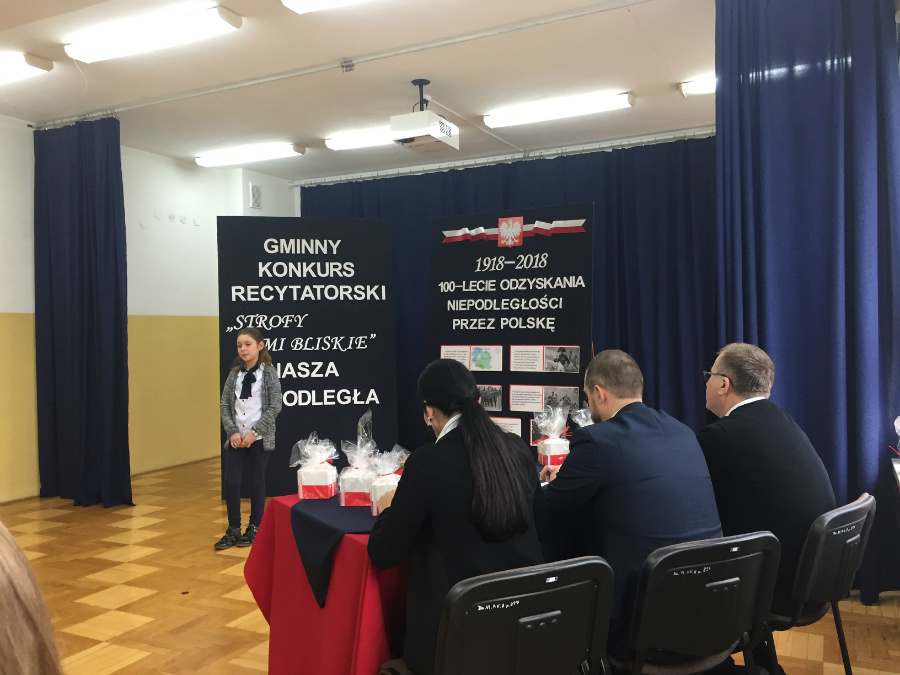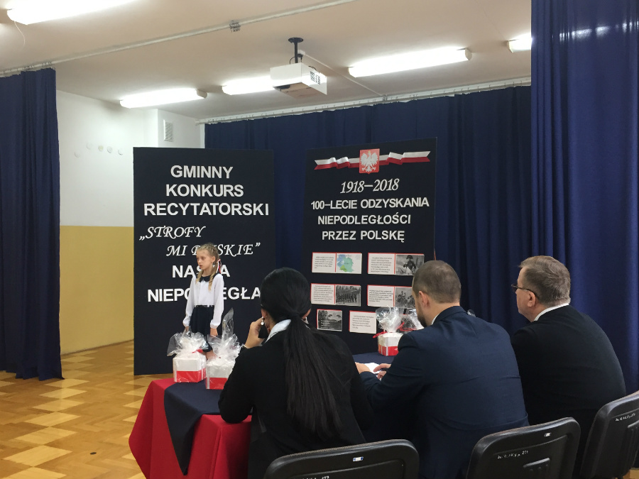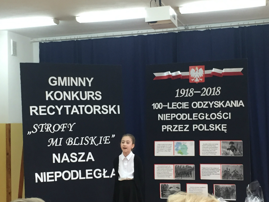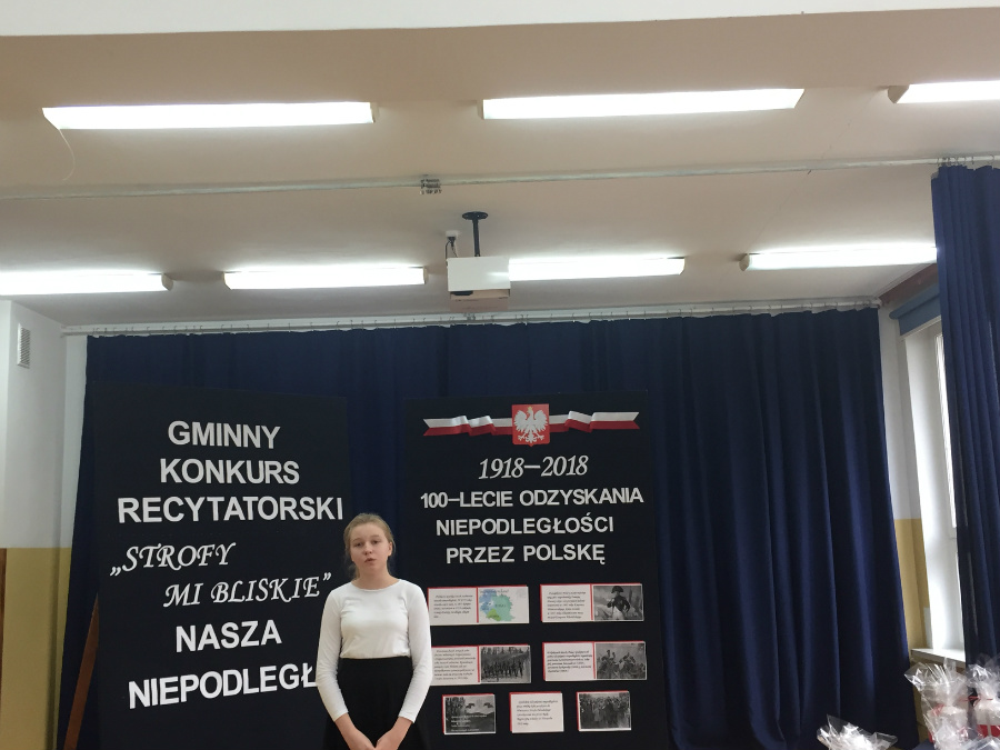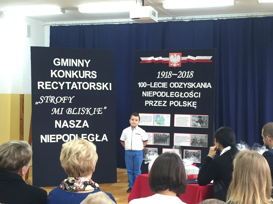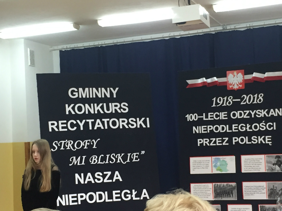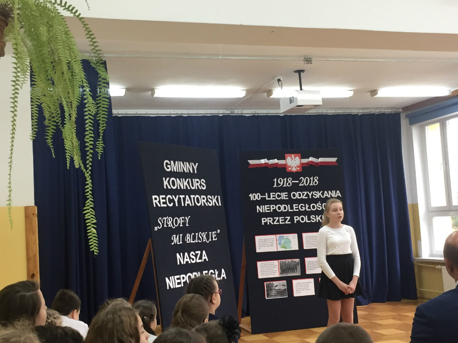 Od wielu lat w naszej szkole odbywa się konkurs recytatorski pt: „Strofy mi bliskie”. W tym roku konkurs miał rangę gminną pod hasłem ,,Nasza Niepodległa”.