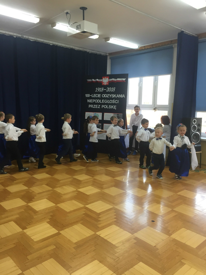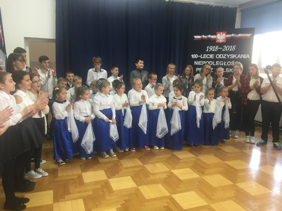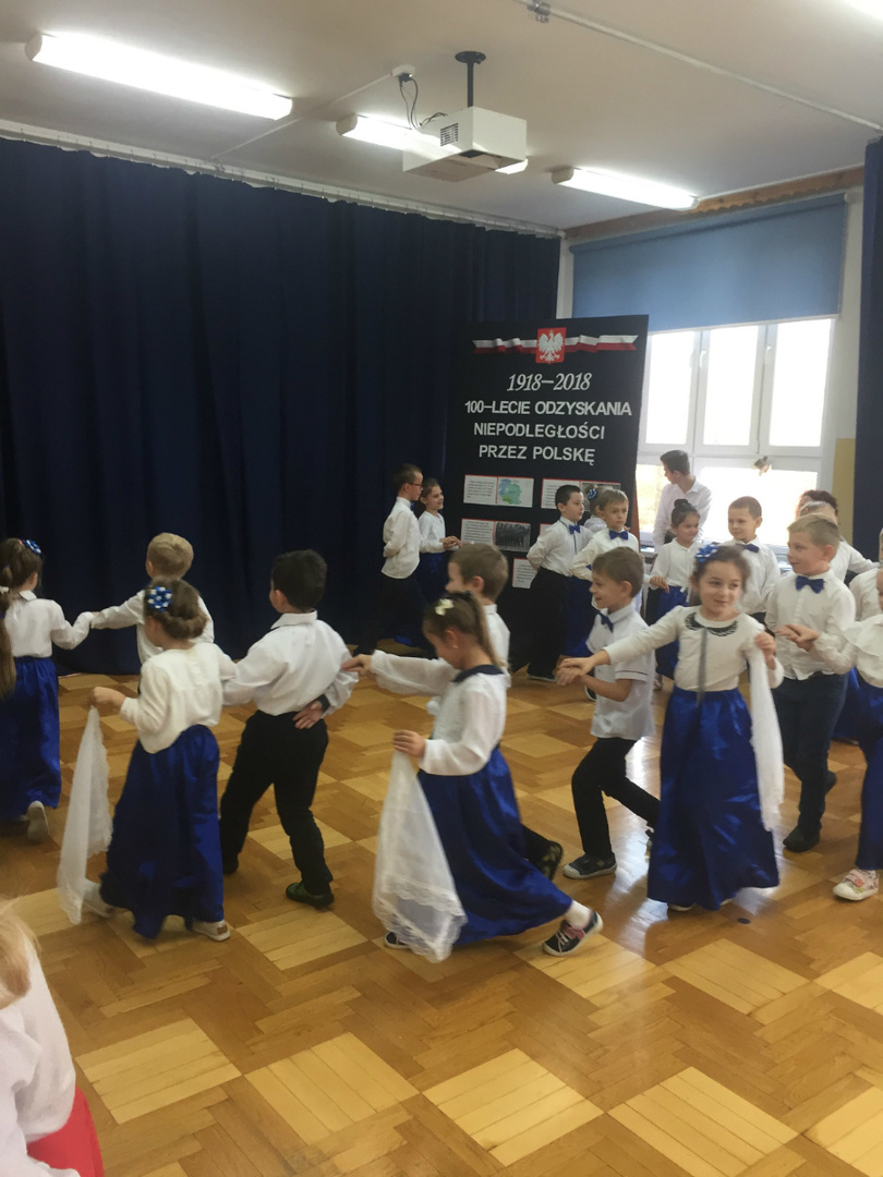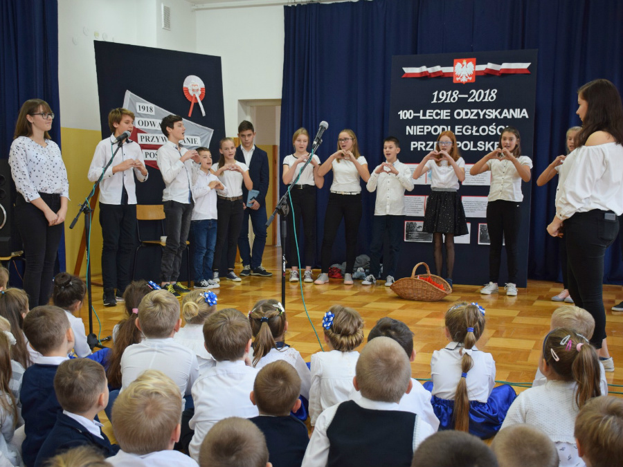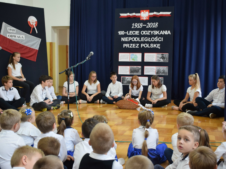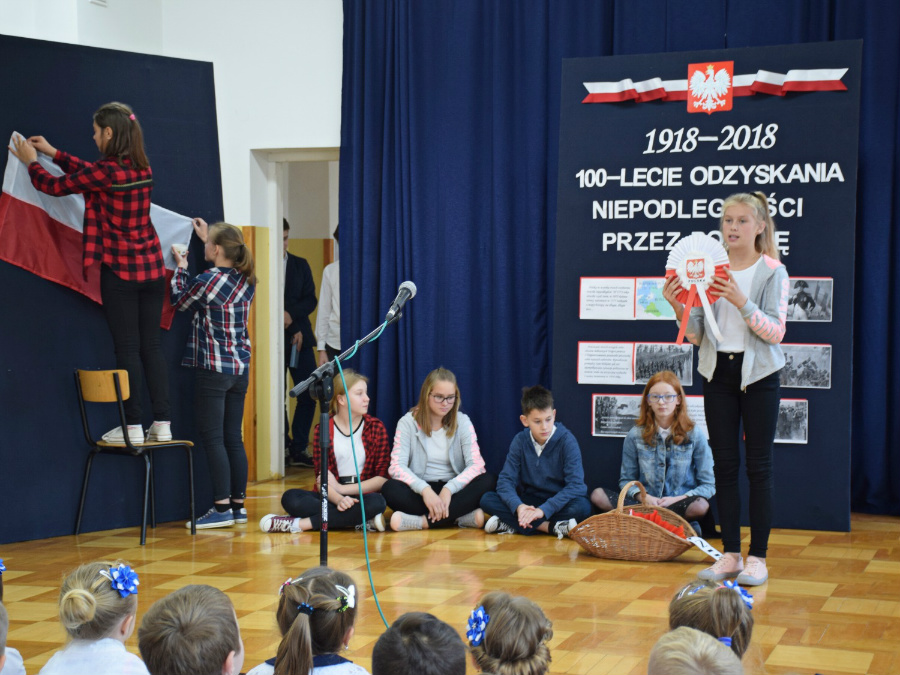 Dnia 9 listopada 2018r. w naszej szkole odbyła się akademia z okazji ,,100 Rocznicy Odzyskania Niepodległości" przez nasz ojczysty kraj. Uroczystość rozpoczęła się pokazem multimedialnym przygotowanym przez uczennice klasy III gimnazjalnej, które wygrały Szkolny Konkurs Informatyczno-historyczny zorganizowany przez p. Edytę Krukowską i p. Renatę Brud z okazji 100 -lecia odzyskania niepodległości. Prezentacja pt. "Drogi ku wolności" przybliżyła nam trudną i długą drogę Polski do odzyskania niepodległości. Część artystyczną przygotowali uczniowie klasy VI pod czujnym okiem pani Doroty Jędruszczak. Mogliśmy obejrzeć również znakomity występ przedszkolaków w którym zatańczyli dla nas i dla ojczyzny poloneza. W trakcie akademii można było usłyszeć piękne teksty o ojczyźnie oraz zaśpiewać liczne pieśni patriotyczne. Gdy przedstawienie dobiegło końca, rozeszliśmy się do klas, ale nie na długo, ponieważ o godzinie 11:11 spotkaliśmy się wszyscy ponownie, aby odśpiewać hymn państwowy.