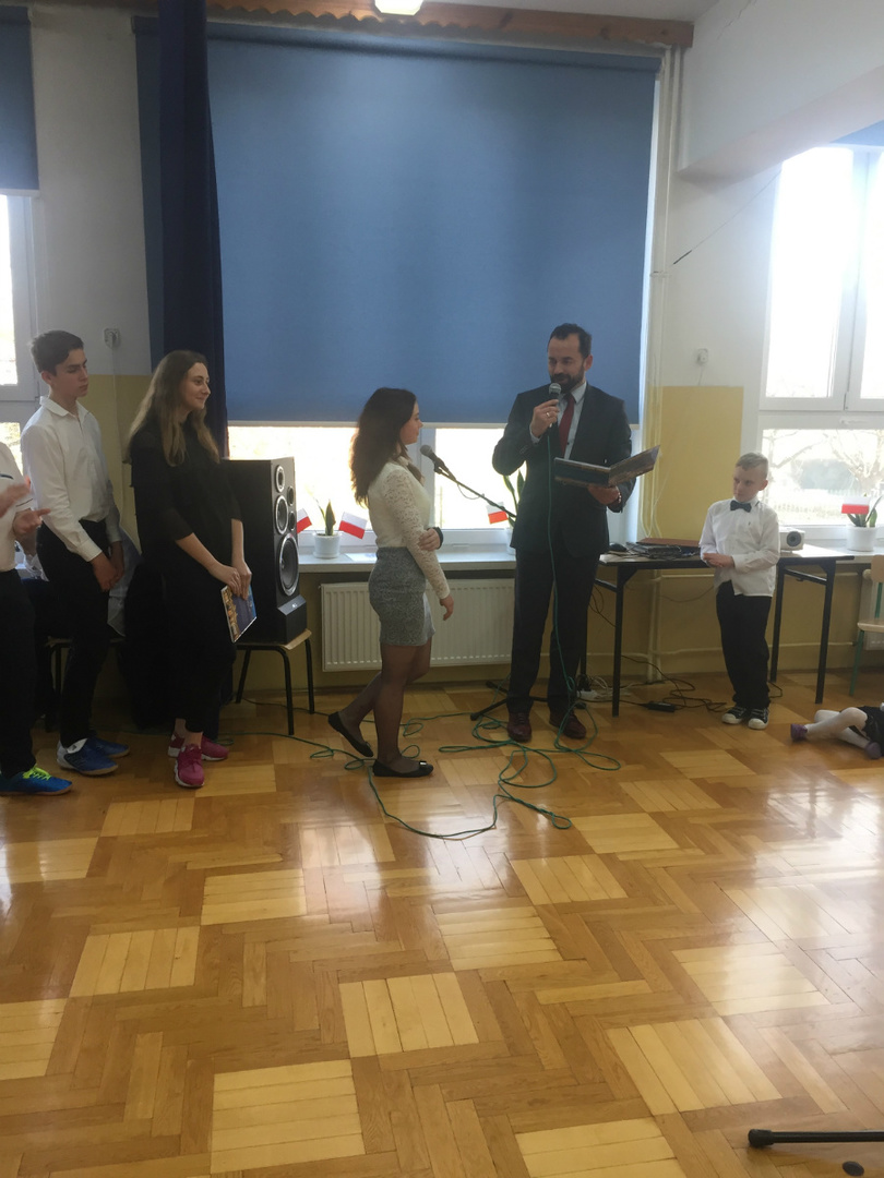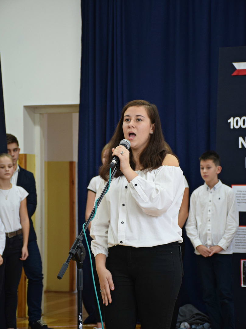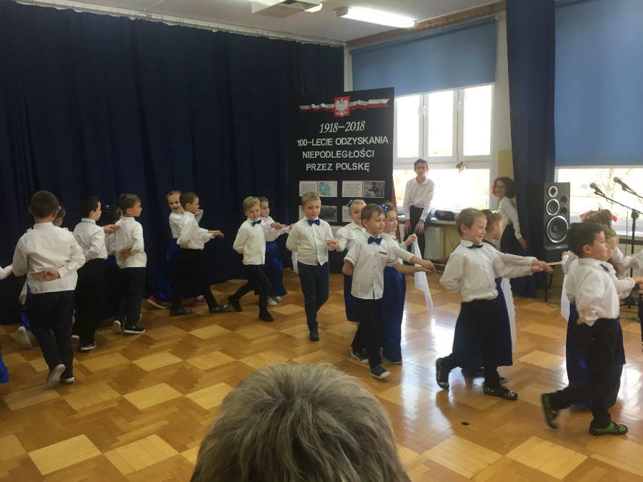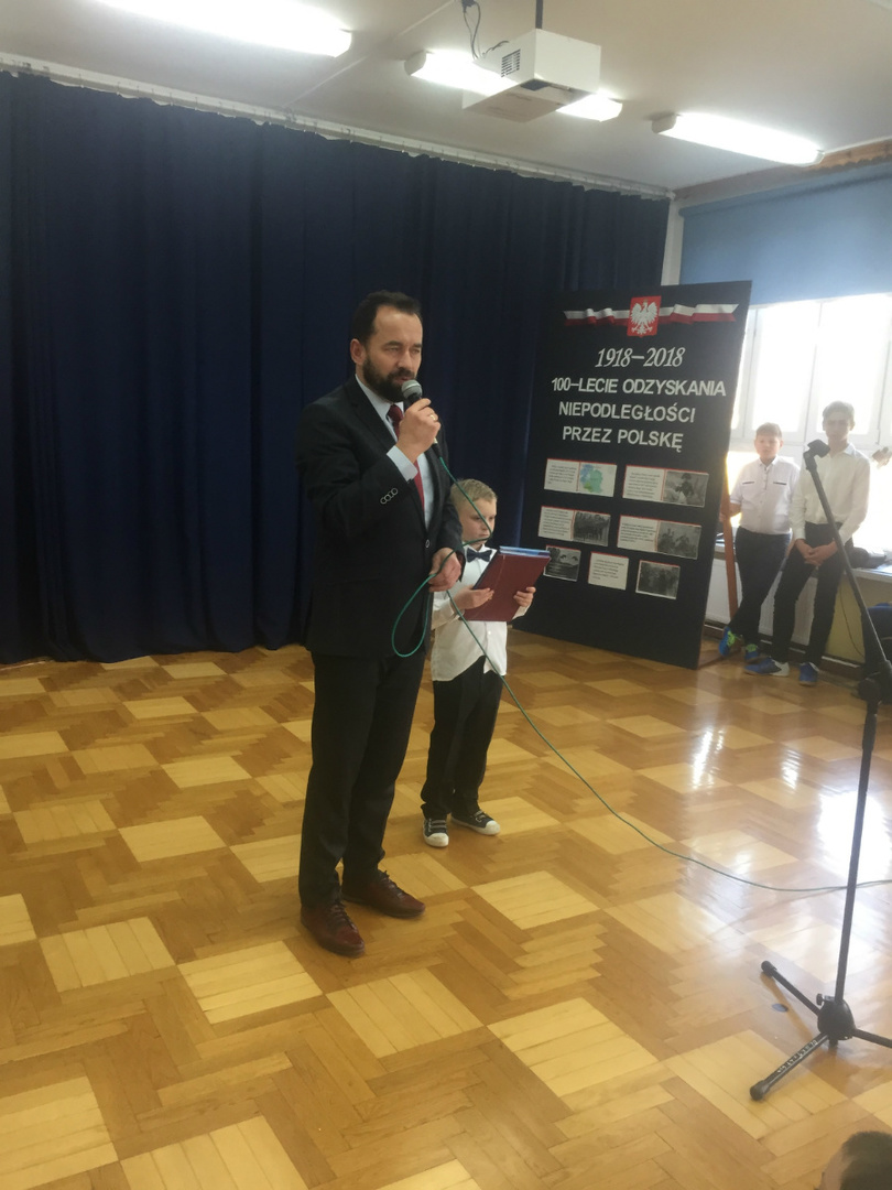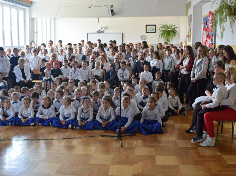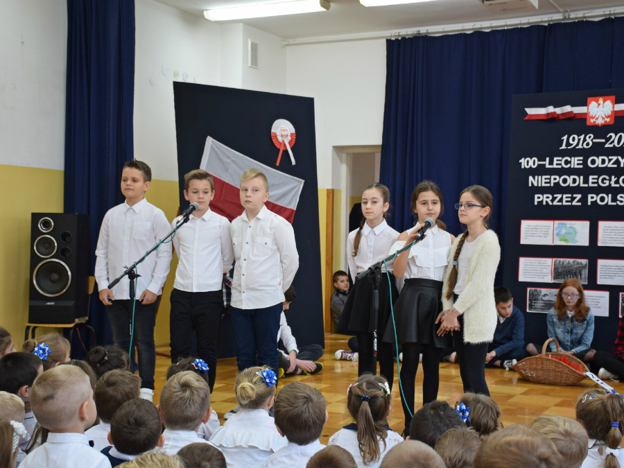 Dnia 9 listopada 2018r. w naszej szkole odbyła się akademia z okazji ,,100 Rocznicy Odzyskania Niepodległości" przez nasz ojczysty kraj. Uroczystość rozpoczęła się pokazem multimedialnym przygotowanym przez uczennice klasy III gimnazjalnej, które wygrały Szkolny Konkurs Informatyczno-historyczny zorganizowany przez p. Edytę Krukowską i p. Renatę Brud z okazji 100 -lecia odzyskania niepodległości. Prezentacja pt. "Drogi ku wolności" przybliżyła nam trudną i długą drogę Polski do odzyskania niepodległości. Część artystyczną przygotowali uczniowie klasy VI pod czujnym okiem pani Doroty Jędruszczak. Mogliśmy obejrzeć również znakomity występ przedszkolaków w którym zatańczyli dla nas i dla ojczyzny poloneza. W trakcie akademii można było usłyszeć piękne teksty o ojczyźnie oraz zaśpiewać liczne pieśni patriotyczne. Gdy przedstawienie dobiegło końca, rozeszliśmy się do klas, ale nie na długo, ponieważ o godzinie 11:11 spotkaliśmy się wszyscy ponownie, aby odśpiewać hymn państwowy.