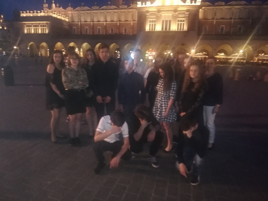 W pierwszym dniu wycieczki punktem numer jeden była wizyta w Auschwitz- Birkenau, która wstrząsnęła nawet największymi twardzielami spośród uczniów. Każdy bardzo przeżywał usłyszane historie i bardzo mocno się w nie wczuwał. Aby humor nam się trochę poprawił wychowawczyni zabrała nas do centrum Krakowa, gdzie zobaczyliśmy piękny Rynek Główny i mogliśmy zakupić pamiątki. Następnie udaliśmy się na nocleg, aby trochę odpocząć i przygotować się na wieczorną atrakcję, jaką było wyjście do teatru na sztukę ,, Szalone Nożyczki”. Przedstawione w niej sceny rozbawiły nawet największego smutasa. Po spektaklu poszliśmy na Rynek i robiliśmy sobie wspólne zdjęcia – Kraków nocą jest naprawdę uroczy. Po powrocie do hotelu zapadliśmy w „głęboki sen”.