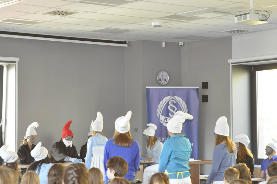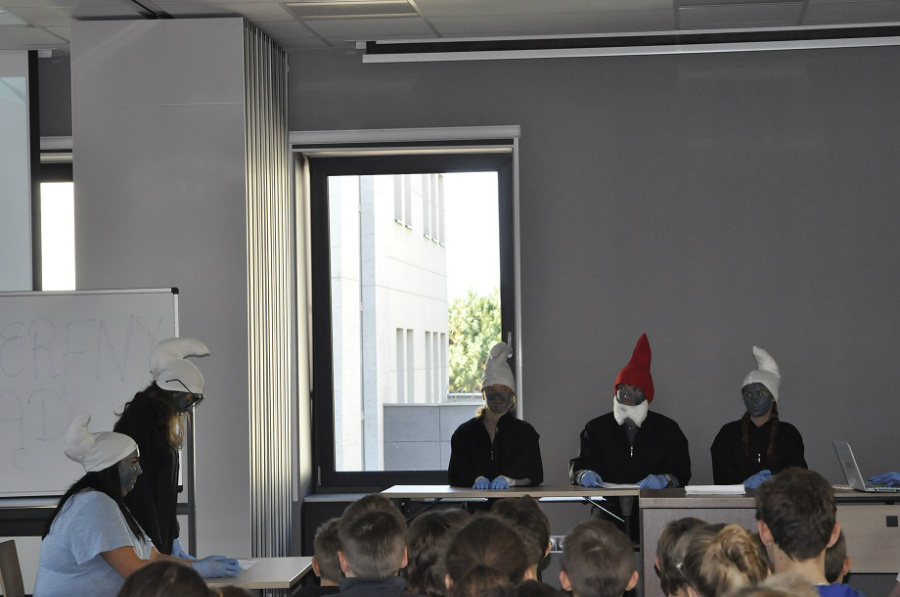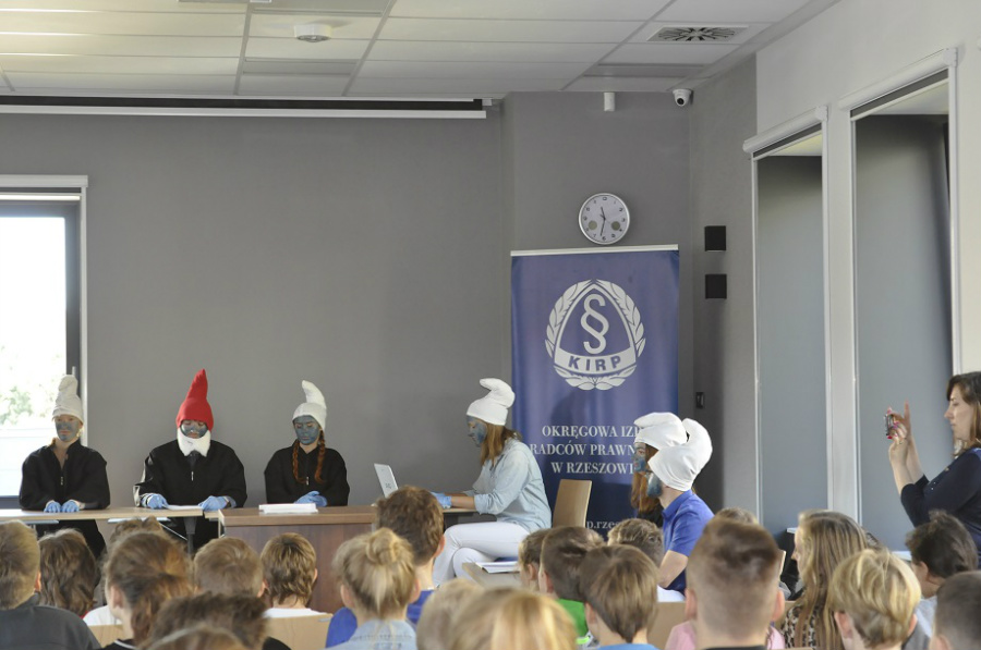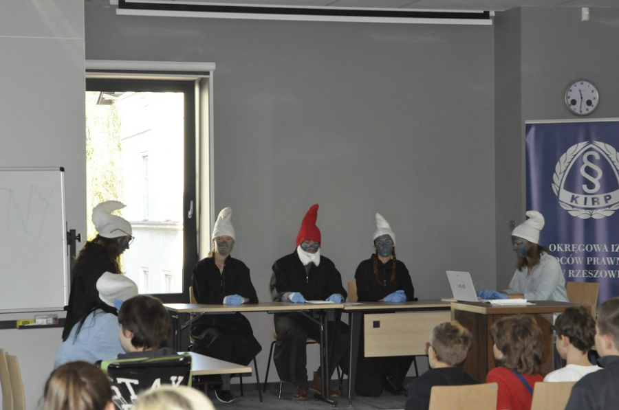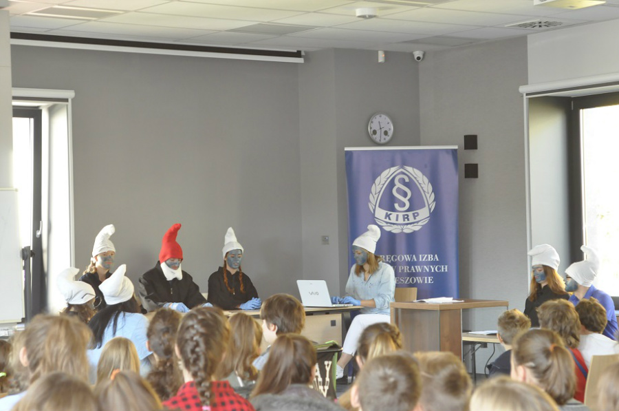 W pierwszej kolejności odbył się „wykład” na temat zawodu radcy prawnego, a następnie o mediacji, jej zasadach oraz zaletach i korzyści płynących z mediacji. Po krótkiej przerwie byliśmy widownią smerfnego sądu, a główne role odegrali studenci prawa z Wdziału Prawa i Administracji Uniwersytetu Rzeszowskiego. Na koniec mogliśmy zrobić zdjęcia ze smerfami i dzień otwarty w Okręgowej Izbie Radców Prawnych dobiegł końca.