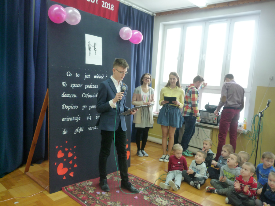 Już od rana panował u nas specyficzny, pełen uniesienia nastrój - zaobserwować można było odświętny wystrój sali, znaczną ilość czerwonych serduszek oraz inne ozdoby kojarzące się z miłością i zakochaniem.