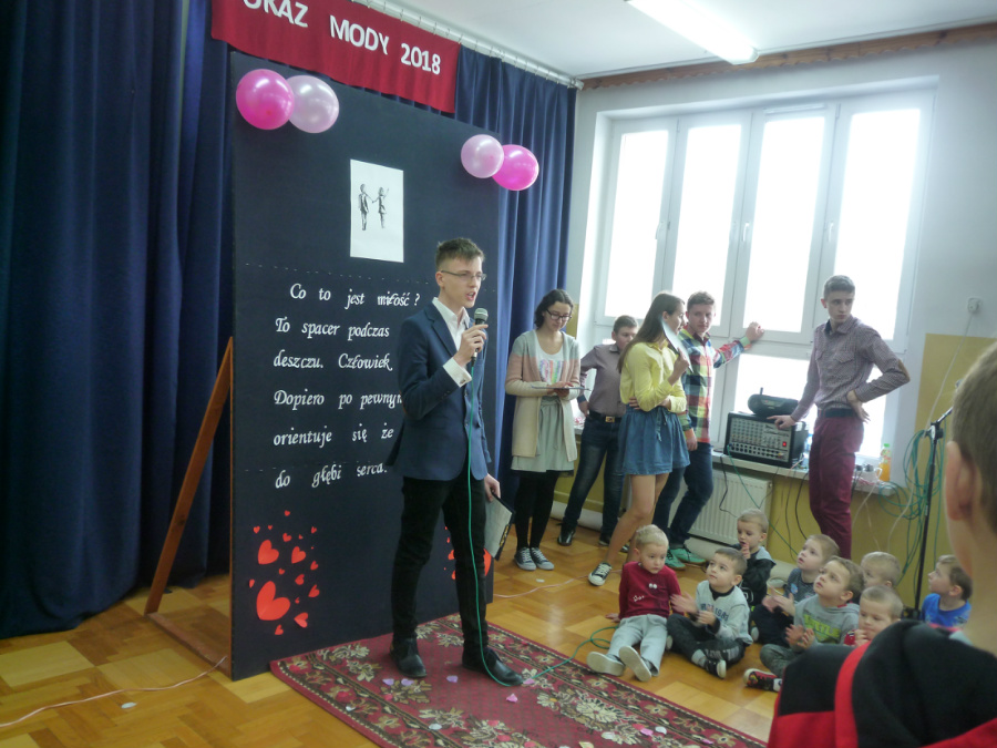 Samorząd Uczniowski zorganizował Walentynowy Pokaz Mody, podczas którego w rytmie muzyki, na czerwonym dywanie zeprezentowali się uczniowie w samodzielnie przygotowanych strojach. Modelki i modeli oceniło jury, które zadecydowało o najlepszym stroju i sposobie jego zaprezentowania. Każdy uczestnik pokazu mody otrzymał drobny upominek i słodkości.