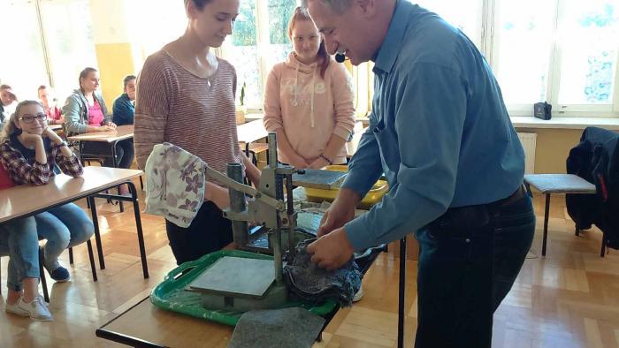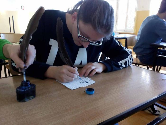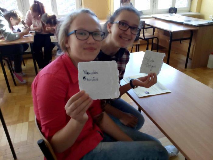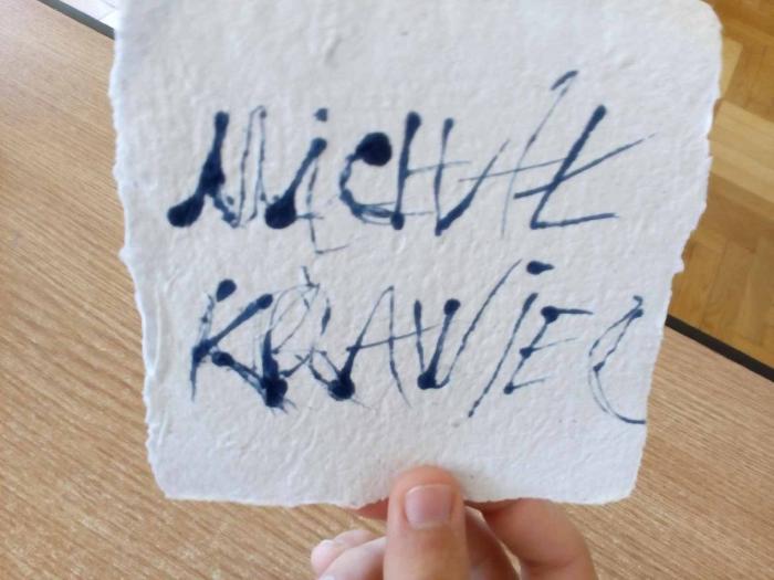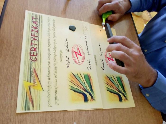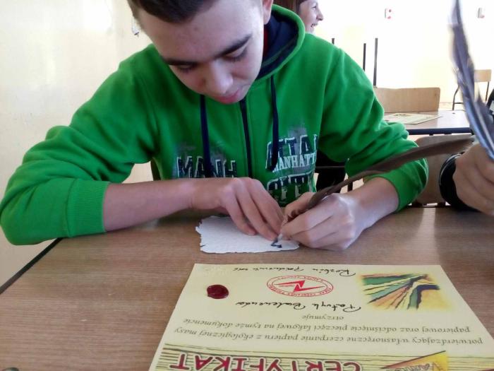 Na początku zajęć prowadzący opowiedział nam krótką historię papieru i opisał jak on powstaje. Każdy z nas mógł zrobić własną kartkę papieru koloru zielonego, którą podpisaliśmy atramentem za pomocą gęsiego pióra. Uczniowie otrzymali certyfikat udziału w warsztatach, na której samodzielnie przybili pieczęć lakową. Wykonaną przez siebie kartkę zabraliśmy do domu.