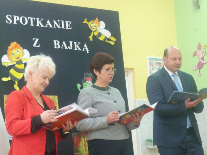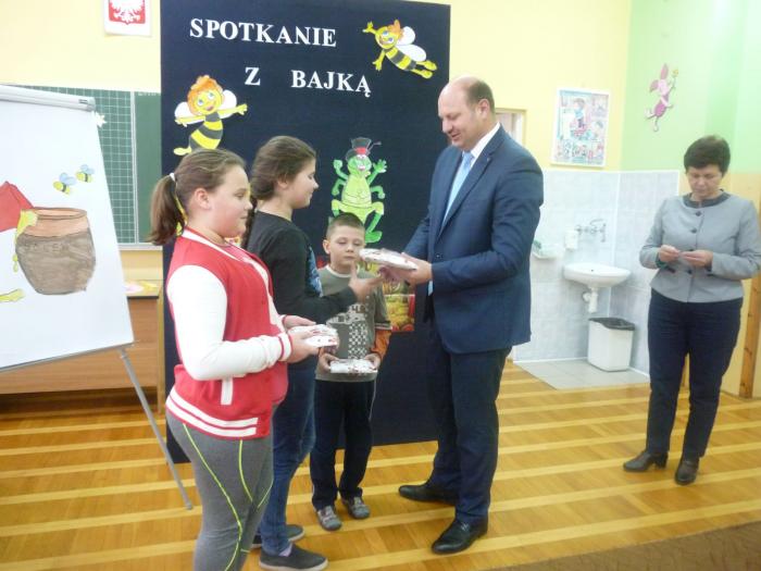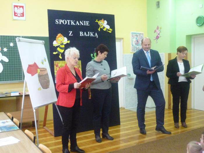 u dzieci. Aby zachęcić do czytania najmłodszych uczniów naszej szkoły 09.12.2016 r. odbyło się spotkanie z bajką. Wójt Gminy Przeworsk – pan Daniel Krawiec, pani Barbara Oleksiewicz – dyrektor GOPS, pani Dyrektor Zofia Zawadzka oraz pani Marta Całka w ciekawy sposób przeczytali kilka utworów o przygodach zwierząt. Po wysłuchaniu bajek dzieci wzięły udział w konkursie, którego zwycięzcy otrzymali piękne książeczki. Maluchy wykazały się ogromną wiedzą na temat bajkowych bohaterów. Na koniec pan Wójt wręczył dzieciom drobne upominki, po czym zafascynowane światem bajek dzieci udały się na zajęcia.