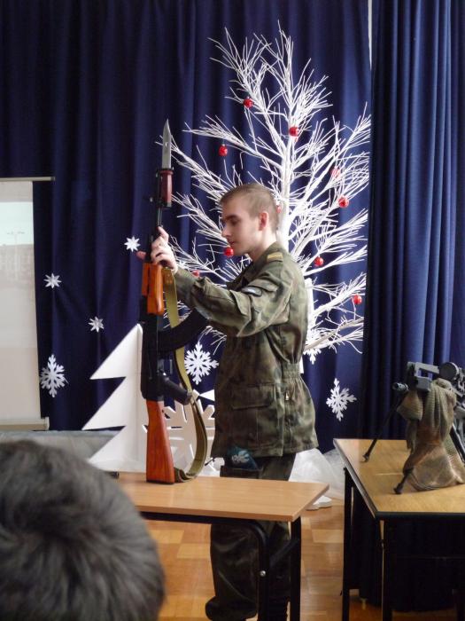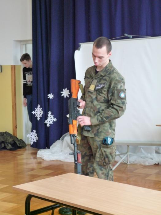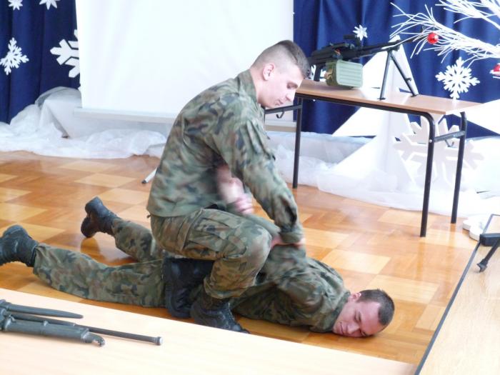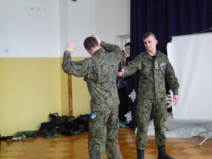 Wtorek (tj. 7 lutego 2017 r.) nie był zwykłym dniem, ponieważ odwiedzili nas absolwenci naszej szkoły - Kacper Ziara i Sebastian Wołoszyn oraz ich kolega (mistrz Europy w krav - magu), z Zespołu Szkół Zawodowych im. Króla Jana III Sobieskiego w Przeworsku. Celem ich przybycia było opowiedzenie o tym, czym zajmują się na co dzień i do czego dążą. Są oni z klasy mundurowej, dlatego przywieźli ze sobą broń, która wzbudziła niemałe zainteresowanie gimnazjalistów. Starsi koledzy opowiedzieli również o codziennym życiu i ich szkole, o uroczystych apelach, w których brali udział, marszach kontrolnych i wielu innych, ciekawych wydarzeniach. Najbardziej interesujący był jednak pokaz krav maga - kilku uniwersalnych chwytów samoobrony.