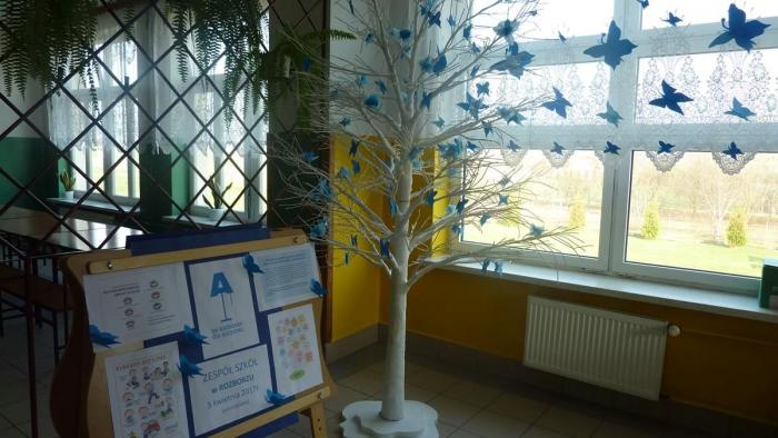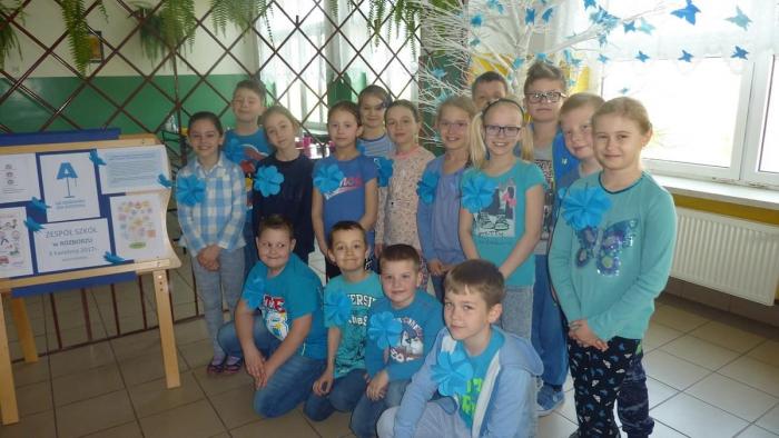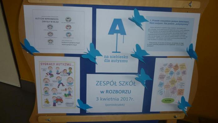 W ramach obchodzonego Światowego Dnia Świadomości Autyzmu nasza szkoła włączyła się w akcję „Na niebiesko dla autyzmu”. 3 kwietnia uczniowie z klas młodszych, gimnazjaliści oraz nauczyciele przyszli ubrani w błękitne kolory. Przygotowano piękne dekoracje, gazetki informacyjne w klasach i na korytarzach, wszędzie dominował kolor niebieski. Uczniowie uczestniczyli także w lekcjach wychowawczych poświęconych tematyce autyzmu.