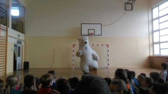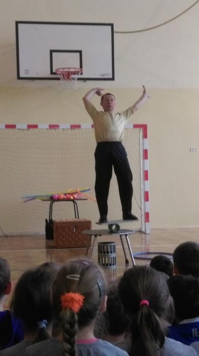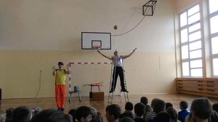 Dnia 06.04.2017 r. w naszej szkole gościła grupa cyrkowa z Ukrainy. Na początku jeden pan żonglował kuleczkami, potem wziął piłkę i umocował ją na drążku. Trzymając go raz na jednym palcu to na głowie, wszedł na drabinę i robił niesamowite rzeczy. Drugi był mimem, poprosił kilku uczniów do siebie, aby stworzyli zespół. Każdy z nich otrzymał ,,instrument": klakson, talerz, garnuszek z młoteczkiem, liczydło i łyżeczkę z tarczą. Razem zagrali utwór i wyszło im to nawet dobrze. Najciekawiej jednak było, gdy pan wyciągnął z opakowania węża. Wybrał odważnego ucznia i owinął mu szyję tym gadem. Niektórzy bali się, że wąż udusi koleżankę. Na koniec uczniowie robili pamiątkowe zdjęcja ze zwierzęciem. Można było kupić sobie pamiątki w postaci skóry węża, nosa klowna lub piłeczki. Nauczycielom jak i uczniom podobały się prezentowane magiczne sztuczki.