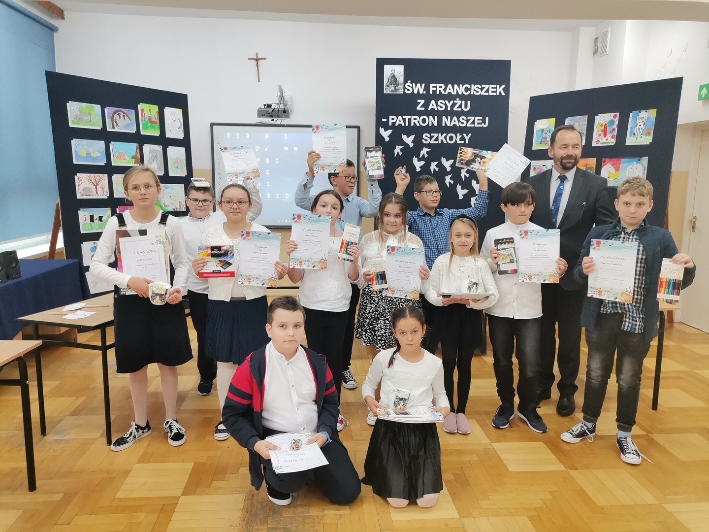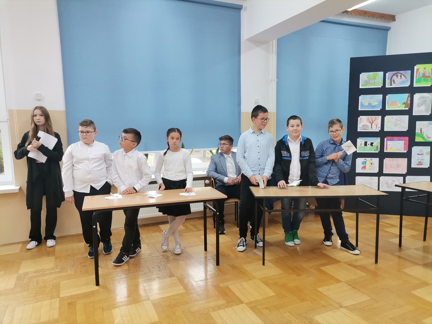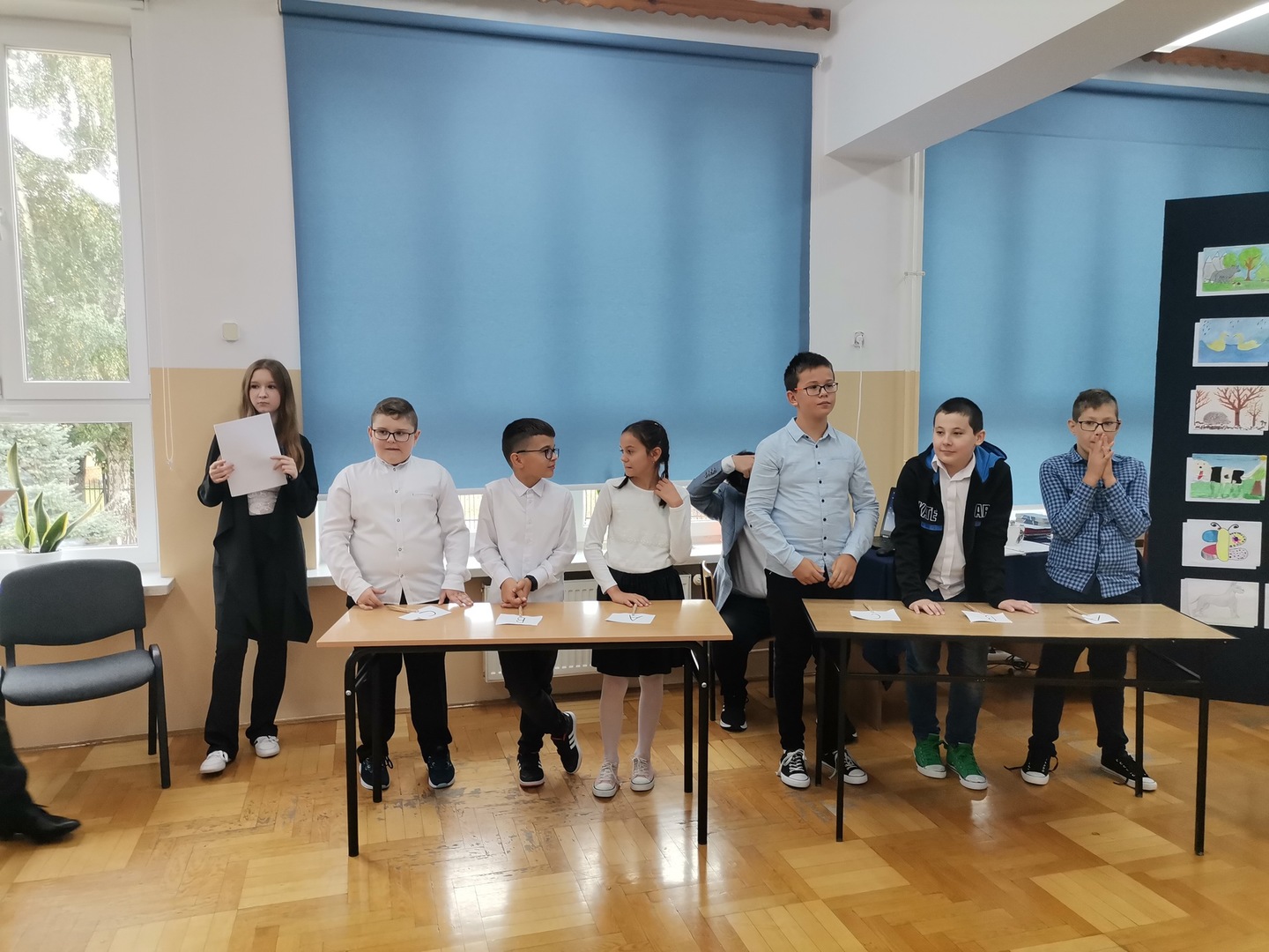 Następnie odbył się szkolny konkurs wiedzy o patronie i ekologii – jeden z dziesięciu. Reprezentanci klas udzielali odpowiedzi na pytania czytane przez pana Dyrektora. Najlepsi okazali się przedstawiciele klasy VI, którzy zajęli pierwsze miejsce i wygrali dla swojej klasy dzień bez pytania w październiku.