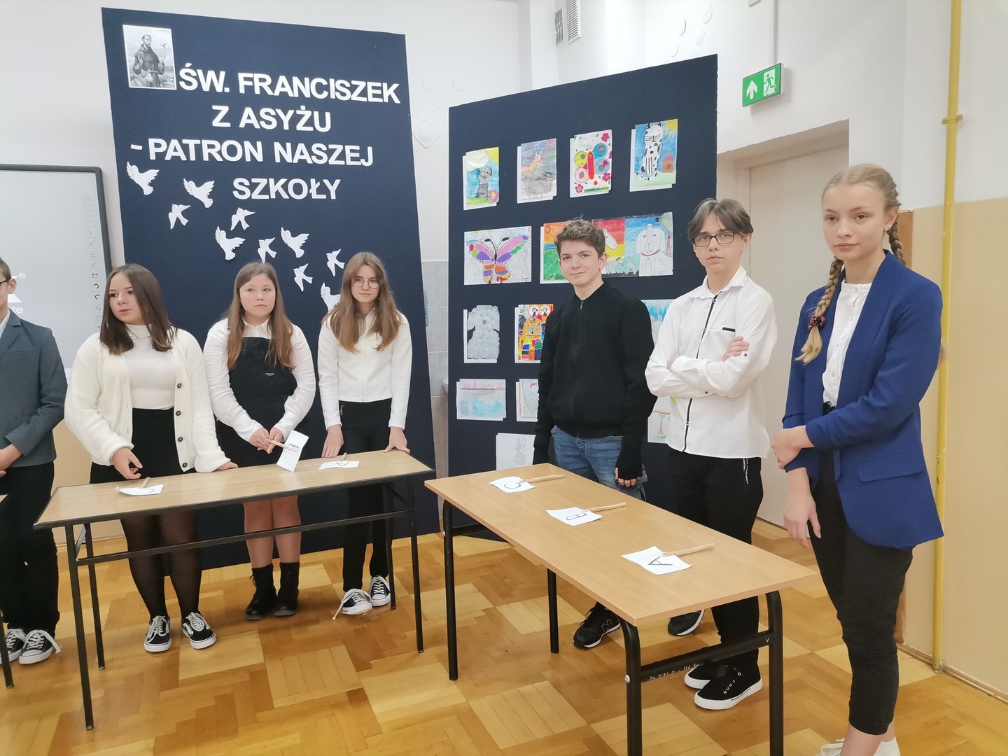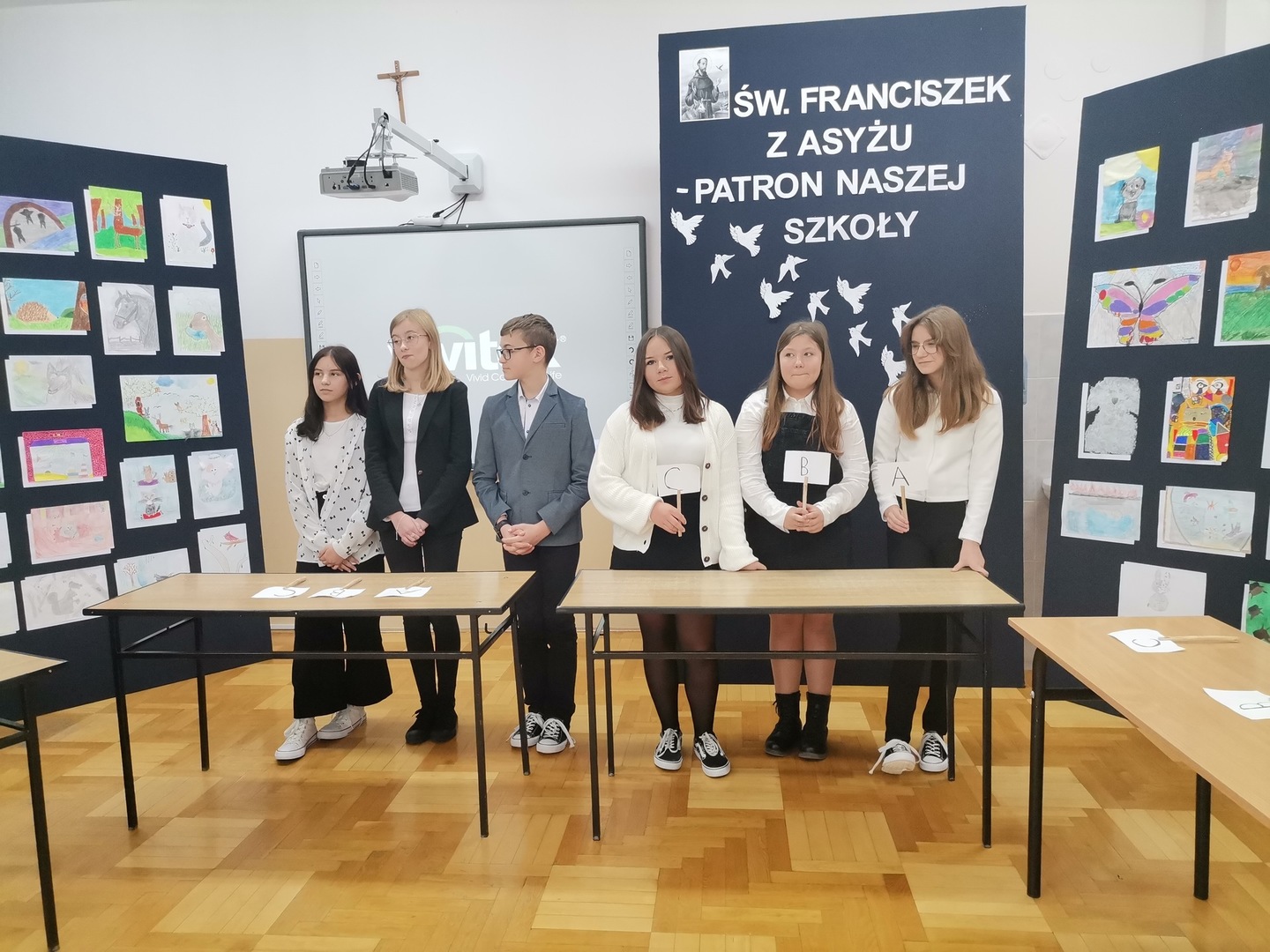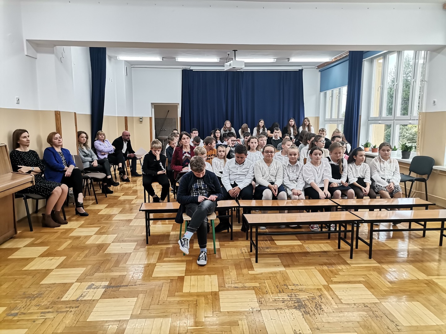 Następnie odbył się szkolny konkurs wiedzy o patronie i ekologii – jeden z dziesięciu. Reprezentanci klas udzielali odpowiedzi na pytania czytane przez pana Dyrektora. Najlepsi okazali się przedstawiciele klasy VI, którzy zajęli pierwsze miejsce i wygrali dla swojej klasy dzień bez pytania w październiku.