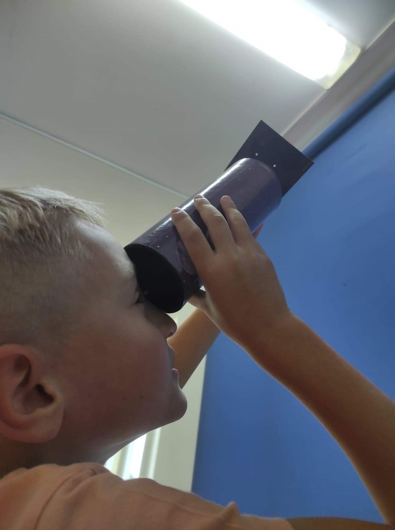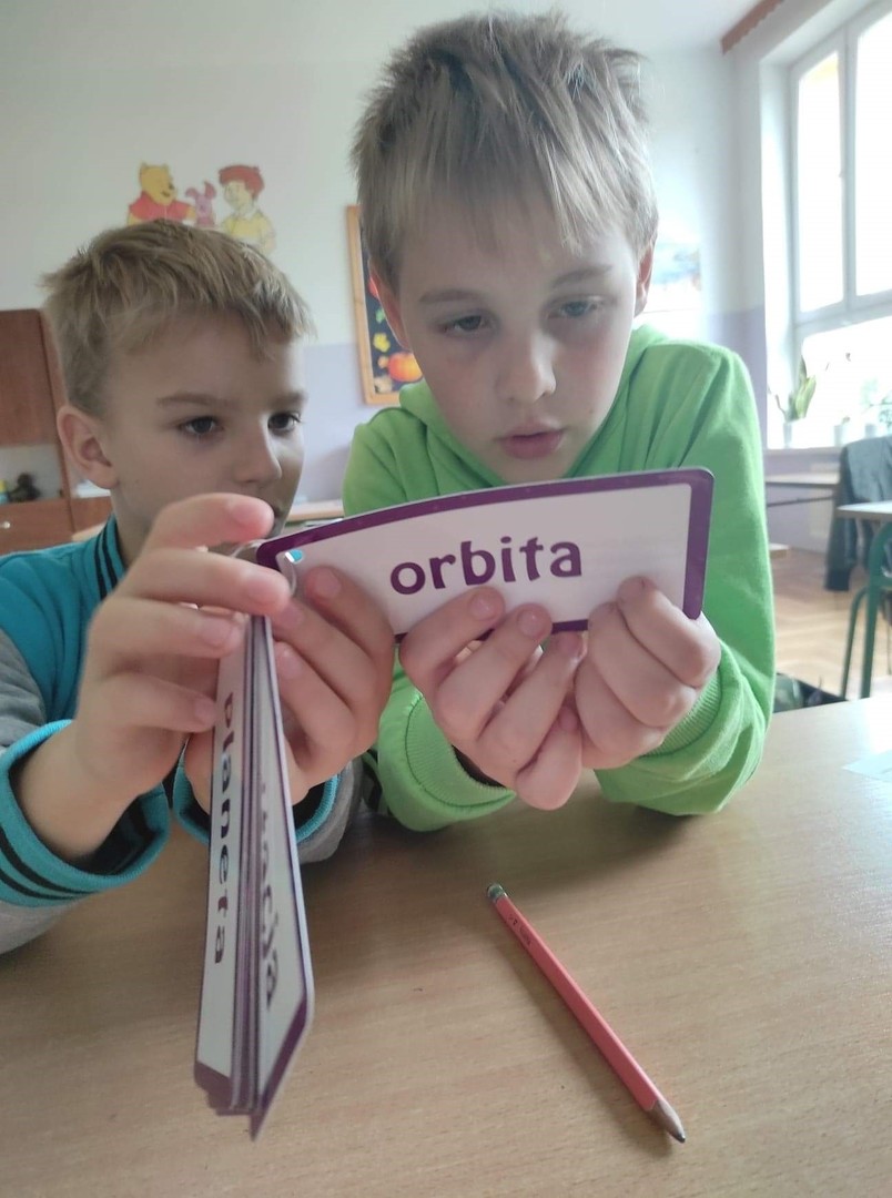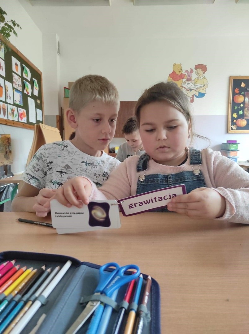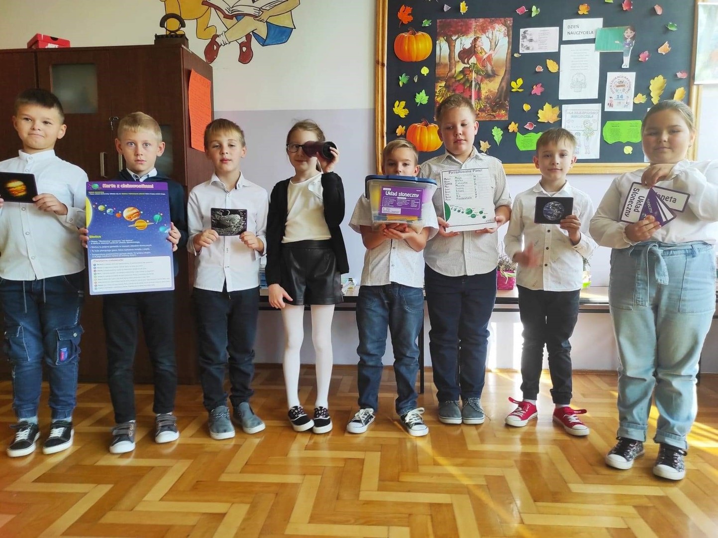 Uczniowie realizując temat „Układ Słoneczny i jego planety” poznawali budowę Układu Słonecznego, porównywali budowę planet i ich kolejność położenia względem słońca. Uzyskane informacje dzieci wykorzystały na zajęciach plastyczno – technicznych budując model Układu Słonecznego.