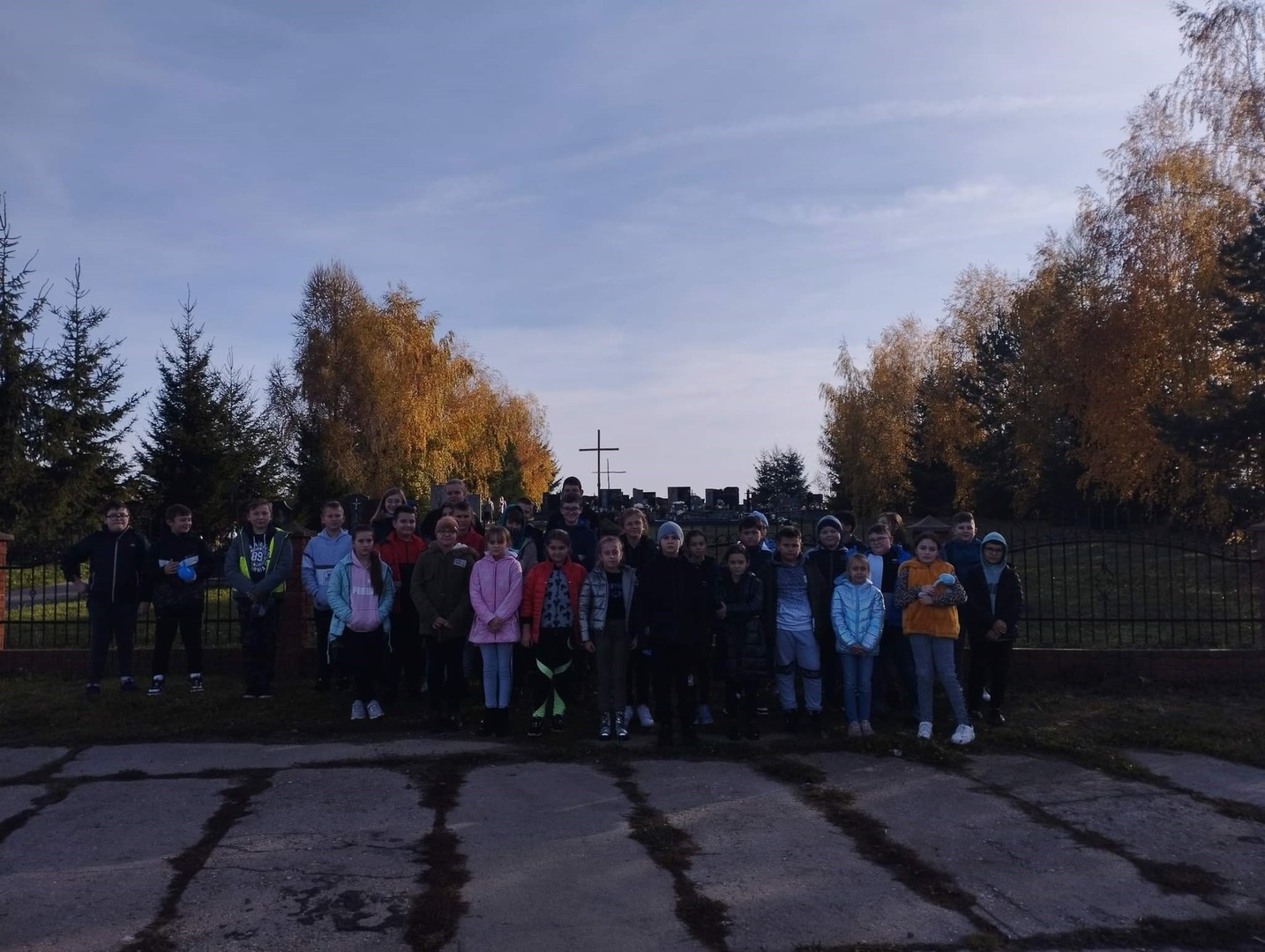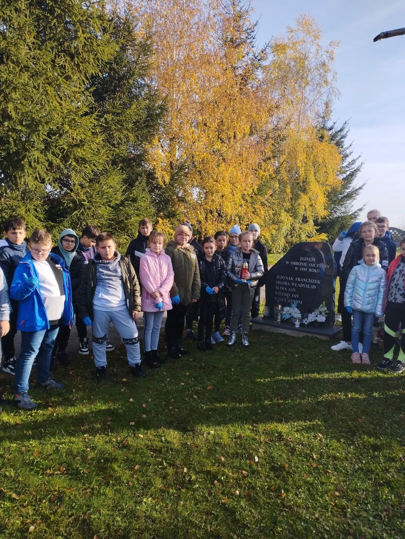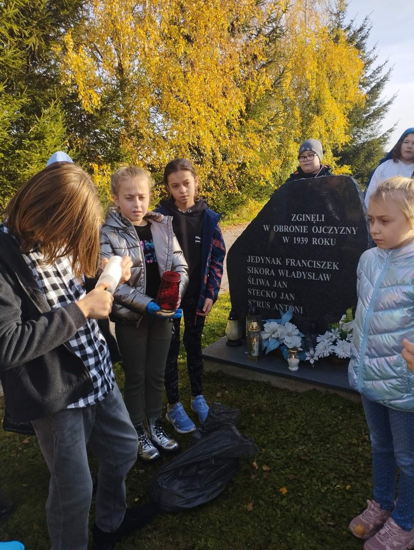 27.10.2022 roku, nasza szkoła już po raz kolejny wzięła udział w akcji ,,Szkoła Pamięta". Celem tej inicjatywy jest zwrócenie uwagi młodych ludzi na potrzebę pielęgnowania pamięci o bohaterach naszej wolności, szczególnie tych, którzy są związani z historią danego miejsca, regionu, społeczności. W tym dniu, uczniowie klas IV i VI udali się na miejscowy cmentarz, gdzie uporządkowali teren, a także zapalili znicz przy pomniku upamiętniającym poległych w obronie ojczyzny w 1939 roku. Nasi uczniowie wsparli tę akcję z ogromnym zaangażowaniem oraz wykazali się wysoką kulturą osobistą w czasie pobytu na cmentarzu.