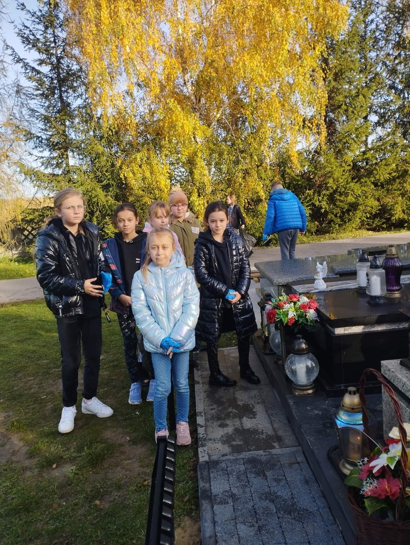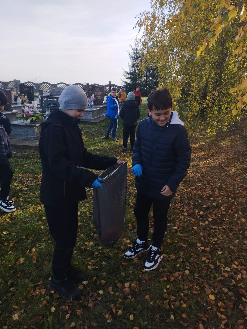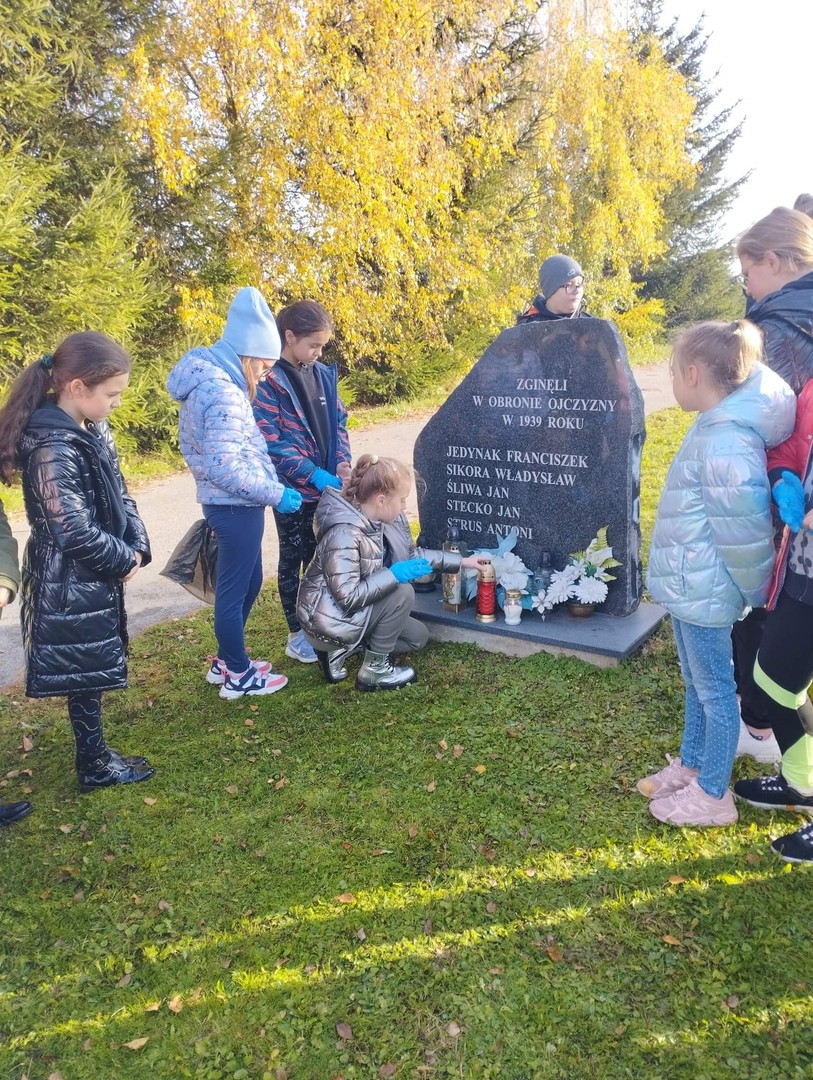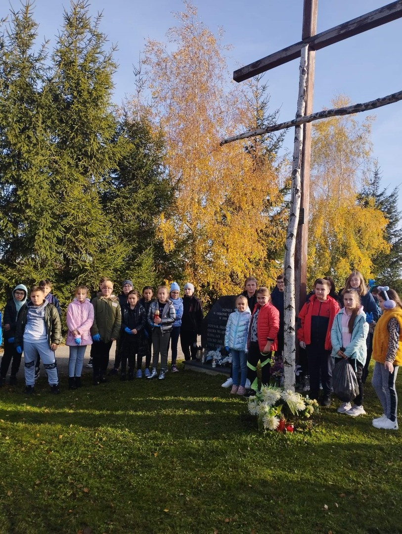 27.10.2022 roku, nasza szkoła już po raz kolejny wzięła udział w akcji ,,Szkoła Pamięta". Celem tej inicjatywy jest zwrócenie uwagi młodych ludzi na potrzebę pielęgnowania pamięci o bohaterach naszej wolności, szczególnie tych, którzy są związani z historią danego miejsca, regionu, społeczności. W tym dniu, uczniowie klas IV i VI udali się na miejscowy cmentarz, gdzie uporządkowali teren, a także zapalili znicz przy pomniku upamiętniającym poległych w obronie ojczyzny w 1939 roku. Nasi uczniowie wsparli tę akcję z ogromnym zaangażowaniem oraz wykazali się wysoką kulturą osobistą w czasie pobytu na cmentarzu.