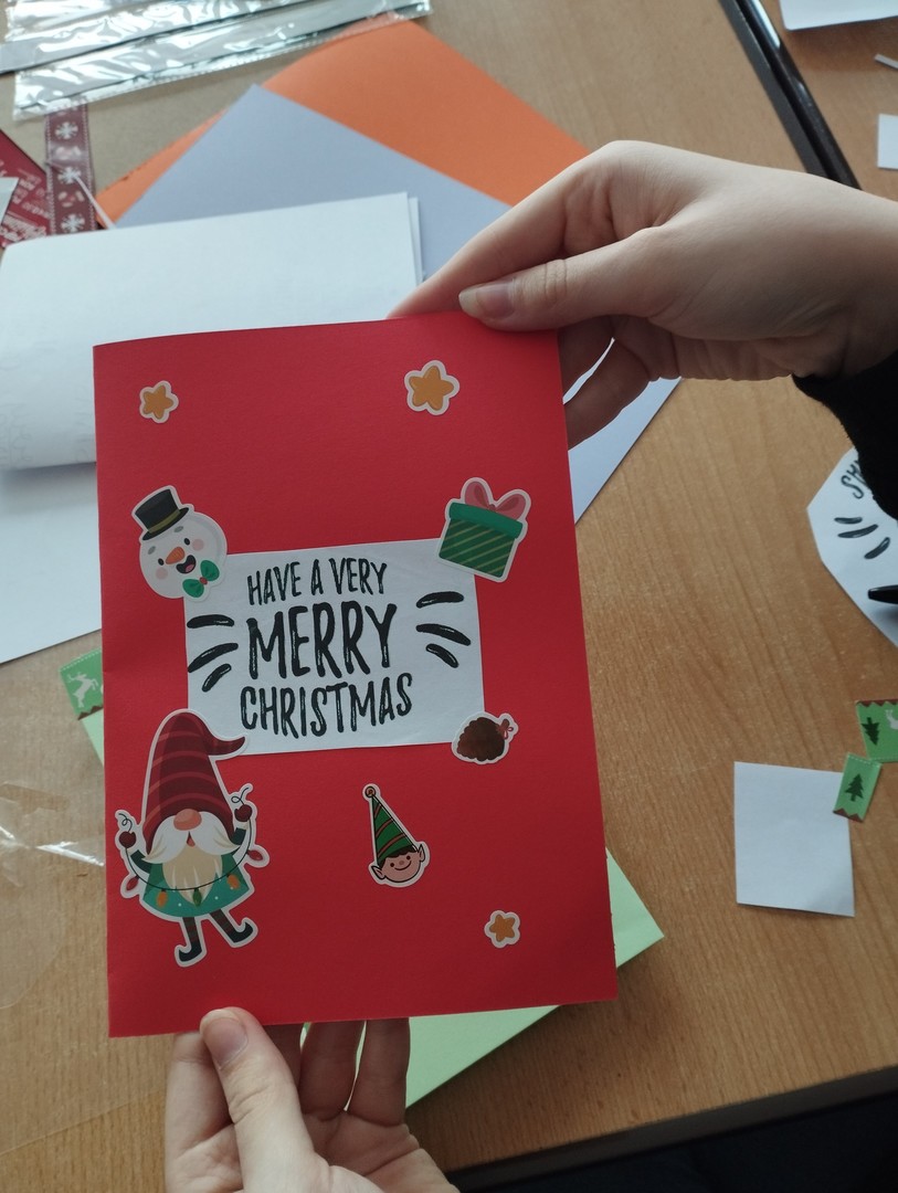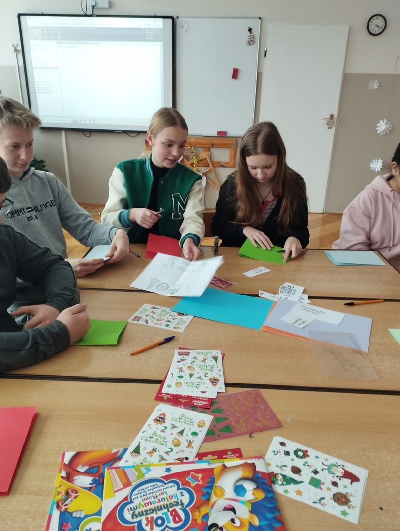 Z okazji zbliżających się Świąt Bożego Narodzenia klasa 8b wzięła udział w międzyszkolnej wymianie kartek świątecznych. Nasi uczniowie własnoręcznie wykonali piękne kartki oraz napisali życzenia oraz listy o sobie w języku angielskim. Zostały one wysłane do uczniów 8 klasy Szkoły Podstawowej w Siedlcach. Kartki od rówieśników dotarły również do nas. Taka wymiana pozwala na kultywowanie tradycji świątecznych. Dzięki niej mogliśmy również wykorzystać w praktyce to, czego uczymy się na lekcjach języka angielskiego.
