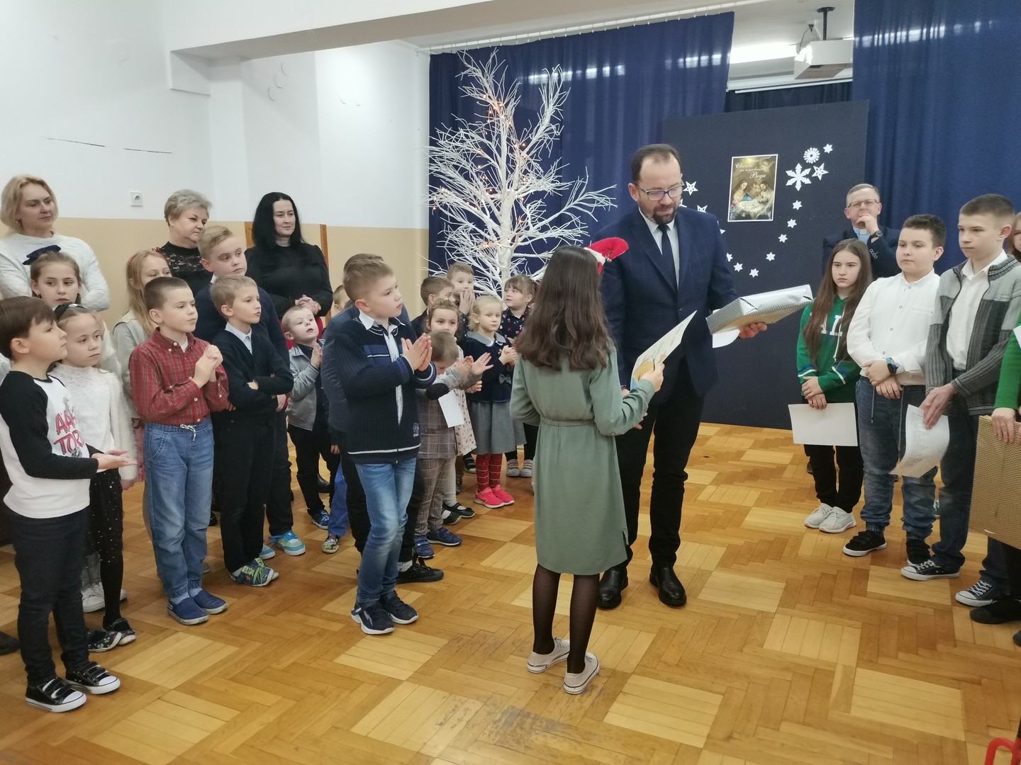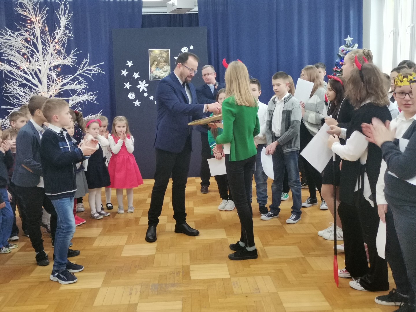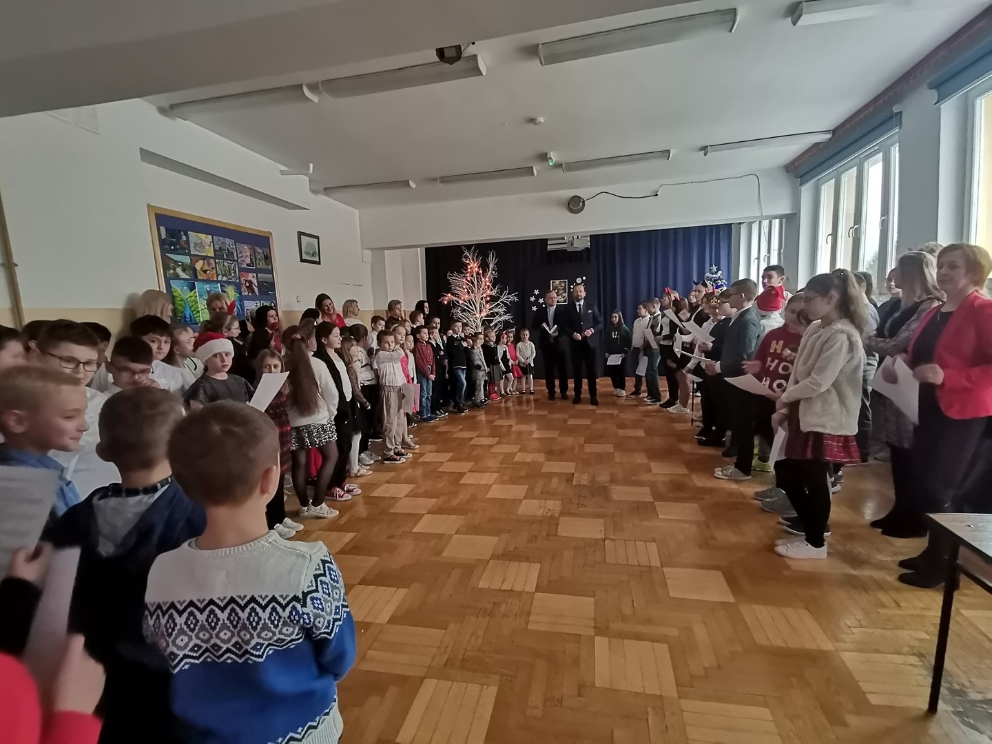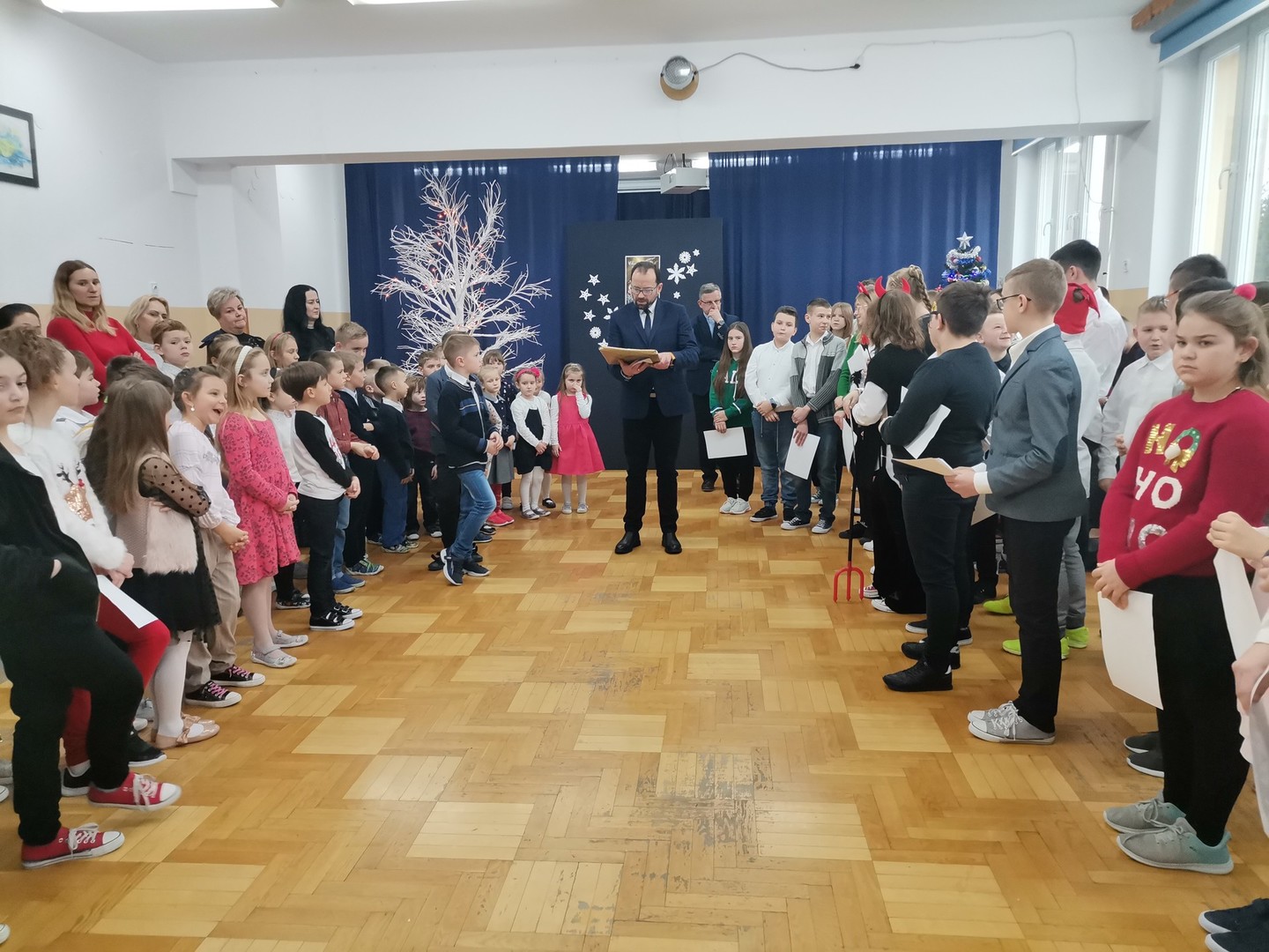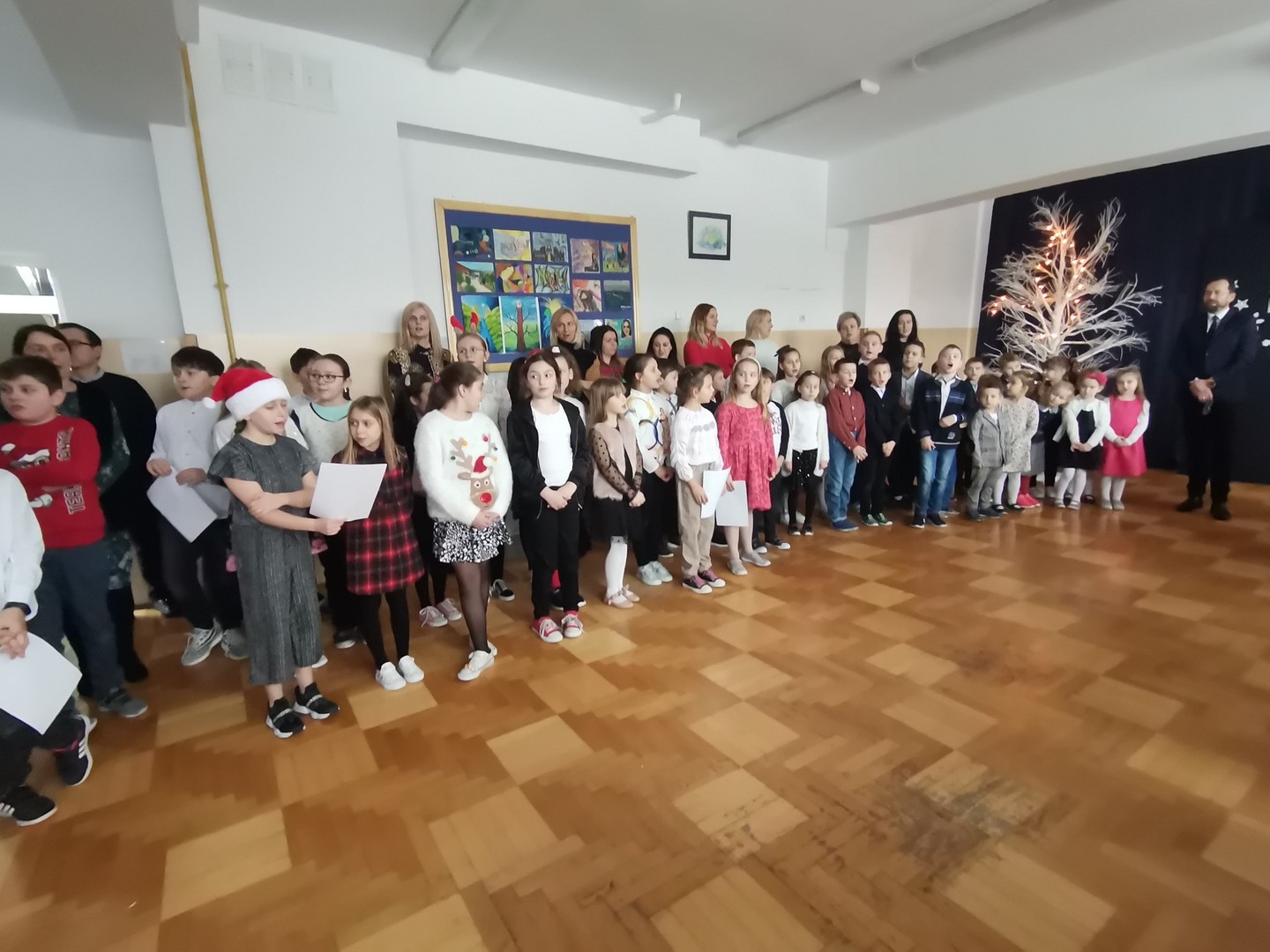 Dnia 22 grudnia w naszej szkole odbył się krótki świąteczny apel, podczas którego Pan Dyrektor odczytał fragment Pisma Świętego i złożył wszystkim życzenia, następnie razem śpiewaliśmy kolędy.