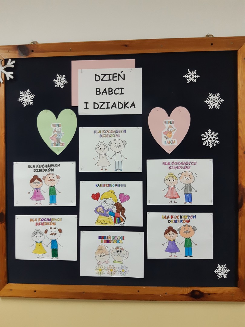 Jeszcze przed rozpoczęciem wypoczynku podczas ferii zimowych, uczniowie uczęszczający na świetlicę szkolną postanowili uczcić zbliżające się święto Babci i Dziadka. W czasie zajęć czytali wiersze o babci i dziadku, słuchali piosenek, rysowali laurki, opowiadali jak ważni są w ich życiu babcia i dziadek. Wykonywali też prace plastyczne pt. „Portret mojej Babci i mojego Dziadka”.