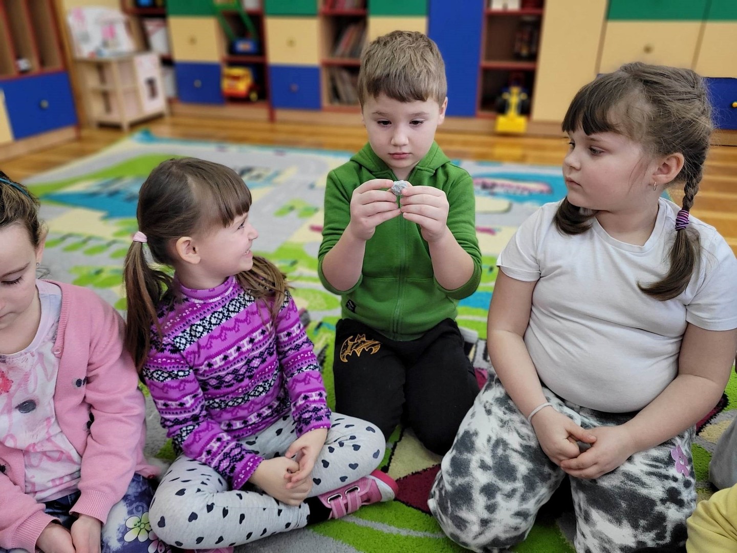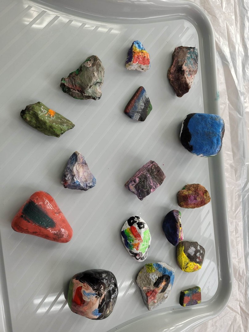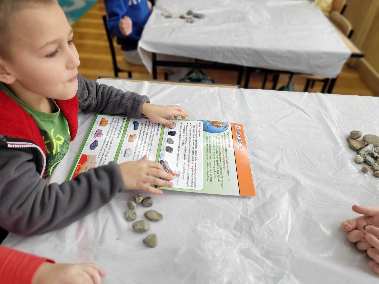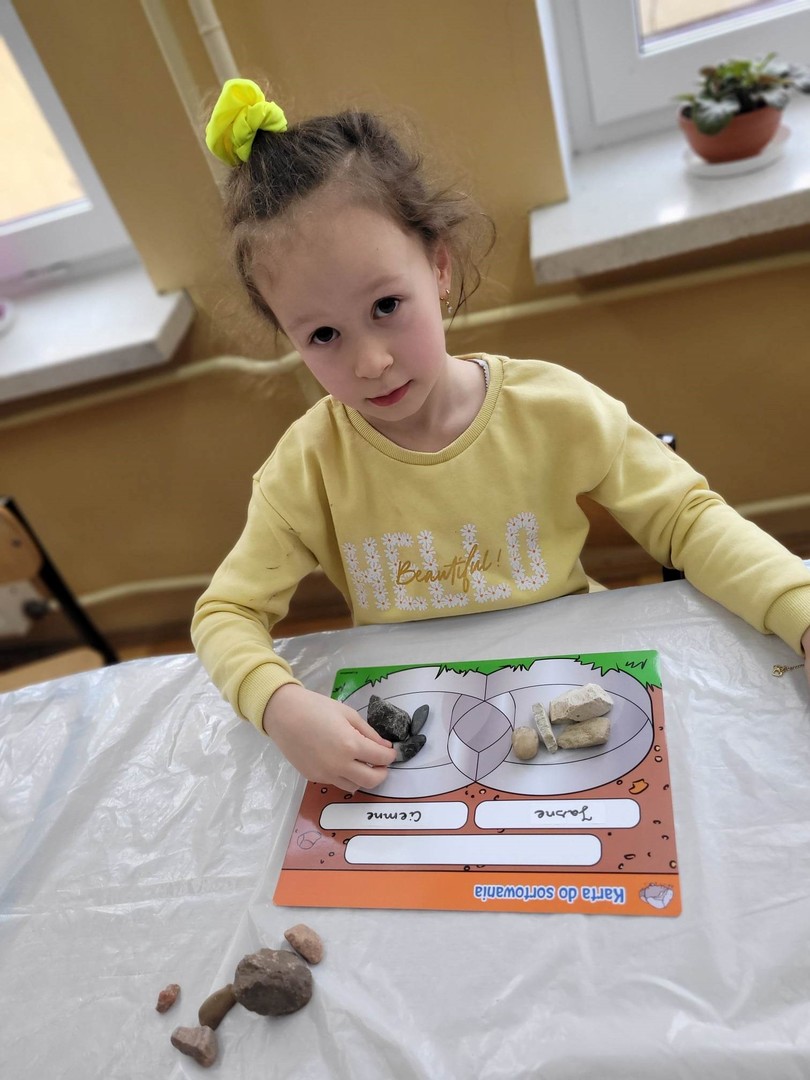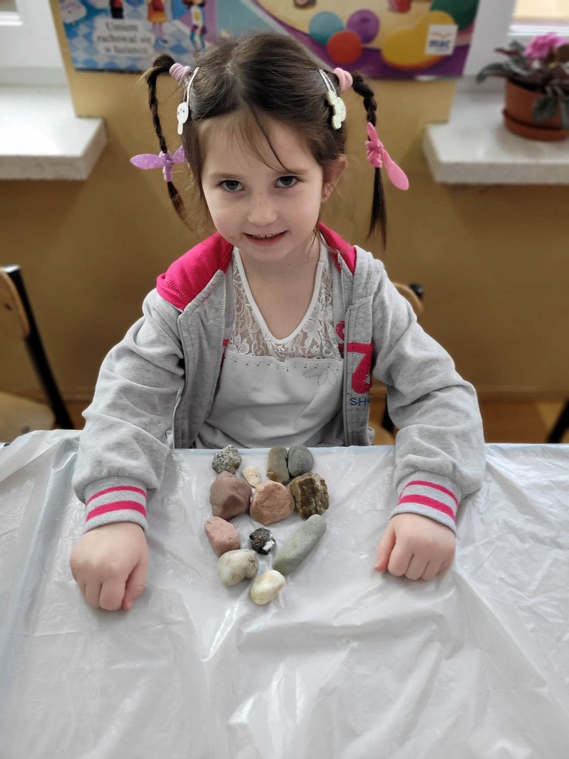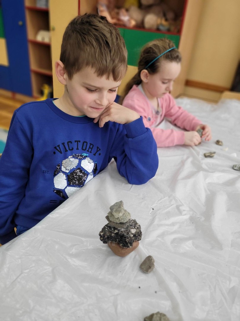 Tematem zajęć było: Skąd pochodzą skały i kamienie? W oparciu o film edukacyjny dzieci dowiedziały się skąd pochodzą skały i kamienie, a dzięki pomocom z programu mogły zobaczyć, dotknąć i poznać nazwy i rodzaje kamieni-skał, oglądać skały przez lupę, poznać ich kolor i strukturę, ważyć i oceniać ciężar, segregować na małe i duże. W podsumowaniu zajęć układały z kamieni różne wzory: płaskie i przestrzenne, a na koniec malowały kamienie farbami według własnego pomysłu.