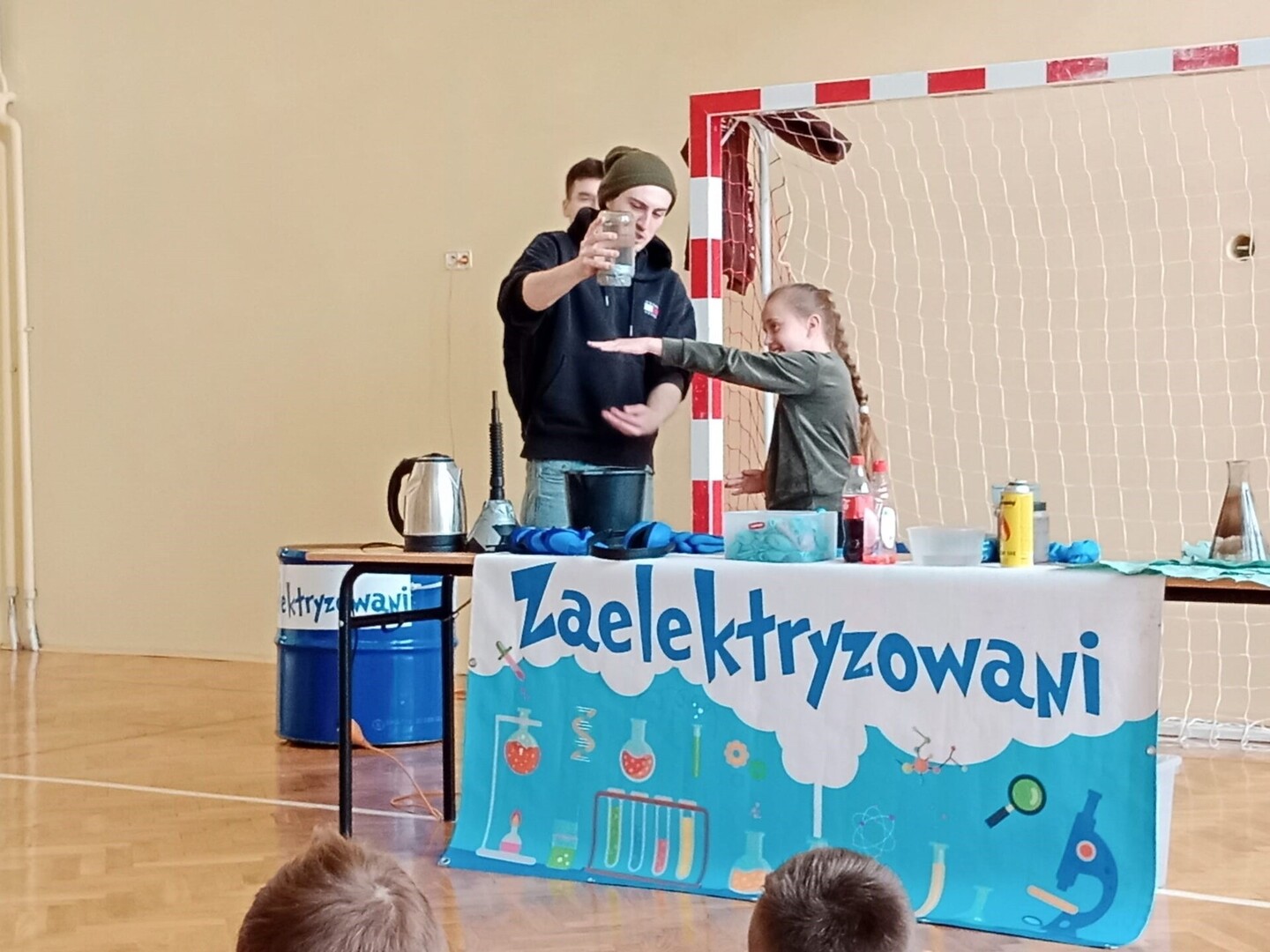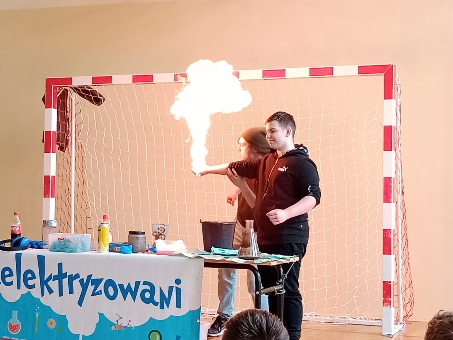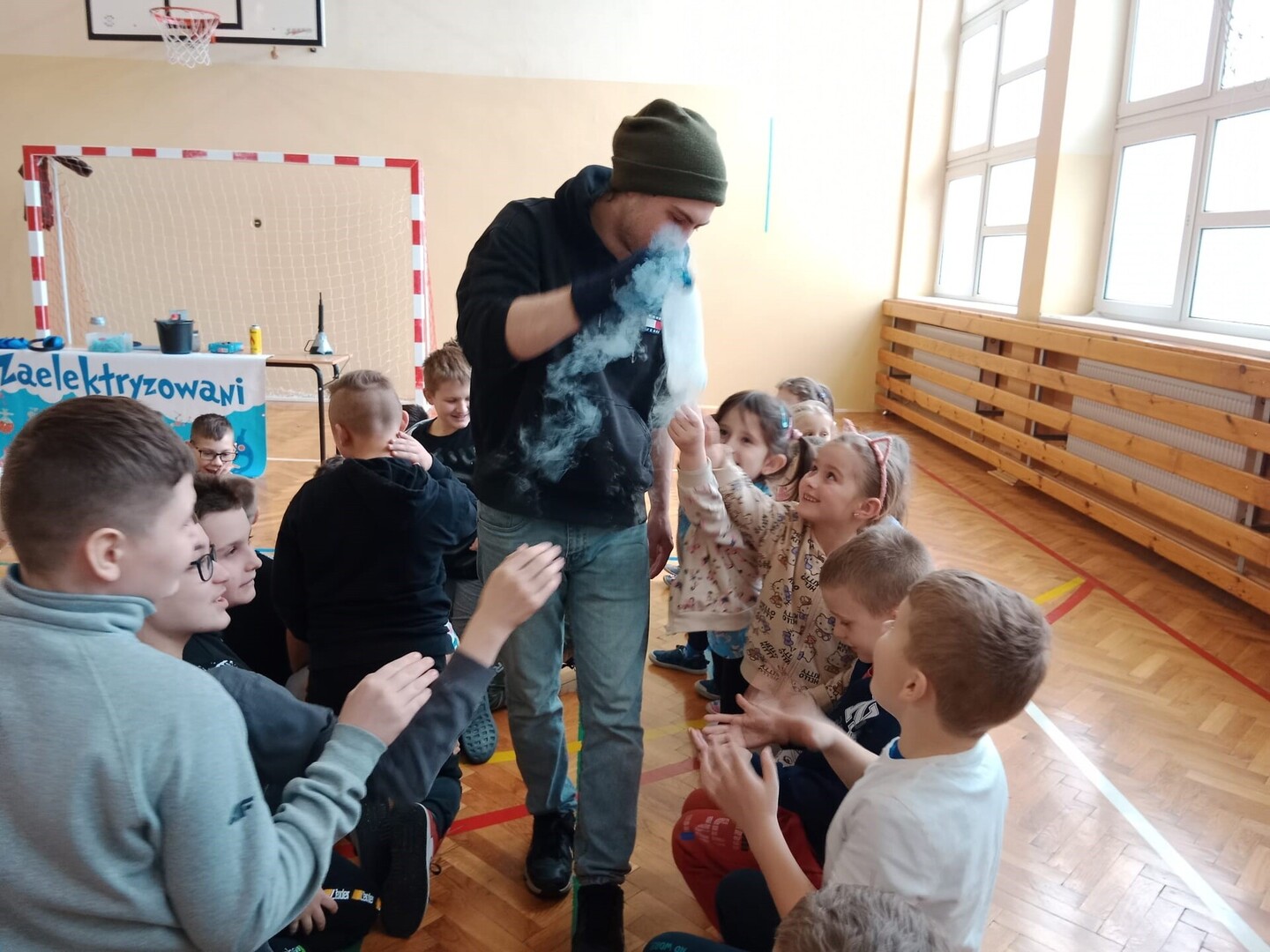 We wtorek 28.03.2023 r. uczniowie naszej szkoły uczestniczyli w lekcji prowadzonej przez grupę Zaelektryzowani, która w sposób atrakcyjny i zrozumiały dla uczniów przybliżyła tajniki fizyki i chemii. W programie znalazły się między innymi zabawy z gazami takimi jak ciekły azot, hel, metan, ciekawe zjawiska z fizyki – ciśnienie w próżni.
