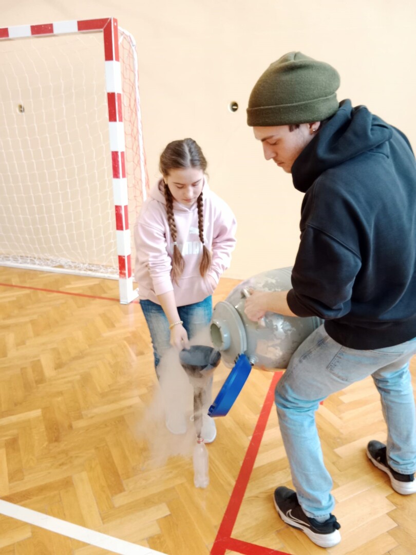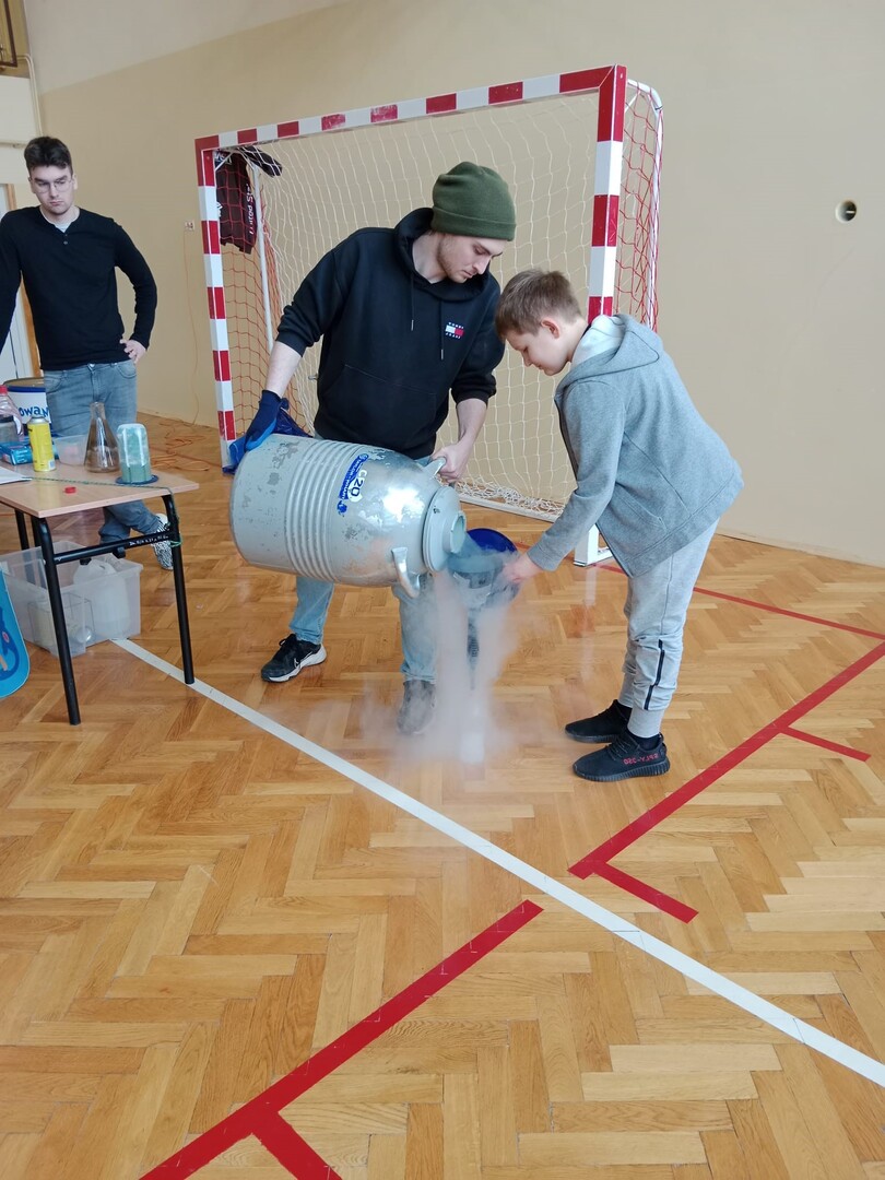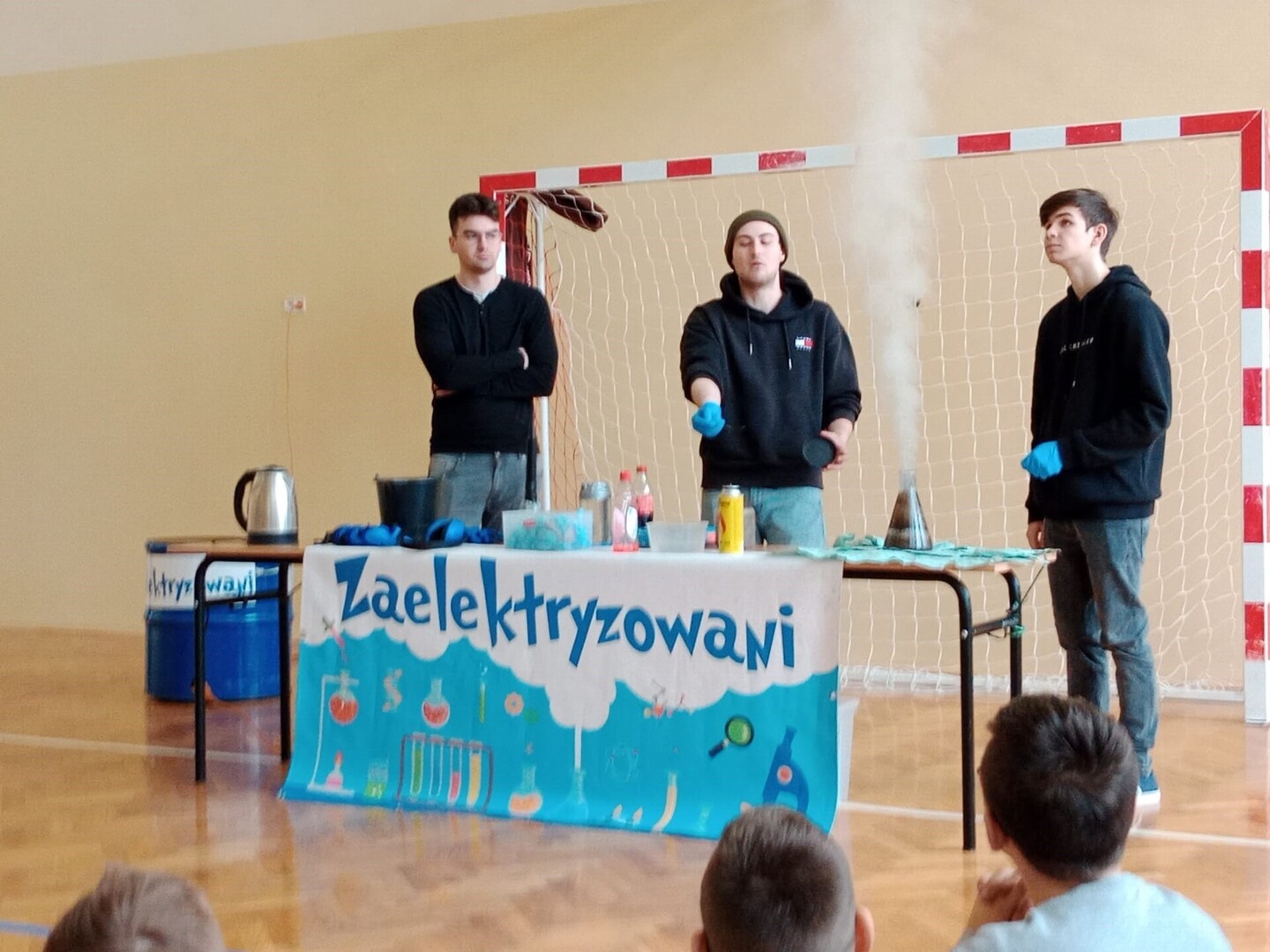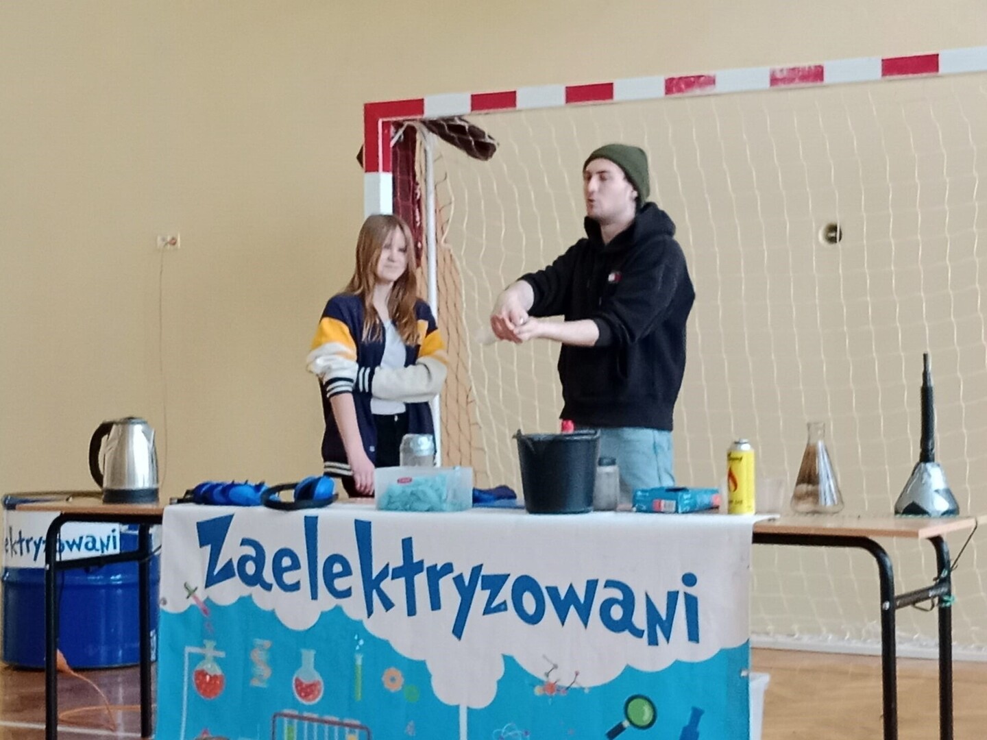 We wtorek 28.03.2023 r. uczniowie naszej szkoły uczestniczyli w lekcji prowadzonej przez grupę Zaelektryzowani, która w sposób atrakcyjny i zrozumiały dla uczniów przybliżyła tajniki fizyki i chemii. W programie znalazły się między innymi zabawy z gazami takimi jak ciekły azot, hel, metan, ciekawe zjawiska z fizyki – ciśnienie w próżni.