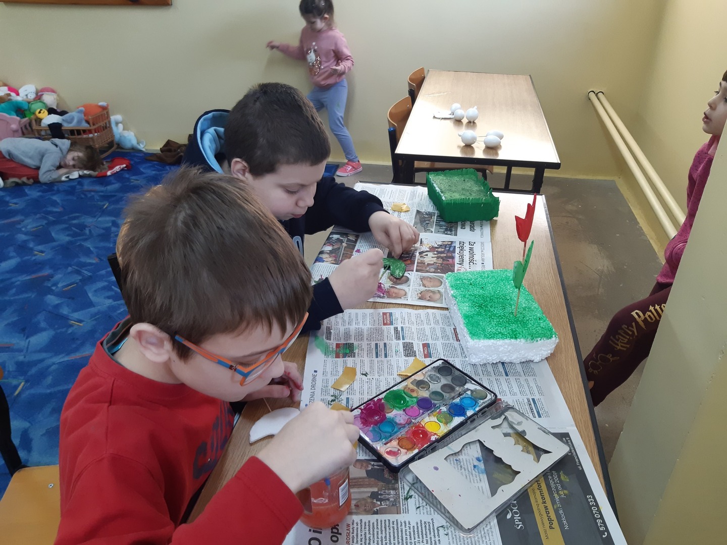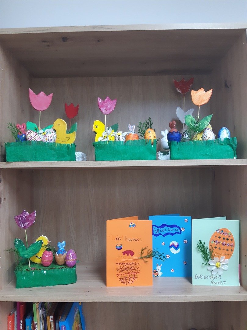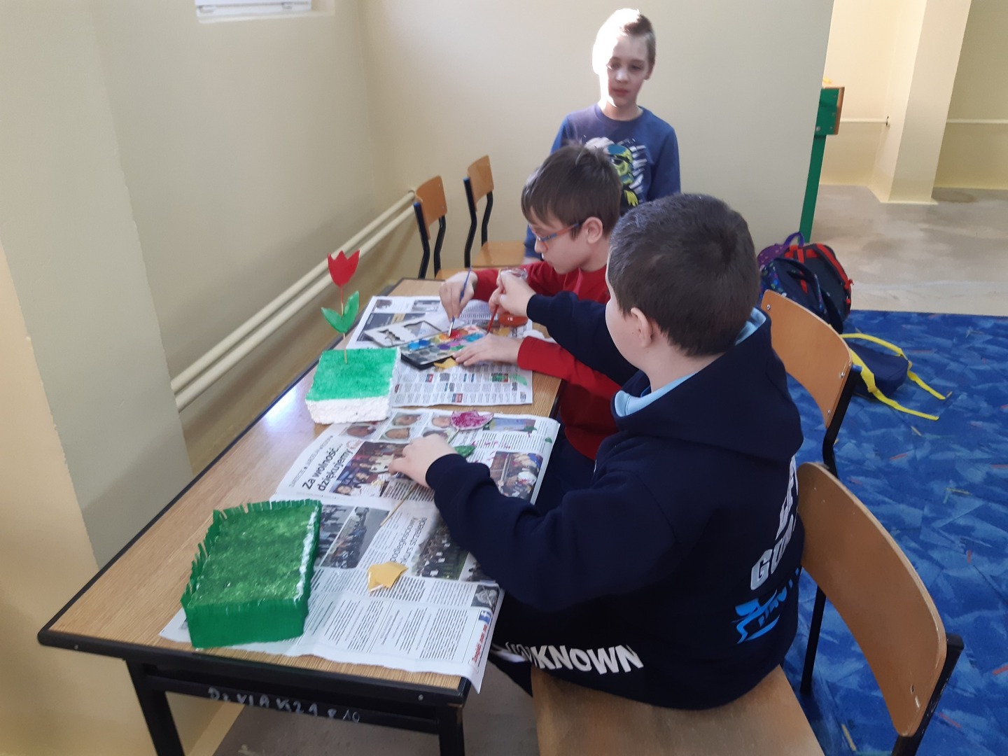 Uczniowie korzystający ze świetlicy szkolnej przygotowywali się do Świąt Wielkanocnych. W czasie zajęć poznawali tradycje, zwyczaje, czytali wiersze i legendy o tematyce świątecznej. Wykorzystywali różne materiały do stworzenia świątecznych stroików, pisanek, kartek wielkanocnych. Przygotowali również świąteczną gazetkę ścienną. Wszystkie przygotowania wprowadziły nas w uroczysty, świąteczny klimat.