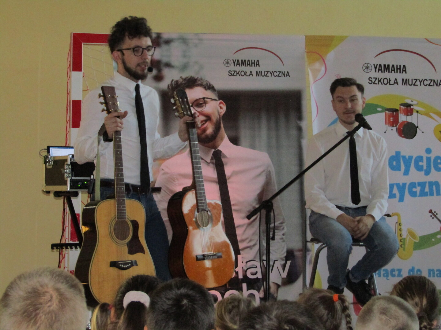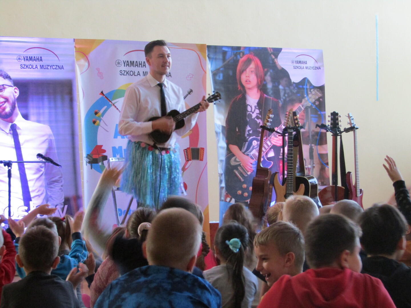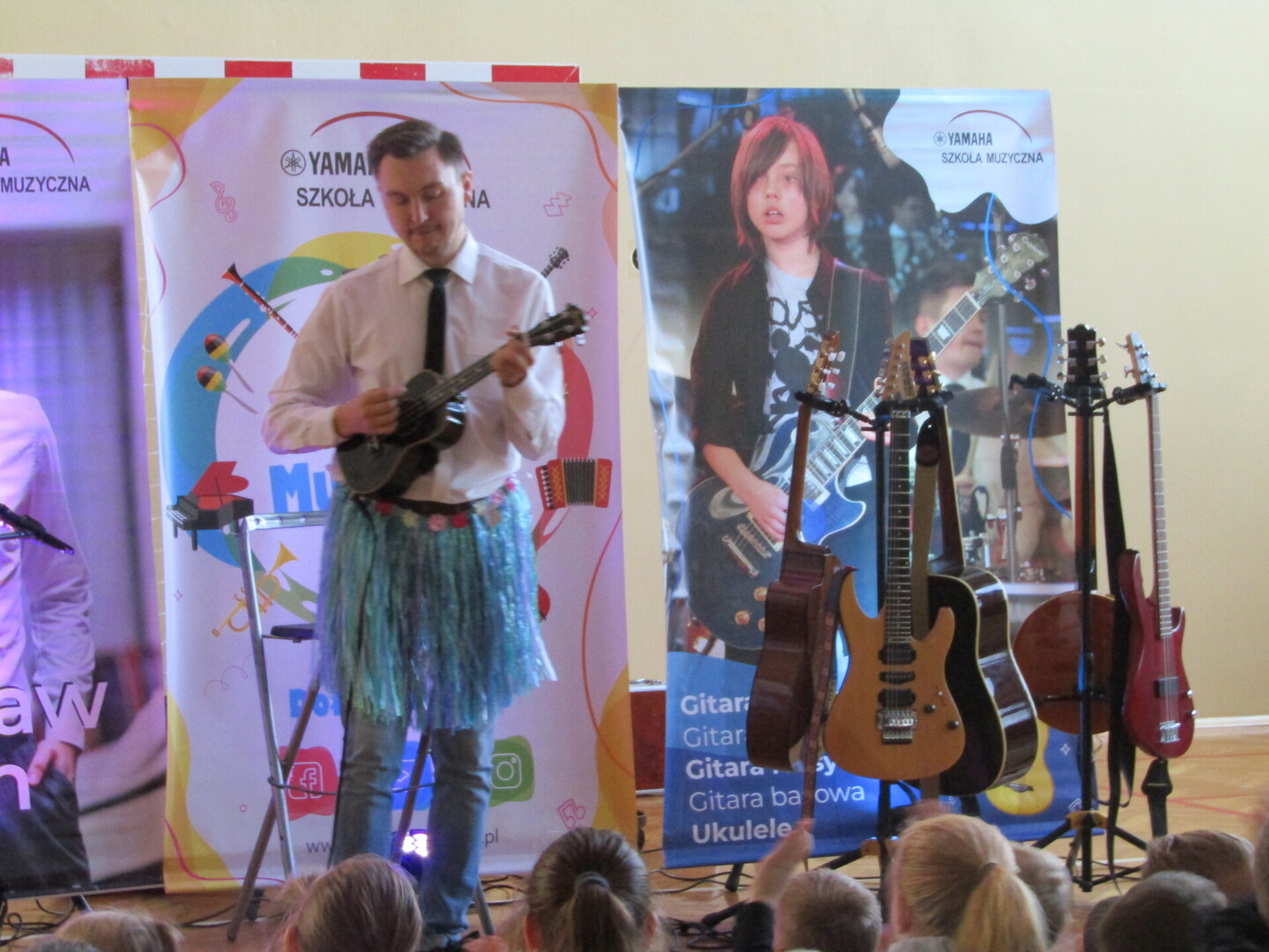 W dniu 12 października 2023r. społeczność naszej szkoły wzięła udział w lekcji muzycznej przygotowanej przez Muzyków ze Szkoły Muzycznej ,,Yamaha’’ w Przeworsku. Prezentowali oni różnego rodzaju gitary m. in. akustyczną, basową i rockową. Wszyscy uczniowie, od najmłodszych po najstarszych, z zainteresowaniem przyglądali się i słuchali programu muzycznego. Na zakończenie została zagrana, wesoła hawajska piosenka. Następnie wszyscy uczniowie, zadowoleni i weseli udali się z powrotem na lekcje.