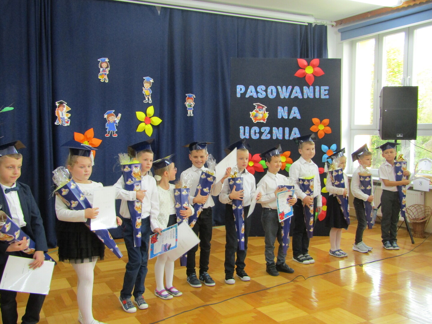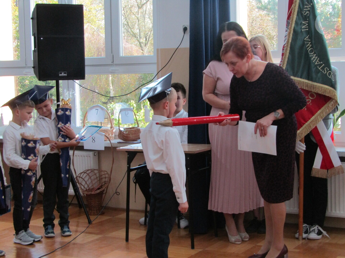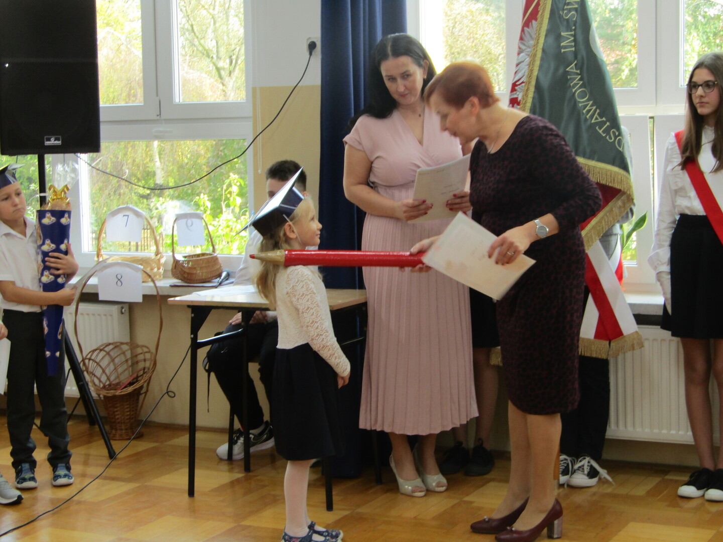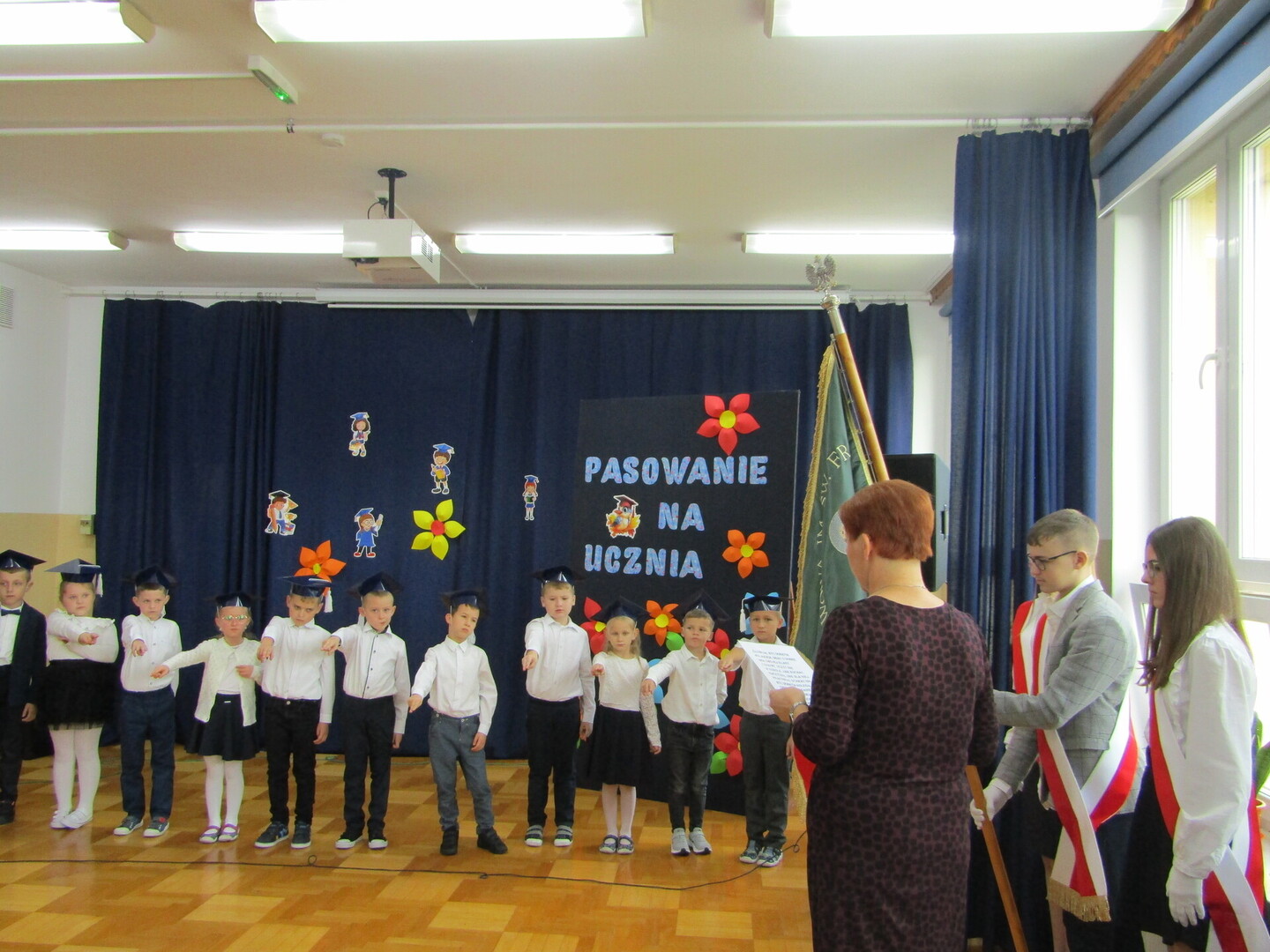 23 października 2023r. odbyła się w naszej szkole uroczystość pasowania na ucznia. Jest to szczególny dzień, który na długo pozostanie w pamięci każdego ucznia klasy pierwszej. W tym dniu dzieci oficjalnie przyjęte zostały do grona uczniów szkoły. Podczas uroczystości pierwszoklasiści pokazali, że potrafią pięknie śpiewać i recytować wiersze. Najważniejszą częścią uroczystości, na którą wszyscy czekali było ślubowanie oraz pasowanie wielkim ołówkiem przez Panią Dyrektor Martę Całka. Pierwszaki głośno i z przekonaniem przyrzekały być dobrymi i pilnymi uczniami oraz rzetelnie wypełniać swoje obowiązki, o czym przypominać im będą otrzymane dyplomy. Wszystkim pierwszoklasistom w tak ważnym dla nich dniu życzymy wielu sukcesów na nowej drodze obowiązków szkolnych.