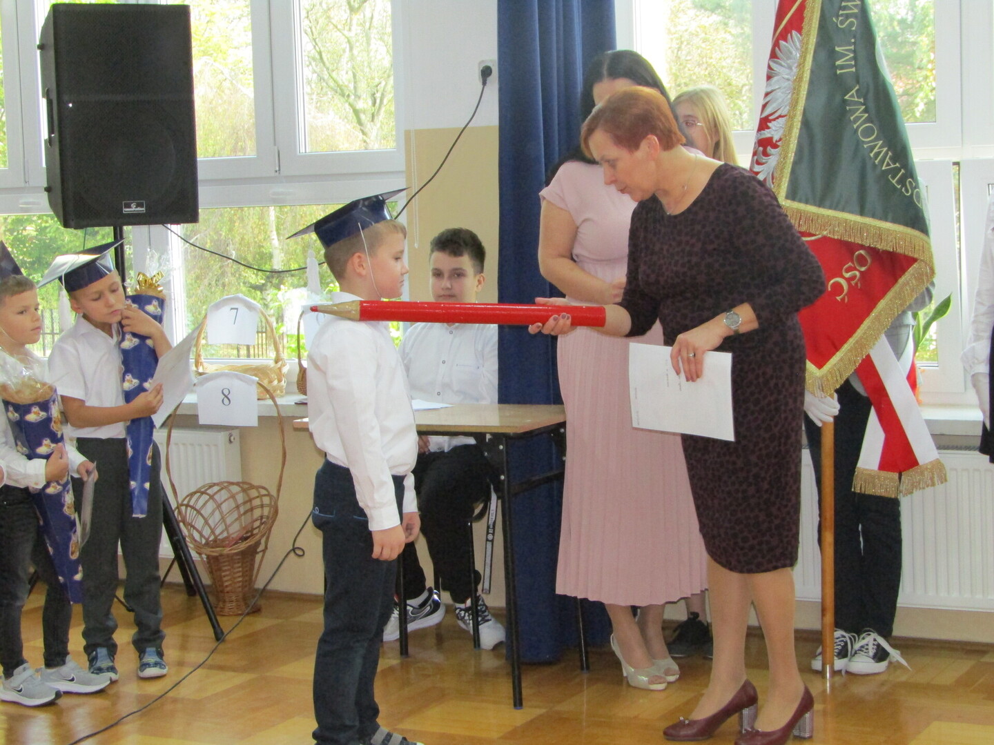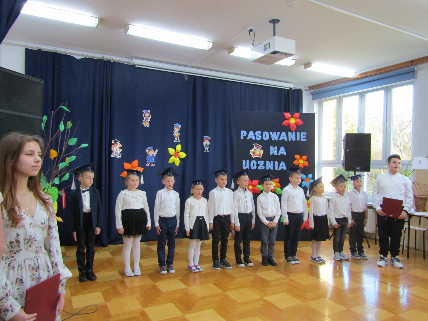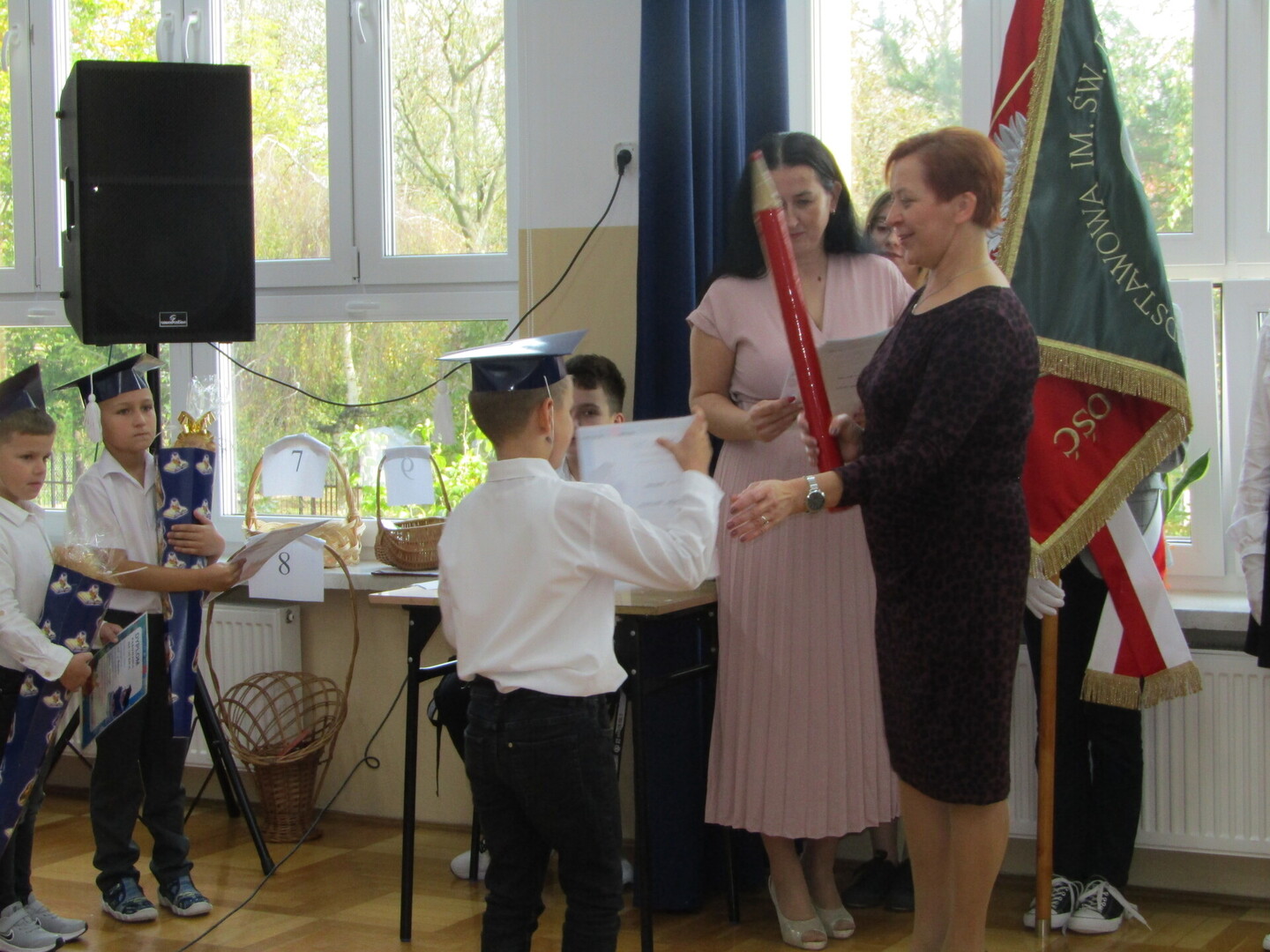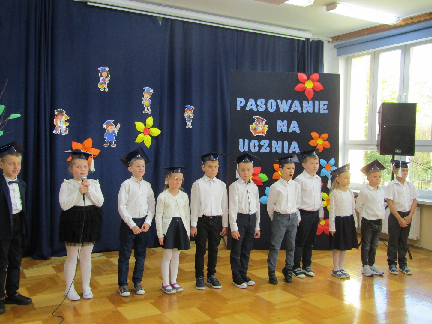 23 października 2023r. odbyła się w naszej szkole uroczystość pasowania na ucznia. Jest to szczególny dzień, który na długo pozostanie w pamięci każdego ucznia klasy pierwszej. W tym dniu dzieci oficjalnie przyjęte zostały do grona uczniów szkoły. Podczas uroczystości pierwszoklasiści pokazali, że potrafią pięknie śpiewać i recytować wiersze. Najważniejszą częścią uroczystości, na którą wszyscy czekali było ślubowanie oraz pasowanie wielkim ołówkiem przez Panią Dyrektor Martę Całka. Pierwszaki głośno i z przekonaniem przyrzekały być dobrymi i pilnymi uczniami oraz rzetelnie wypełniać swoje obowiązki, o czym przypominać im będą otrzymane dyplomy. Wszystkim pierwszoklasistom w tak ważnym dla nich dniu życzymy wielu sukcesów na nowej drodze obowiązków szkolnych.