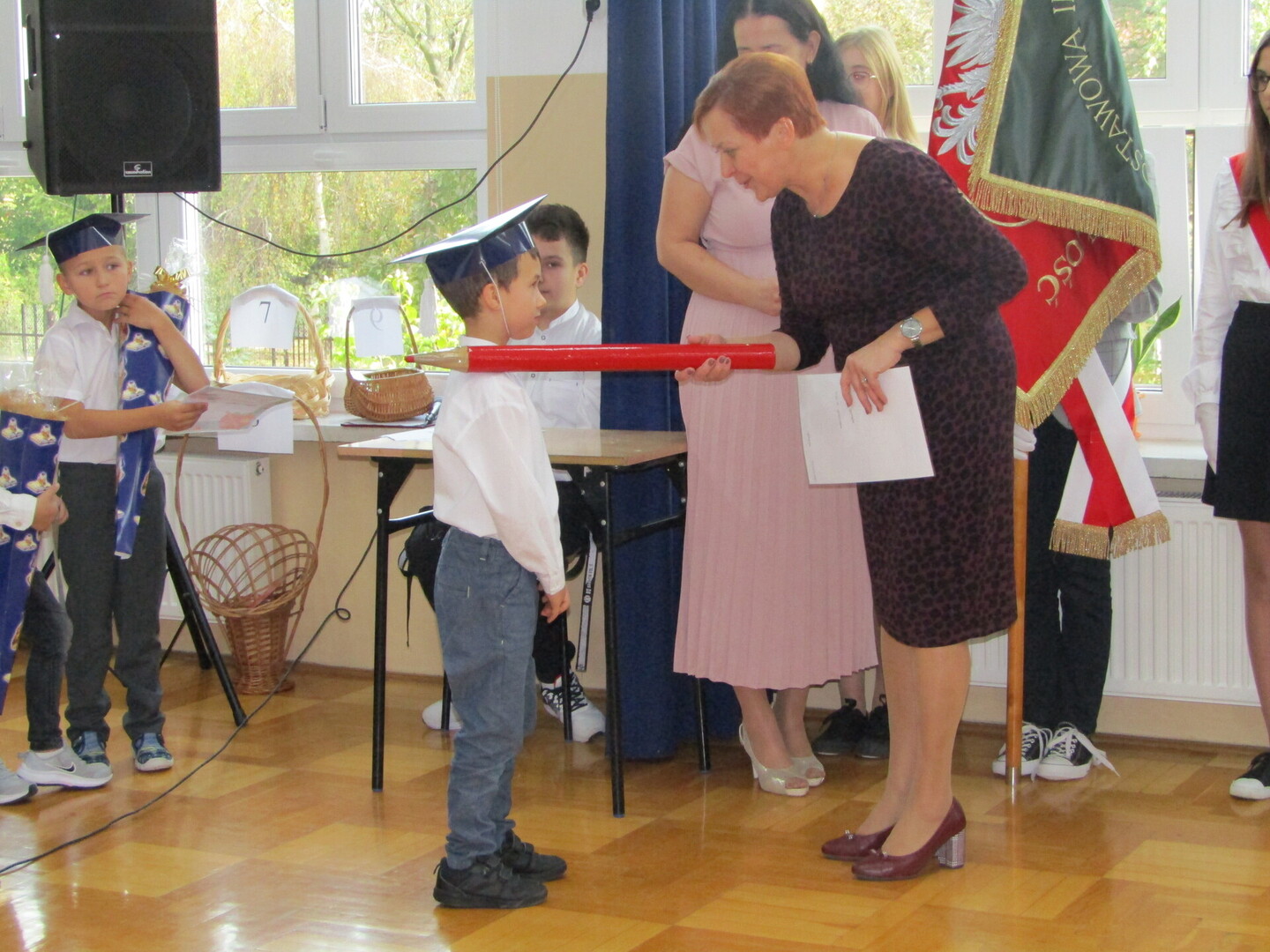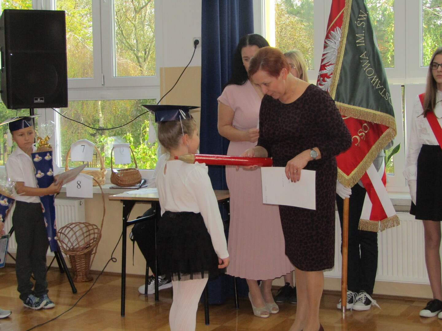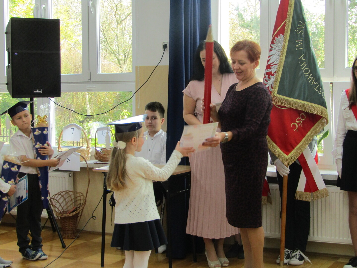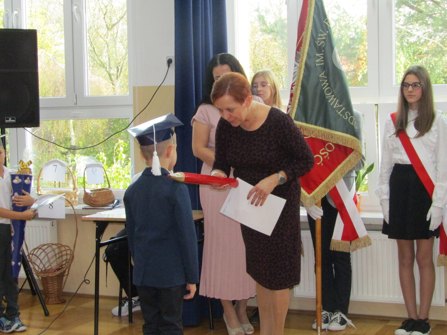 23 października 2023r. odbyła się w naszej szkole uroczystość pasowania na ucznia. Jest to szczególny dzień, który na długo pozostanie w pamięci każdego ucznia klasy pierwszej. W tym dniu dzieci oficjalnie przyjęte zostały do grona uczniów szkoły. Podczas uroczystości pierwszoklasiści pokazali, że potrafią pięknie śpiewać i recytować wiersze. Najważniejszą częścią uroczystości, na którą wszyscy czekali było ślubowanie oraz pasowanie wielkim ołówkiem przez Panią Dyrektor Martę Całka. Pierwszaki głośno i z przekonaniem przyrzekały być dobrymi i pilnymi uczniami oraz rzetelnie wypełniać swoje obowiązki, o czym przypominać im będą otrzymane dyplomy. Wszystkim pierwszoklasistom w tak ważnym dla nich dniu życzymy wielu sukcesów na nowej drodze obowiązków szkolnych.