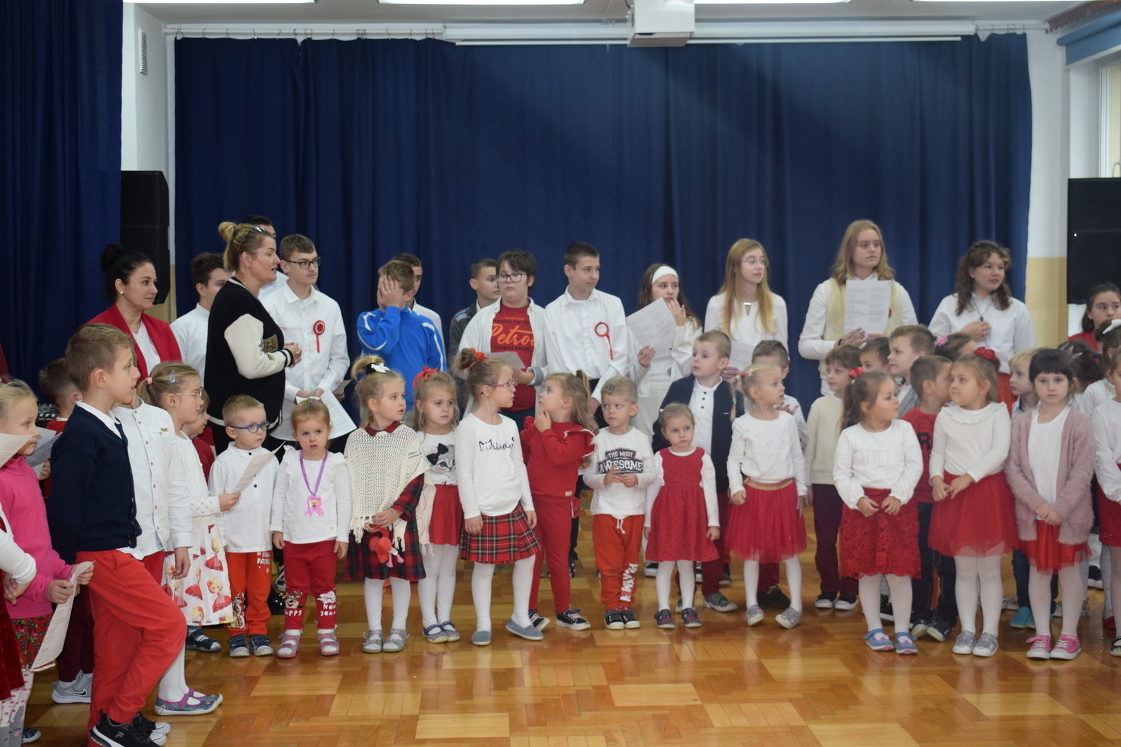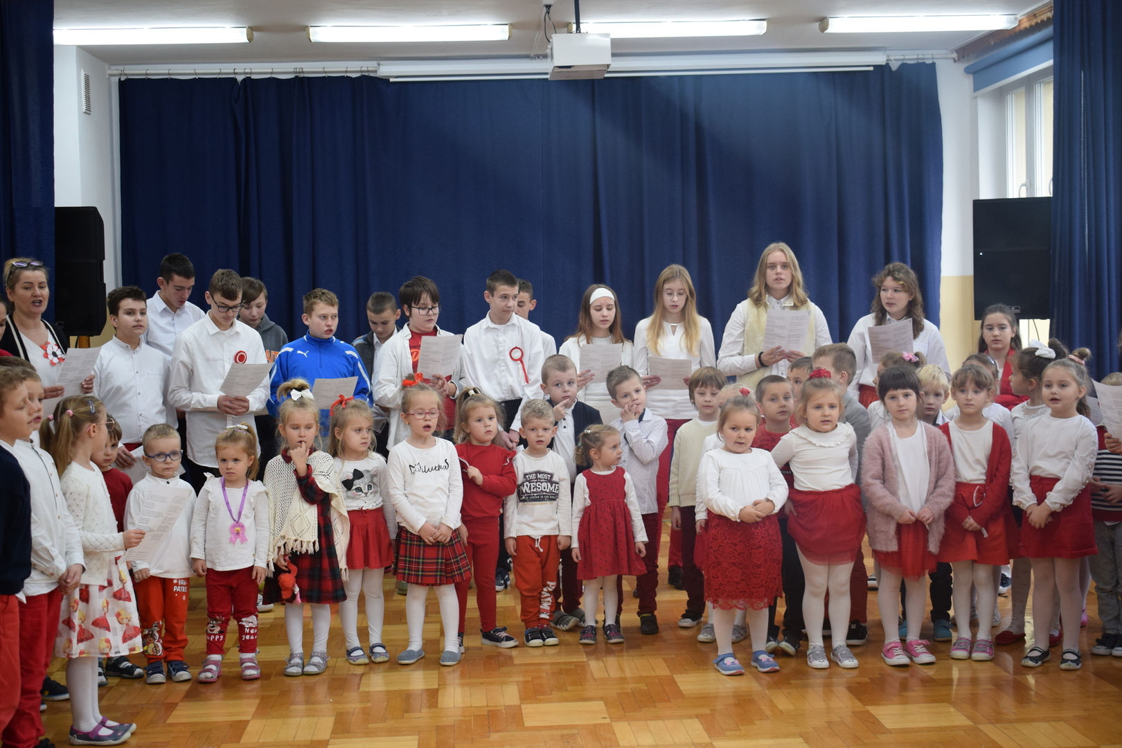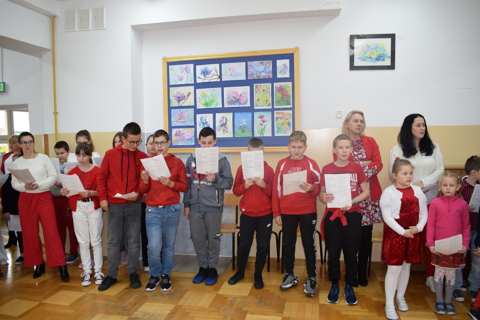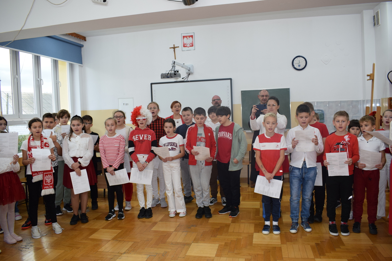 Dnia 21 listopada 2023r. w naszej szkole została zorganizowana patriotyczna przerwa. Wszyscy uczniowie, od najmłodszych do najstarszych oraz całe grono pedagogiczne zgromadzili się w sali, gdzie wspólnie odśpiewaliśmy pieśni narodowe. Wśród zaśpiewanych utworów były pieśni takie jak ,,Szara Piechota”, ,,Pałacyk Michla” oraz ,,Przybyli ułani pod okienko”. W ten sposób okazaliśmy szacunek i miłość naszej ojczyźnie oraz upamiętniliśmy tych, którzy polegli w walce o jej niepodległość.