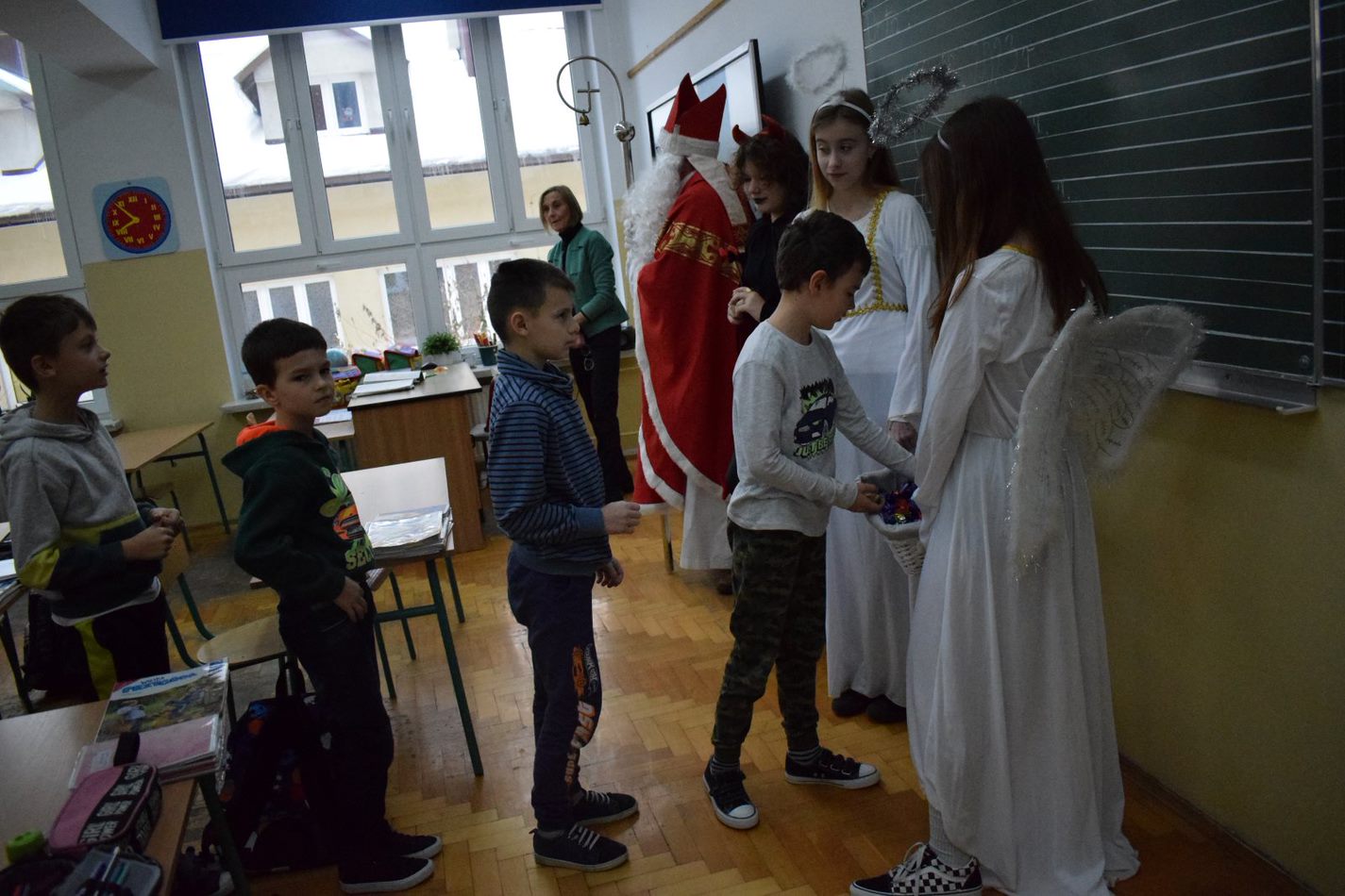 Dnia 5 grudnia nasza szkoła po raz kolejny gościła Świętego Mikołaja, który wraz ze swoimi pomocnikami - przedstawicielami SU rozdawał cukierki wszystkim grzecznym dzieciom. Dzieci niezwykle cieszyły się wizytą wyjątkowego gościa. Oddziały przedszkolne przywitały go pięknymi piosenkami oraz miały możliwość odbyć z nim krótką rozmowę. Mamy nadzieję, że dzieci na długo zapamiętają ten niezwykły dzień.
