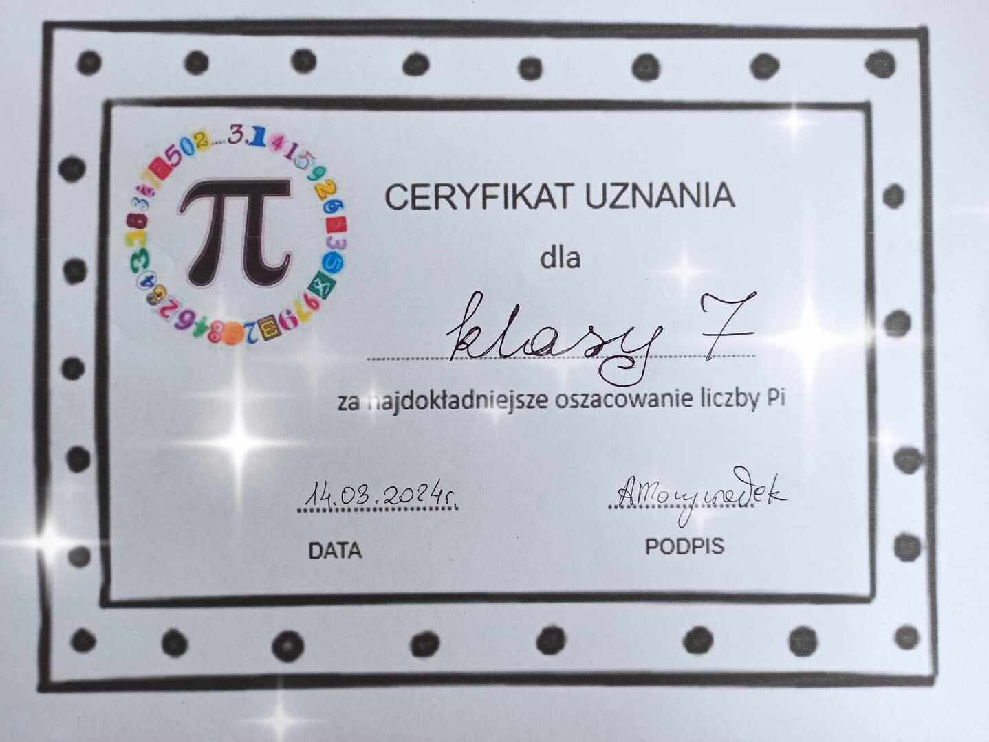 Wygrała klasa 7, reprezentowana przez Julię Kopeć oraz Lucynę Mazur-Więcław - otrzymały najlepsze przybliżenie liczby π. Drugie miejsce – klasa 6, reprezentowana przez Karola Jarosza oraz Bartosza Warańskiego.