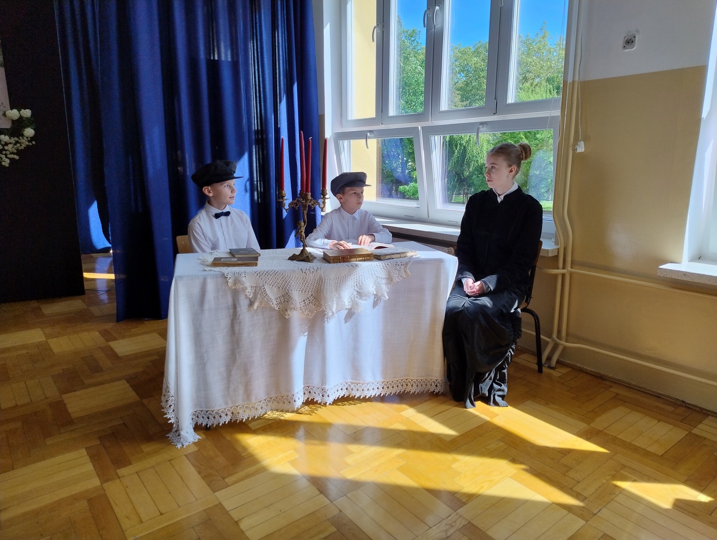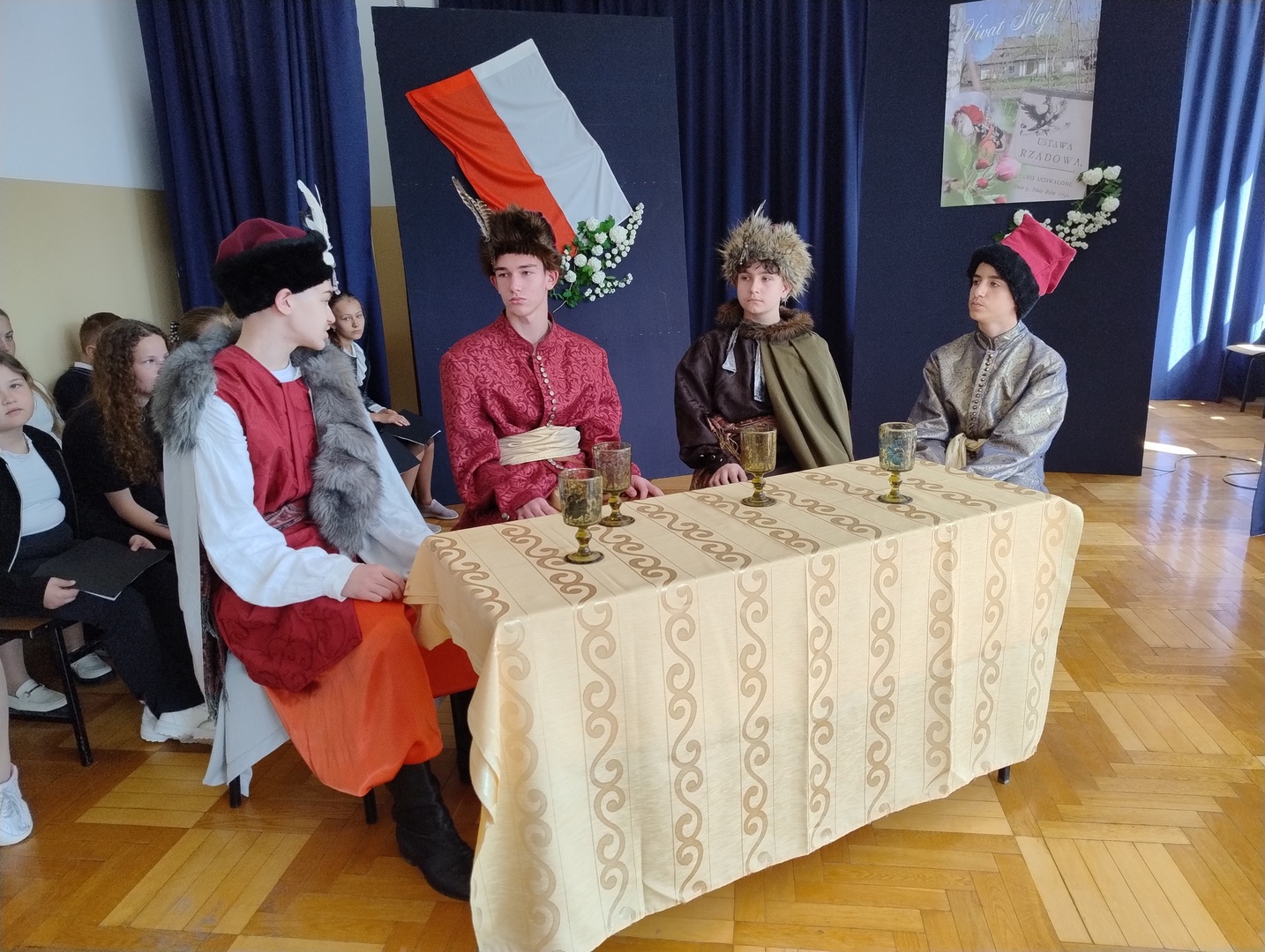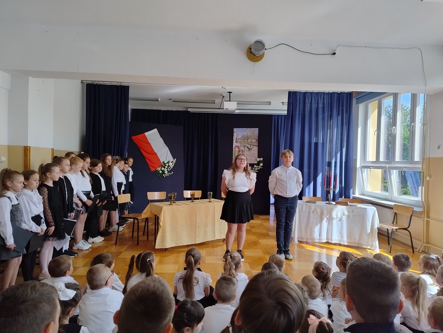 Dnia 8 maja 2024r. w naszej szkole odbyła się Akademia z okazji rocznicy uchwalenia Konstytucji 3 Maja. W uroczystości wzięła udział cała społeczność szkolna – uczniowie, nauczyciele oraz pracownicy administracji. Akademia ta była wyjątkowa, zarówno ze względu na tak ważną, dla nas, Polaków, rocznicę, ale także ze względu na sposób, w jaki została przedstawiona. Uroczystość rozpoczęliśmy od odśpiewania hymnu państwowego. Aktorzy występowali w strojach imitujących te, które były noszone w XVIII i XIX wieku. Scena, również była przystrojona jak za dawnych czasów. Przyglądaliśmy się rozmowie mamy z dwoma synkami, która odbyła się pod koniec XIX wieku. Chłopcy byli bardzo ciekawi, dlaczego ich ojczyzny nie ma na mapach Europy i jak do tego doszło. Aby wyjaśnić dzieciom, okoliczności, które sprawiły, że Polska zniknęła z map, mama zastosowała retrospekcję. Po drugiej stronie sceny mogliśmy zobaczyć czterech szlachciców, pochodzących z XVIII wieku, którzy rozmawiali o królu, jego panowaniu oraz potrzebie reform. Mogliśmy też zauważyć, że nie wszyscy szlachcice chcieli zmian. Następnie pojawiły się mieszczki, które spieszyły się, aby zobaczyć, czy udało się przyjąć nową ustawę rządową oraz mówiły o podstępie wymyślonym przez króla, by tak się stało. Potem na scenie pojawił się Marszałek, który przeczytał ludowi Warszawy treść Konstytucji. Uroczystość wzbogaciły wiersze oraz śpiew szkolnego zespołu wokalnego, przygotowanego przez Panią Annę Bieniasz-Markowicz. W akademii brali udział uczniowie klasy IV, V oraz VII, nad którymi opiekę sprawowały Pani Sabina Cieślak oraz Pani Joanna Hołowaty. Wszyscy obecni na tym wydarzeniu, byli zachwyceni. Pamiętajmy, aby cieszyć się naszą wolną ojczyzną oraz pamiętać o tych, którzy przyczynili się do jej wyzwolenia.
