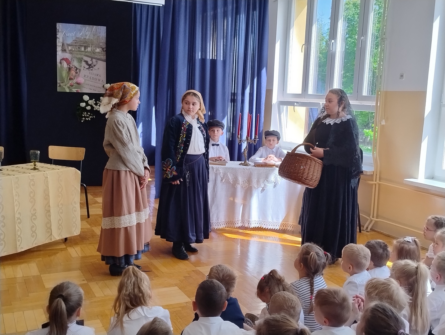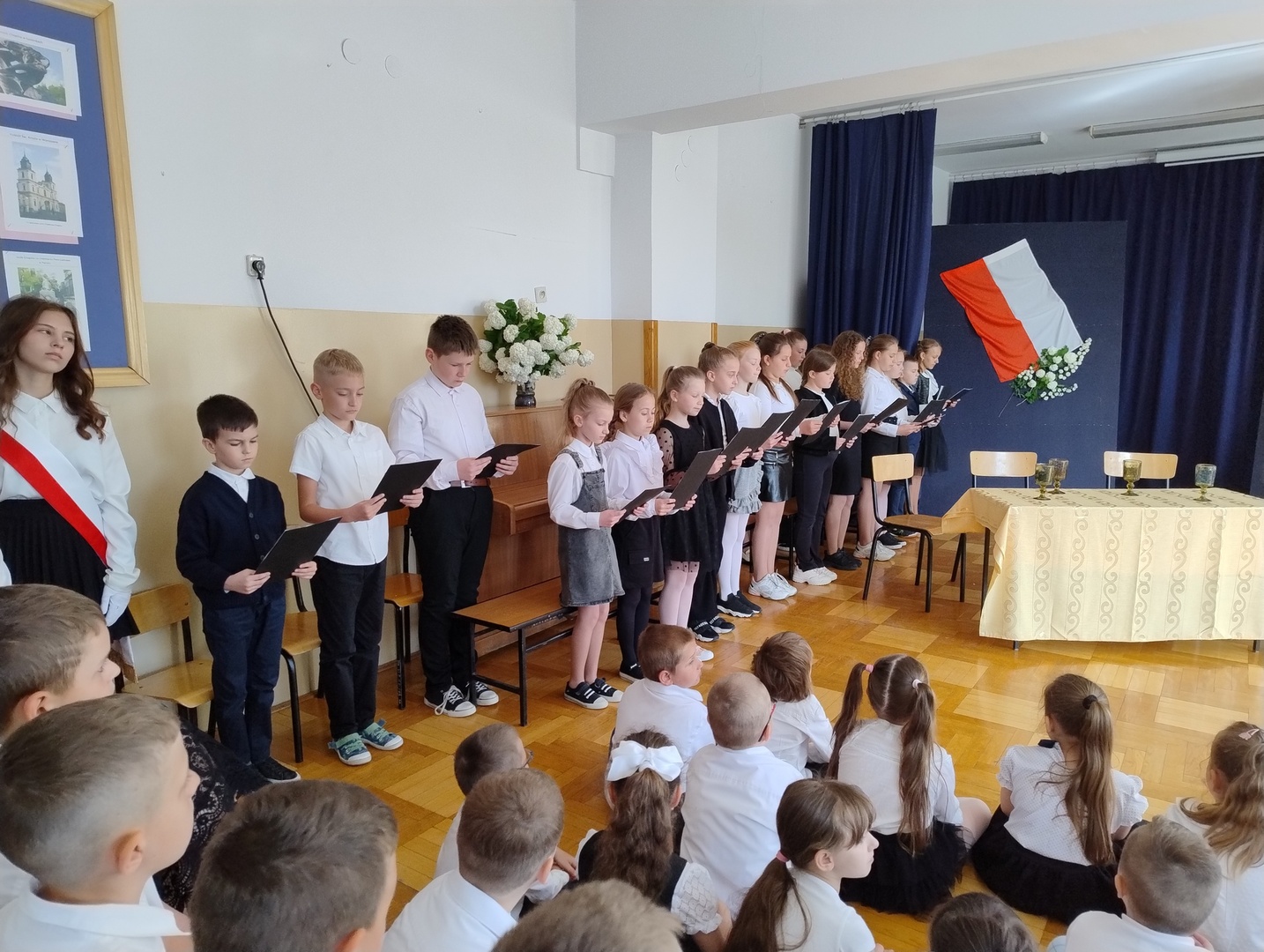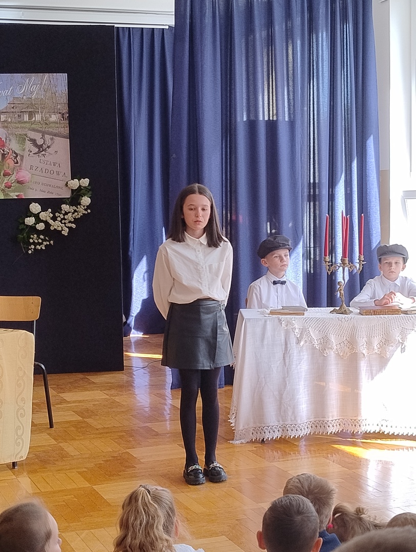 Dnia 8 maja 2024r. w naszej szkole odbyła się Akademia z okazji rocznicy uchwalenia Konstytucji 3 Maja. W uroczystości wzięła udział cała społeczność szkolna – uczniowie, nauczyciele oraz pracownicy administracji. Akademia ta była wyjątkowa, zarówno ze względu na tak ważną, dla nas, Polaków, rocznicę, ale także ze względu na sposób, w jaki została przedstawiona. Uroczystość rozpoczęliśmy od odśpiewania hymnu państwowego. Aktorzy występowali w strojach imitujących te, które były noszone w XVIII i XIX wieku. Scena, również była przystrojona jak za dawnych czasów. Przyglądaliśmy się rozmowie mamy z dwoma synkami, która odbyła się pod koniec XIX wieku. Chłopcy byli bardzo ciekawi, dlaczego ich ojczyzny nie ma na mapach Europy i jak do tego doszło. Aby wyjaśnić dzieciom, okoliczności, które sprawiły, że Polska zniknęła z map, mama zastosowała retrospekcję. Po drugiej stronie sceny mogliśmy zobaczyć czterech szlachciców, pochodzących z XVIII wieku, którzy rozmawiali o królu, jego panowaniu oraz potrzebie reform. Mogliśmy też zauważyć, że nie wszyscy szlachcice chcieli zmian. Następnie pojawiły się mieszczki, które spieszyły się, aby zobaczyć, czy udało się przyjąć nową ustawę rządową oraz mówiły o podstępie wymyślonym przez króla, by tak się stało. Potem na scenie pojawił się Marszałek, który przeczytał ludowi Warszawy treść Konstytucji. Uroczystość wzbogaciły wiersze oraz śpiew szkolnego zespołu wokalnego, przygotowanego przez Panią Annę Bieniasz-Markowicz. W akademii brali udział uczniowie klasy IV, V oraz VII, nad którymi opiekę sprawowały Pani Sabina Cieślak oraz Pani Joanna Hołowaty. Wszyscy obecni na tym wydarzeniu, byli zachwyceni. Pamiętajmy, aby cieszyć się naszą wolną ojczyzną oraz pamiętać o tych, którzy przyczynili się do jej wyzwolenia.