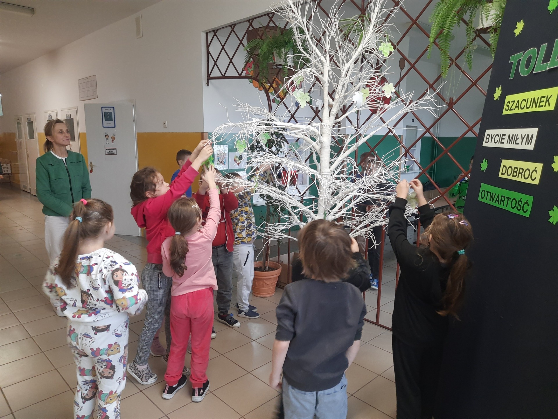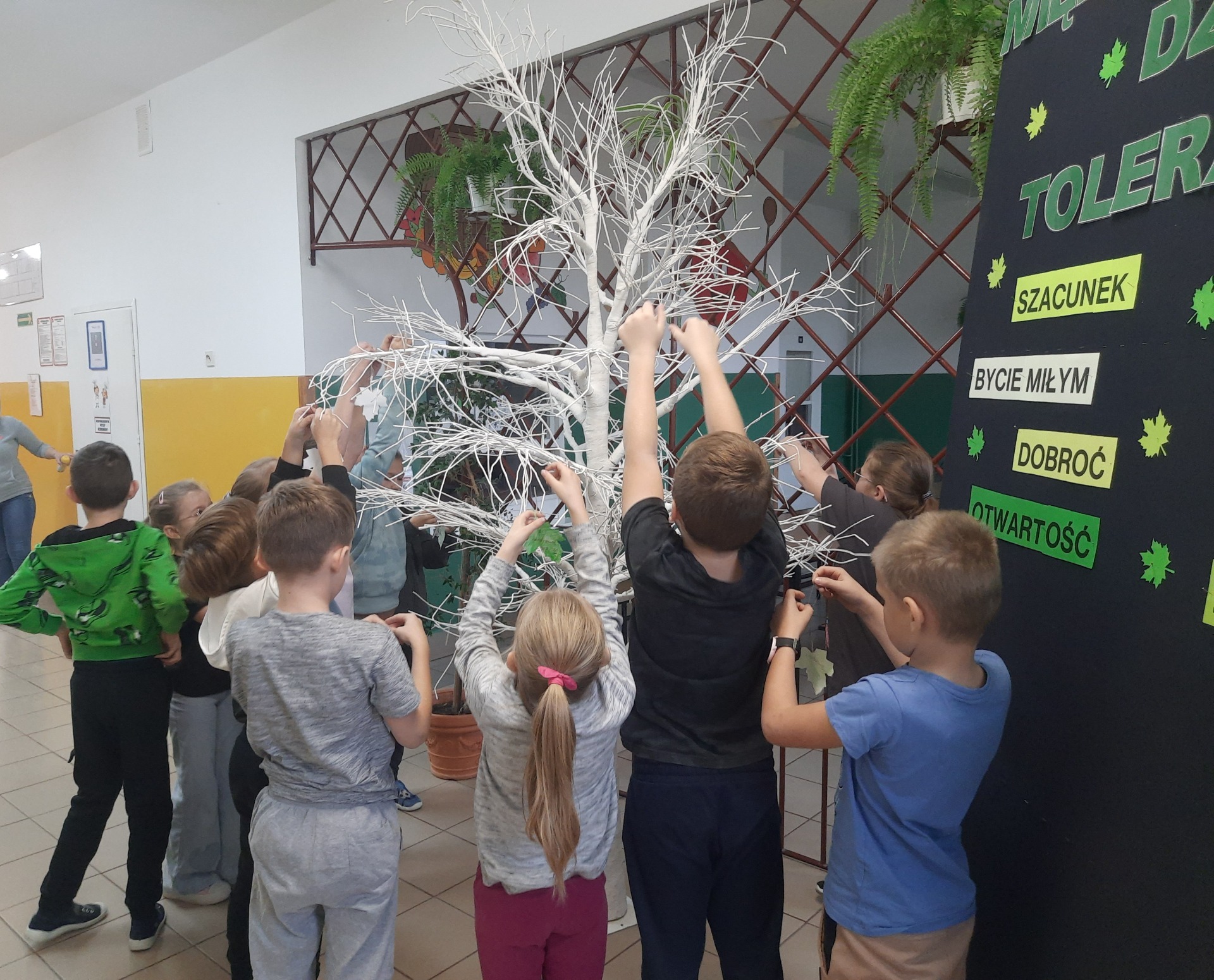 20 listopada obchodziliśmy w naszej szkole Dzień Tolerancji 🍀. Dzień ten stał się okazją do refleksji nad własną postawą w odniesieniu do innych osób – kolegów, koleżanek. Uczniowie klas młodszych wspólnymi siłami stworzyli "Drzewo Tolerancji" 🌳, wpisując na listki hasła kojarzące się im z tolerancją. Starsi uczniowie zebrali się razem w sali i wzięli udział w krótkiej pogadance, której celem było przypomnienie uczniom czym jest tolerancja.