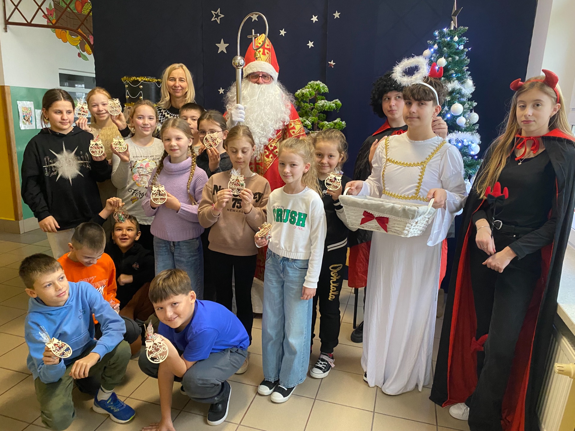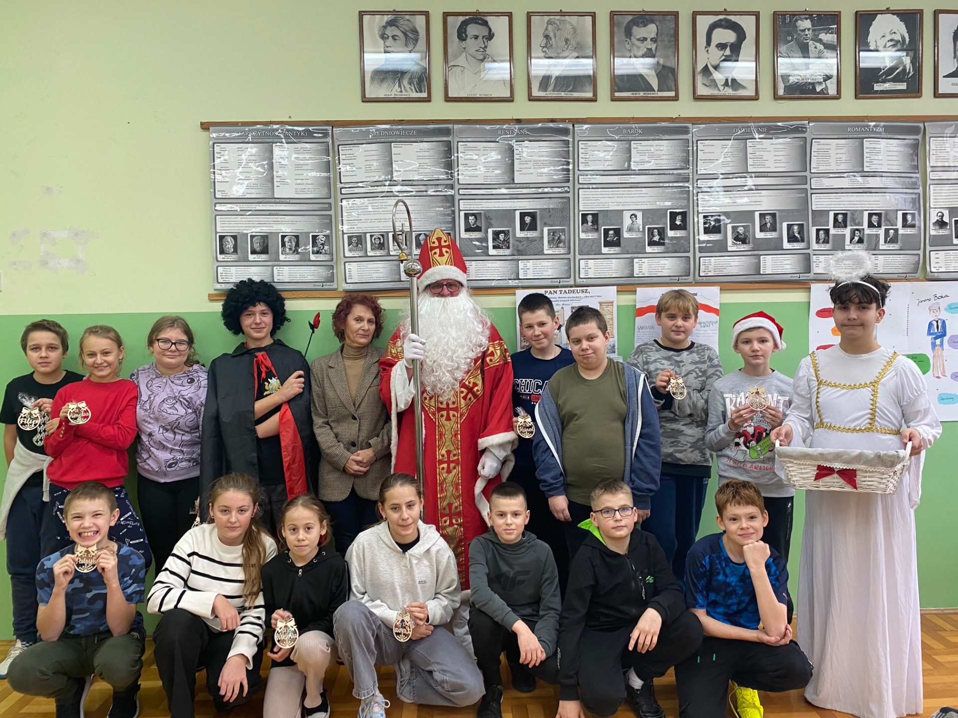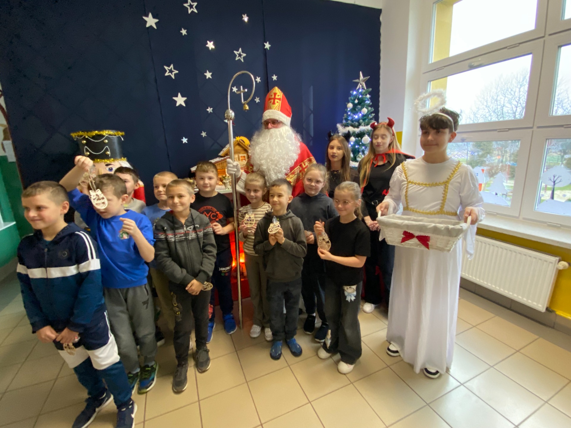 Dnia 5 grudnia do naszej szkoły przyszedł najbardziej wyczekiwany przez dzieci gość - Święty Mikołaj. Wraz ze swoimi pomocnikami z klasy VIII przyniósł wszystkim uczniom oraz pracownikom szkoły drobny upominek. Widocznie w tym roku byliśmy wyjątkowo grzeczni! Młodsze klasy przywitały przybysza pięknymi śpiewami. Odwiedziny te umiliły nam czas i sprawiły, że zapamiętamy ten dzień na długo.
