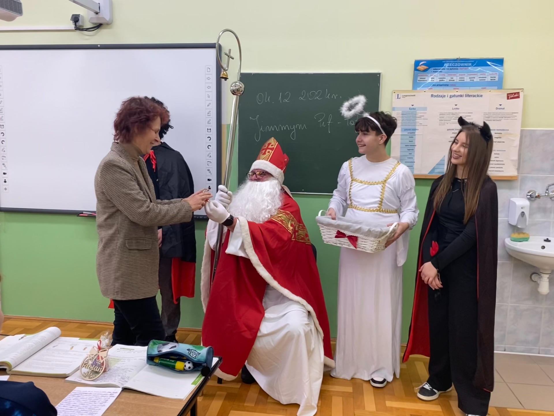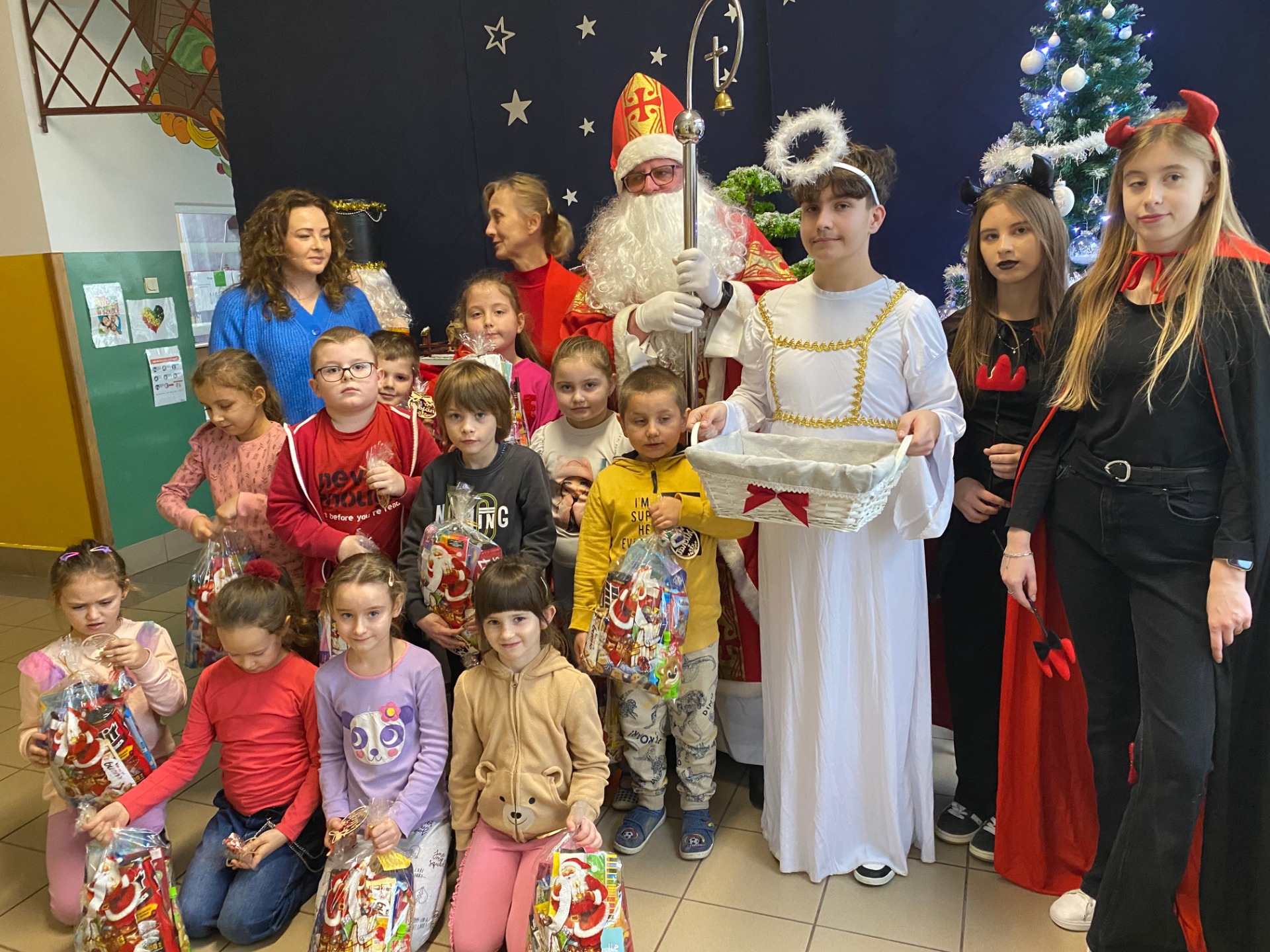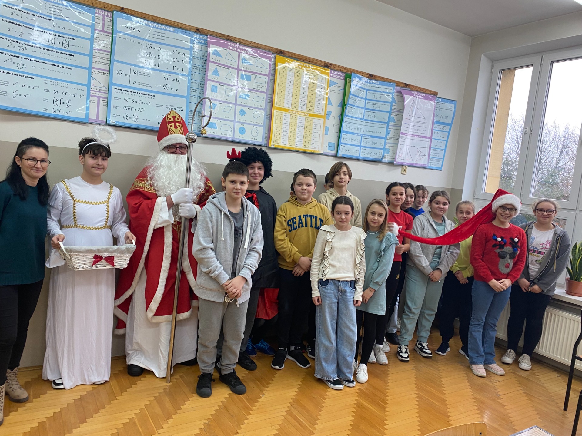 Dnia 5 grudnia do naszej szkoły przyszedł najbardziej wyczekiwany przez dzieci gość - Święty Mikołaj. Wraz ze swoimi pomocnikami z klasy VIII przyniósł wszystkim uczniom oraz pracownikom szkoły drobny upominek. Widocznie w tym roku byliśmy wyjątkowo grzeczni! Młodsze klasy przywitały przybysza pięknymi śpiewami. Odwiedziny te umiliły nam czas i sprawiły, że zapamiętamy ten dzień na długo.