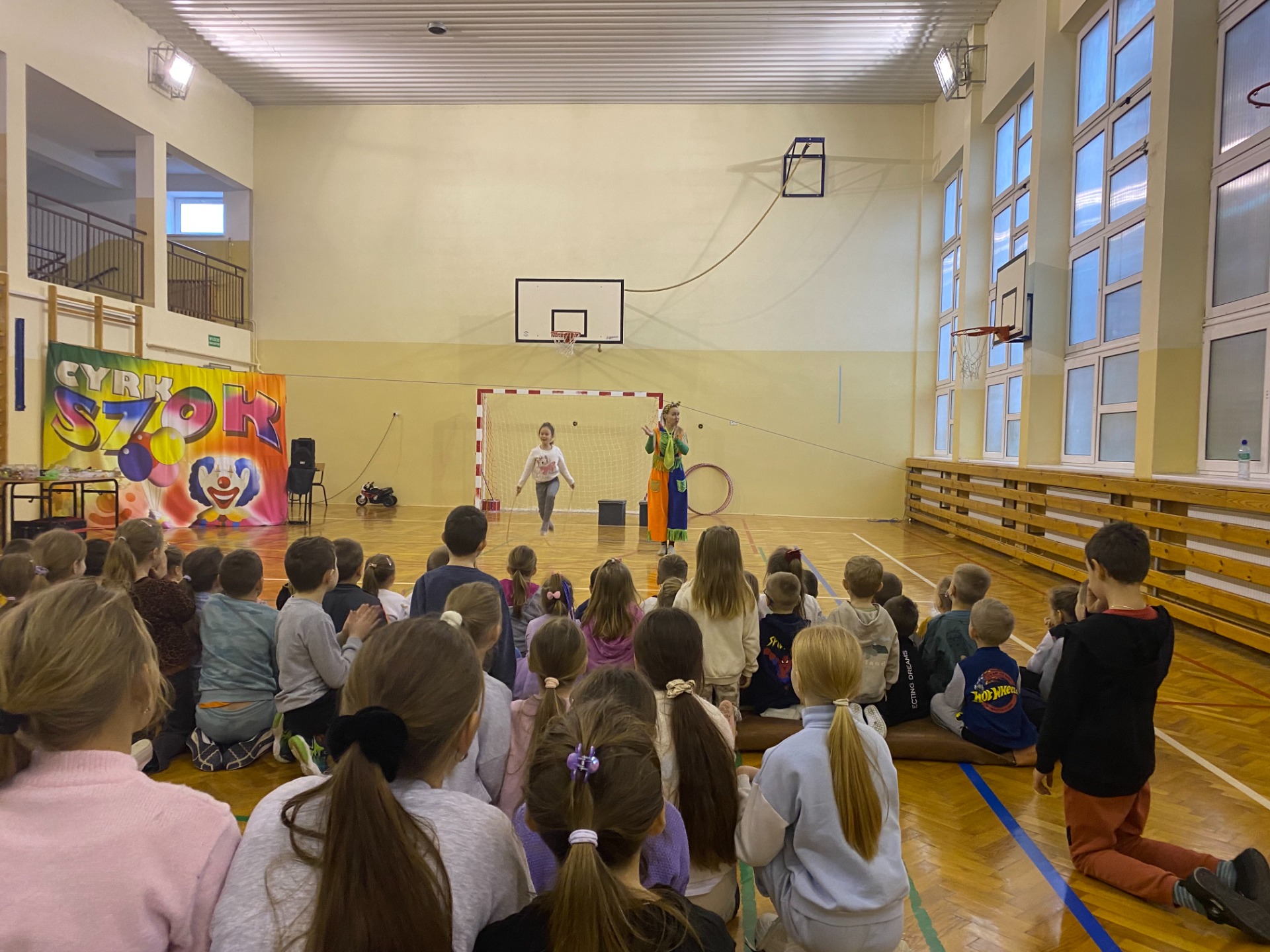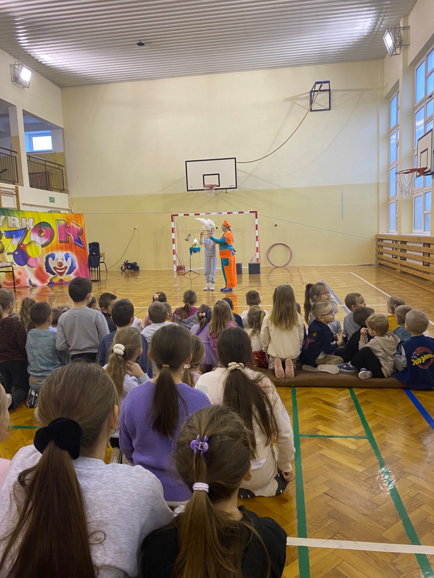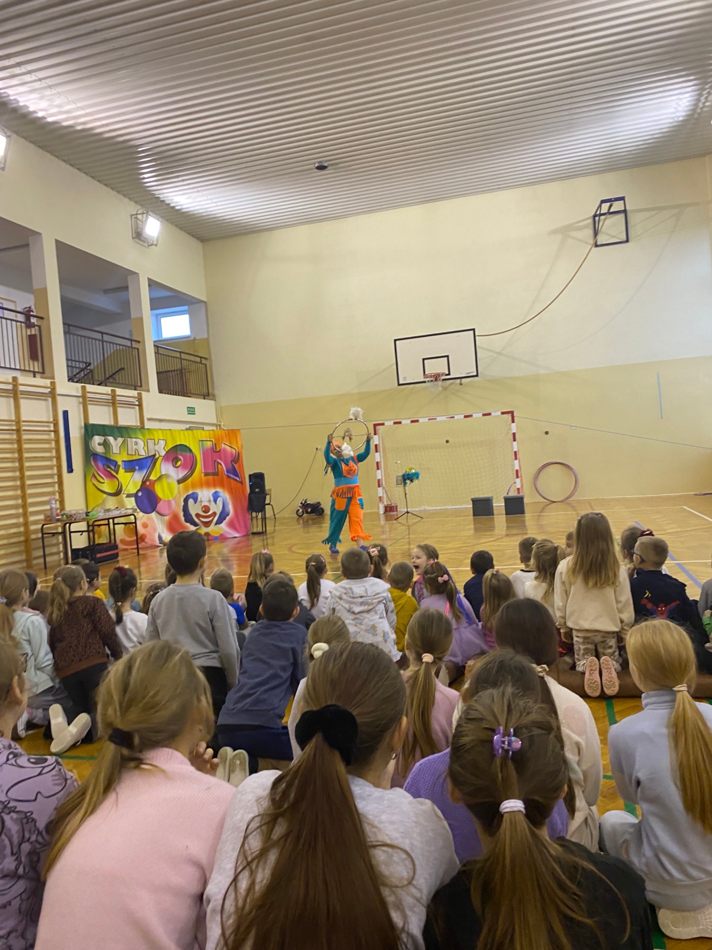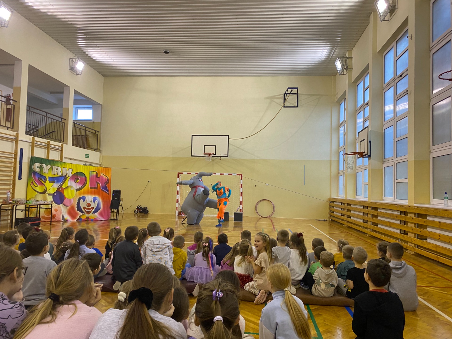 Dnia 9 grudnia 2024r. w naszej szkole gościliśmy cyrk ,,Szok”. Uczniowie naszej szkoły – od najmłodszych po najstarszych – wraz z gronem pedagogicznym obserwowali występy artystyczne. Najpierw na scenie pojawił się słoń, który wykonywał sztuczki z obręczami. Następnie do występu zostali zaproszeni nasi nauczyciele, którzy mieli okazję sprawdzić swoją sprawność fizyczną. Później widzieliśmy zmagania dwóch artystek, zaprezentowano pokaz z ptakami oraz pieskami. Na koniec na scenie pojawił się ogromny, tańczący miś. Wszyscy wróciliśmy na lekcje w dobrych humorach.