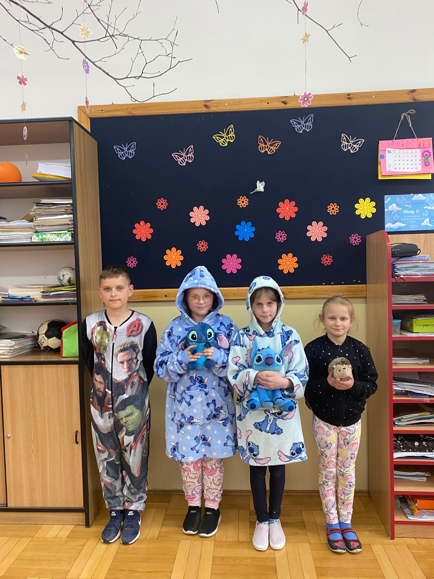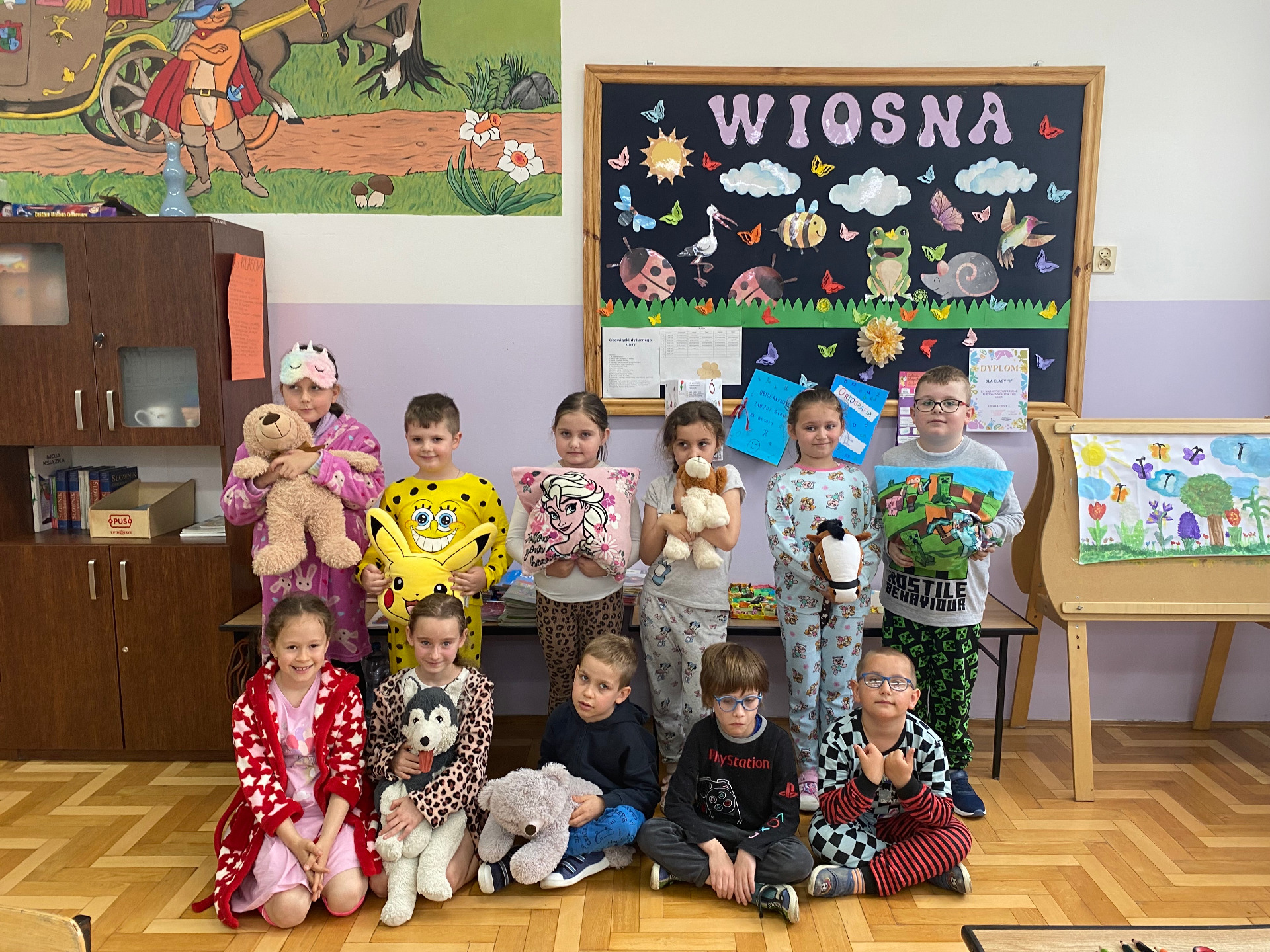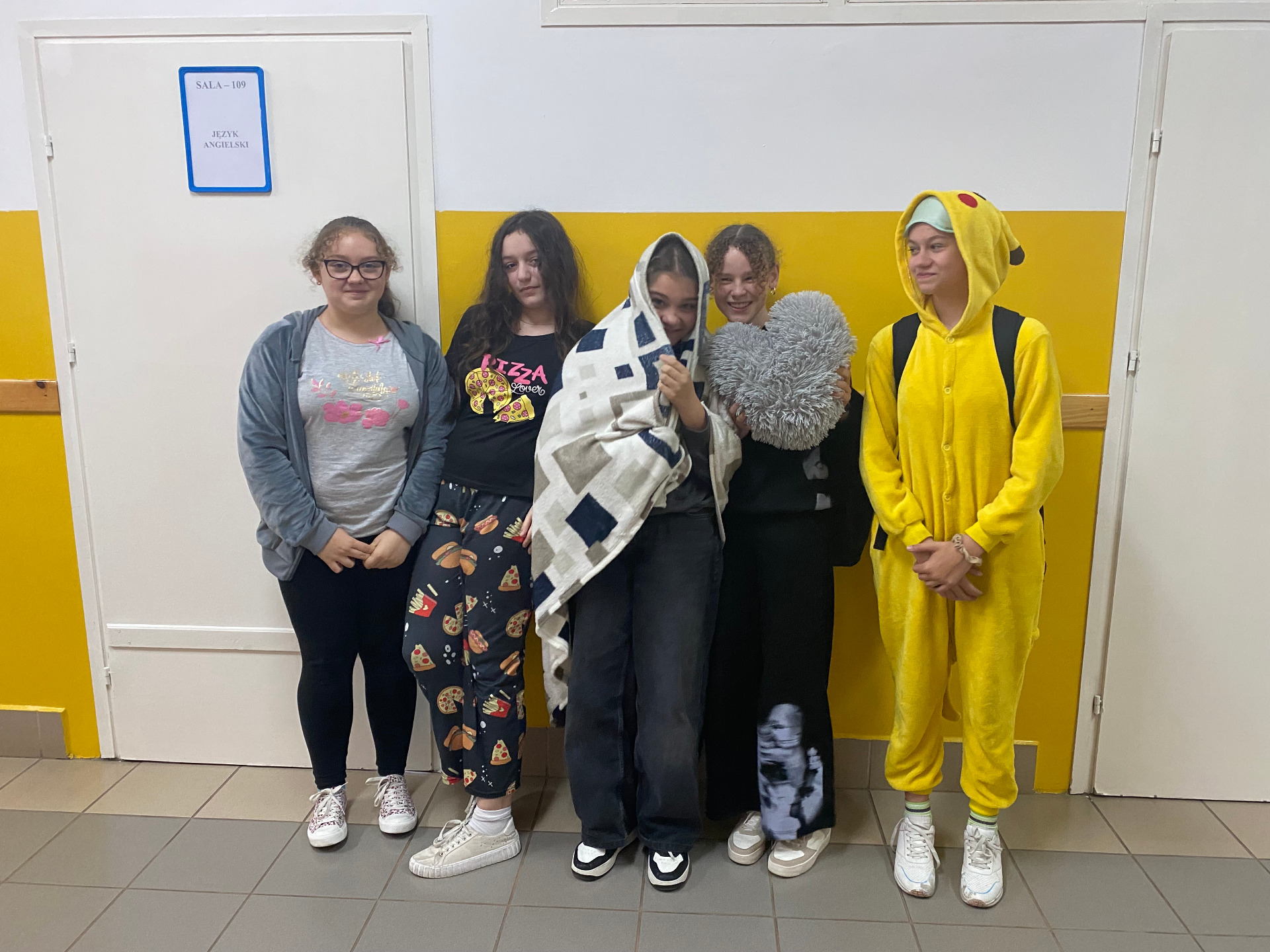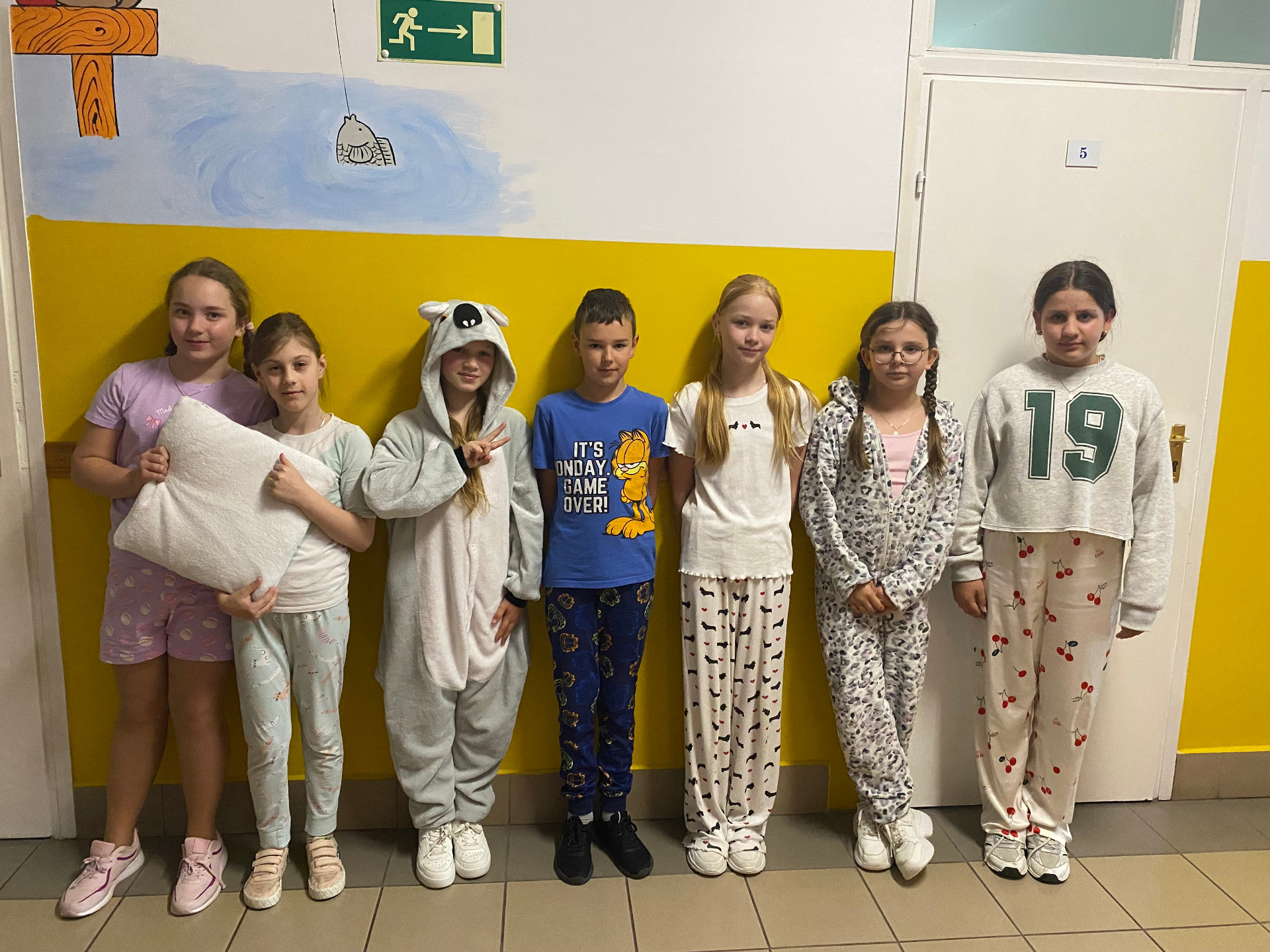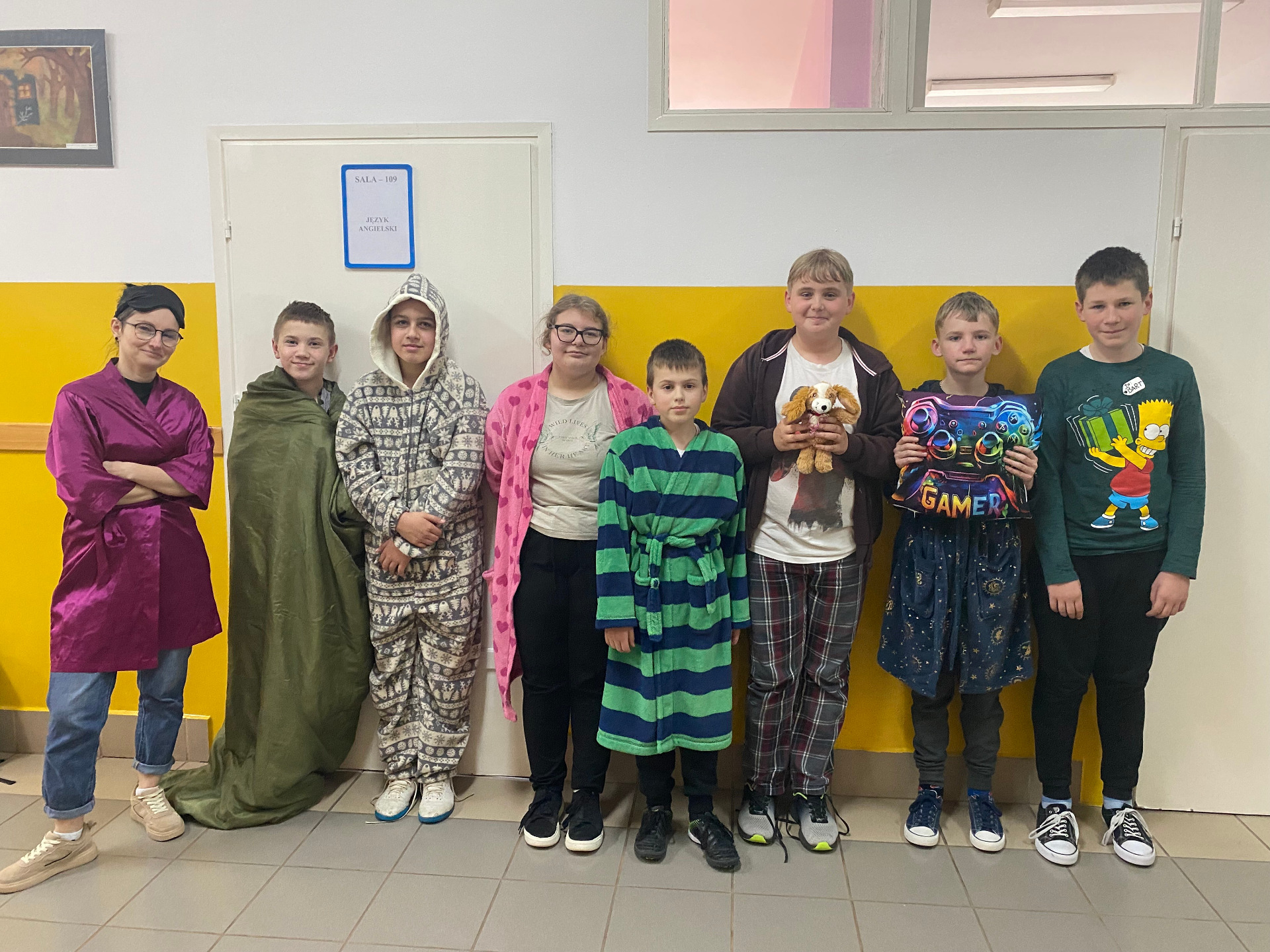 Dnia 29 maja 2025r. w naszej szkole odbył się Dzień Piżamy. Był to czas, w którym wspieraliśmy dzieci ciężko chore, dla których piżama to nieodłączna część każdego dnia. Cała społeczność szkolna – od najmłodszych do najstarszych miała za zadanie przyjść w swojej ulubionej piżamie lub przynieść koc czy poduszkę. Na korytarzach nie brakowało strojów piżamowych z różnymi postaciami z bajek.