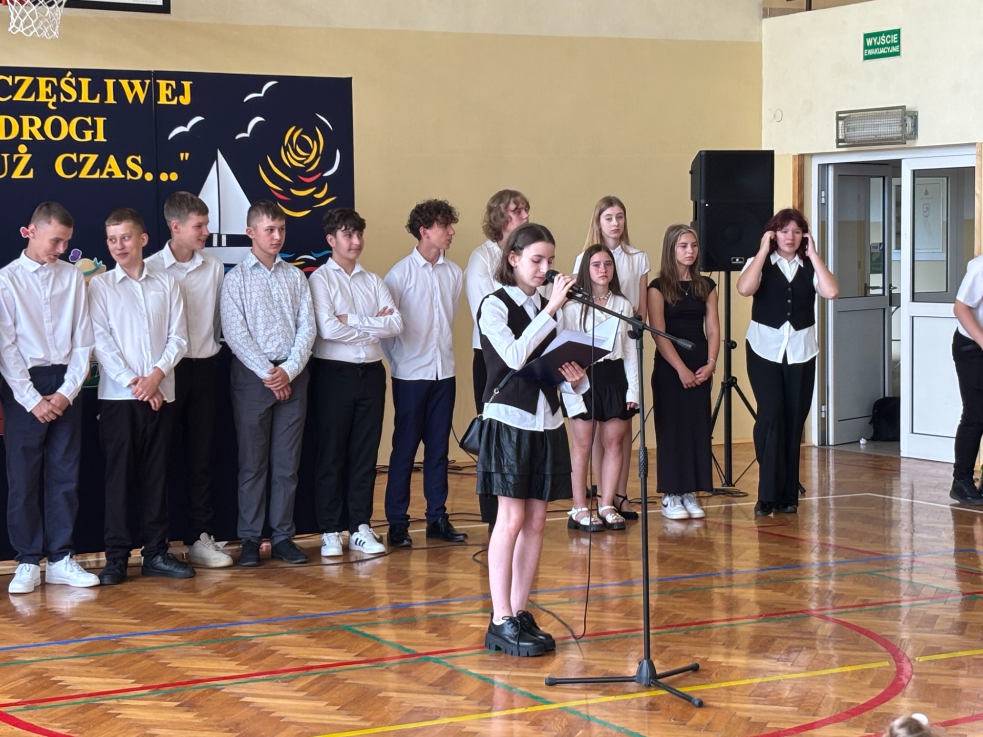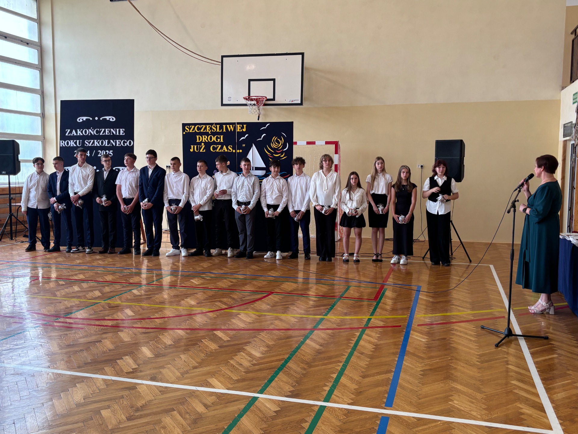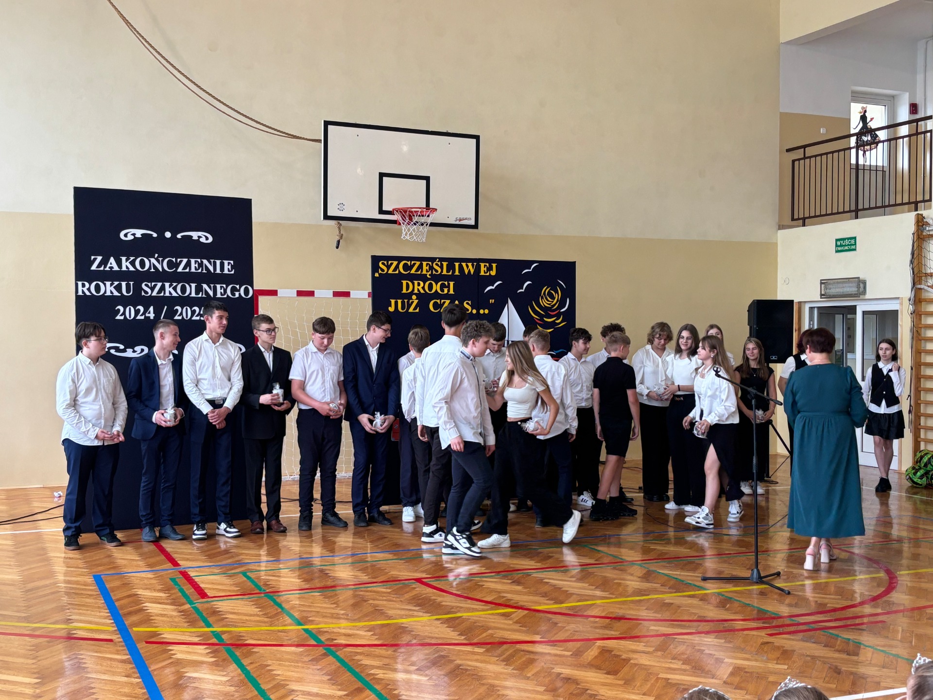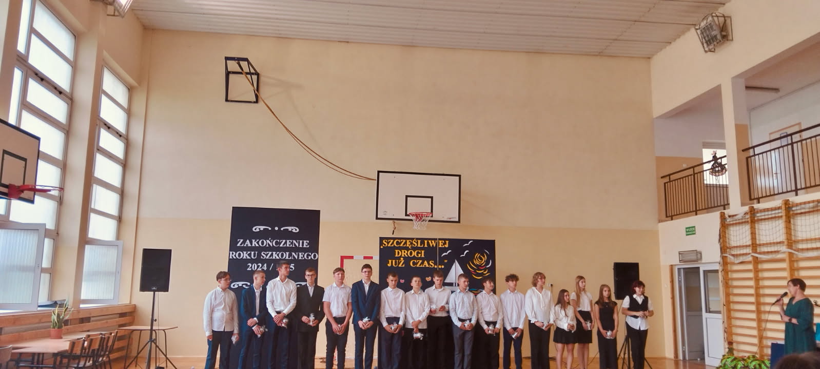 Dnia 27 czerwca 2025r. w naszej szkole odbyło się uroczyste zakończenie roku szkolnego 2024/2025. Cała społeczność szkolna na czele z pocztem sztandarowym wybrała się najpierw na Mszę Świętą do Kościoła. Później wszyscy – uczniowie, pracownicy naszej szkoły oraz rodzice udali się na salę gimnastyczną, gdzie nastąpiła ceremonia przekazania Sztandaru Szkoły i ślubowanie. Następnie przyszedł czas na część artystyczną przygotowaną przez klasę 8 oraz zerówkę. Po humorystycznym przedstawieniu i wręczeniu nauczycielom podziękowań przyszedł długo wyczekiwany moment pożegnania naszych absolwentów. Pani Dyrektor rozdała nagrody za wysokie wyniki w nauce oraz osiągnięcia. Podziękowania zostały złożone również rodzicom. Po zakończeniu akademii wszyscy uczniowie udali się ze swoimi wychowawcami do klas, gdzie zostały wręczone im świadectwa. Następnie podzielili się swoimi planami na wakacje, pożegnali się i opuścili mury tej szkoły.