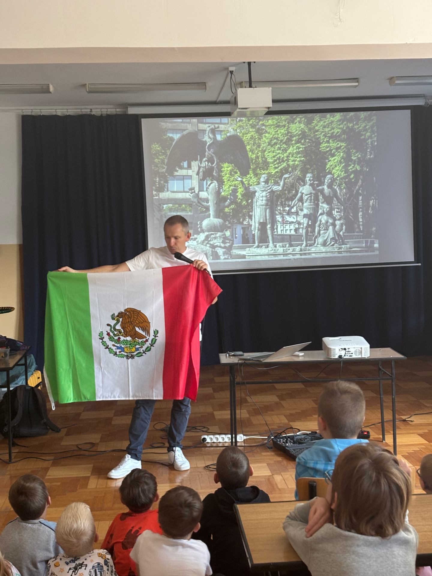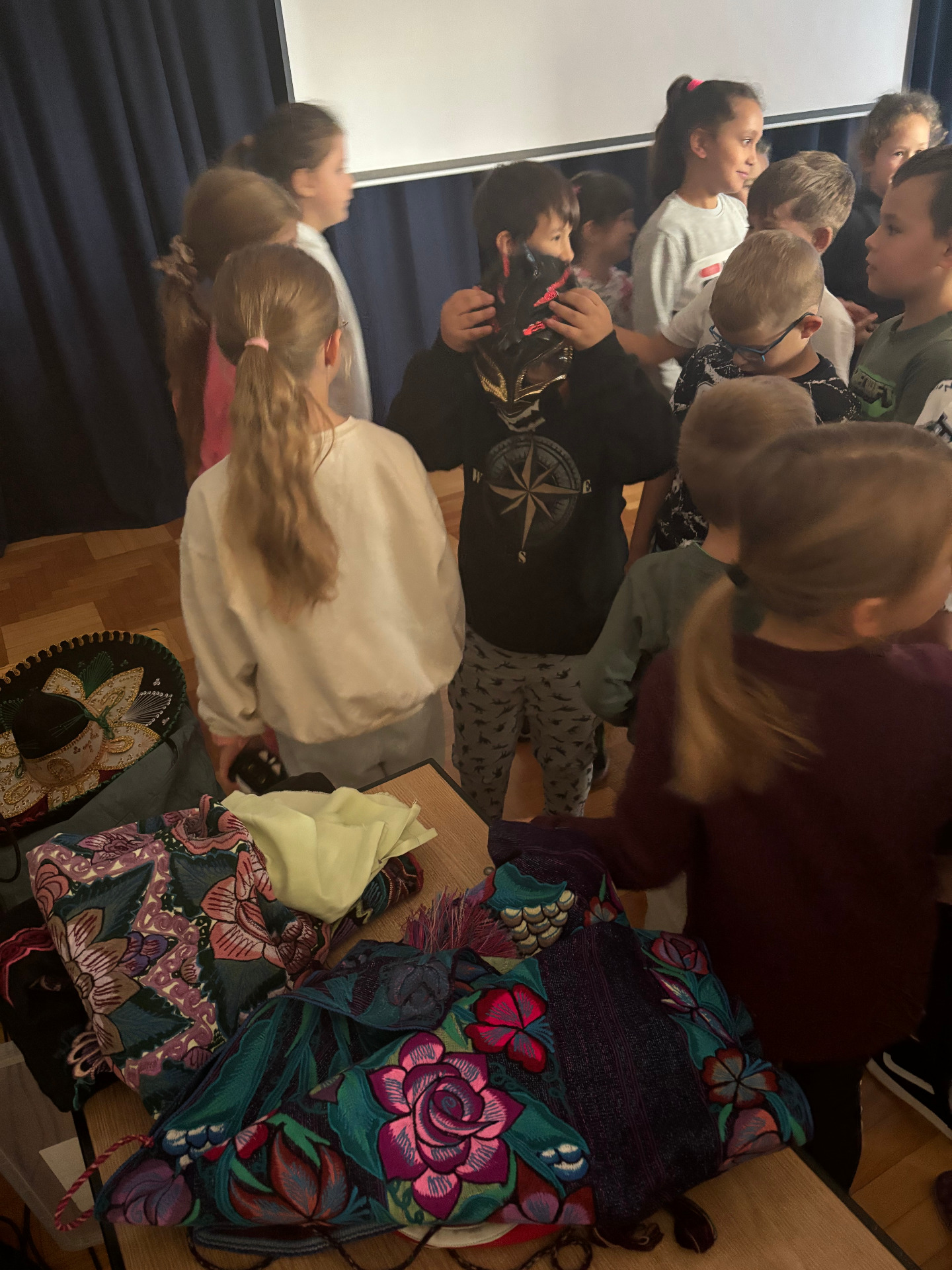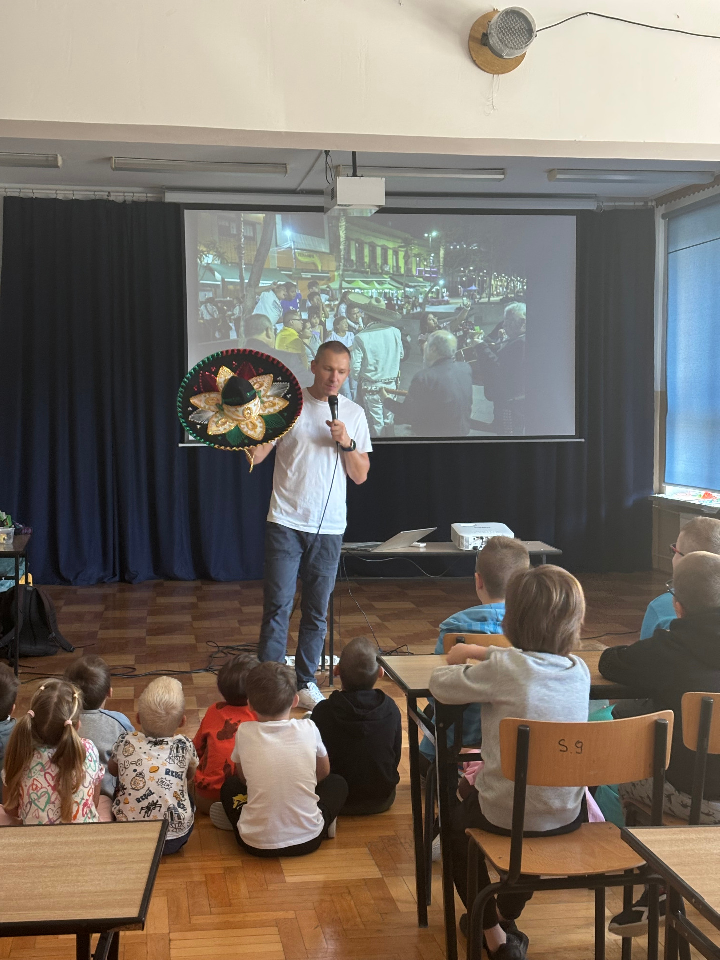 Pan Grzegorz opowiadał o codziennym życiu mieszkańców Meksyku – potomków starożytnych Majów i Azteków, o wyjątkowych świętach obchodzonych w zupełnie inny sposób niż w Polsce, takich jak Día de los Muertos (Dzień Zmarłych), którego symbolem są kolorowe czaszki.